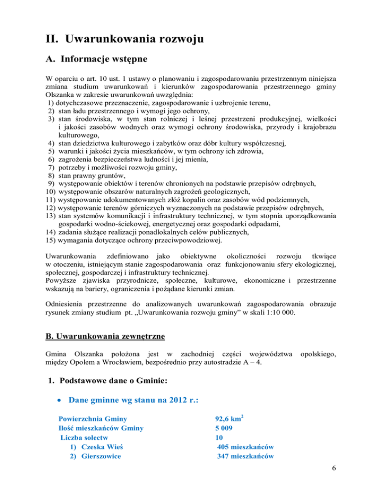 II. Uwarunkowania rozwoju A. Informacje wstępne W oparciu o art. 10 ust. 1 ustawy o planowaniu i zagospodarowaniu przestrzennym niniejsza zmiana studium uwarunkowań i kierunków zagospodarowania przestrzennego gminy Olszanka w zakresie uwarunkowań uwzględnia: 1) dotychczasowe przeznaczenie, zagospodarowanie i uzbrojenie terenu, 2) stan ładu przestrzennego i wymogi jego ochrony, 3) stan środowiska, w tym stan rolniczej i leśnej przestrzeni produkcyjnej, wielkości i jakości zasobów wodnych oraz wymogi ochrony środowiska, przyrody i krajobrazu kulturowego, 4) stan dziedzictwa kulturowego i zabytków oraz dóbr kultury współczesnej, 5) warunki i jakości życia mieszkańców, w tym ochrony ich zdrowia, 6) zagrożenia bezpieczeństwa ludności i jej mienia, 7) potrzeby i możliwości rozwoju gminy, 8) stan prawny gruntów, 9) występowanie obiektów i terenów chronionych na podstawie przepisów odrębnych, 10) występowanie obszarów naturalnych zagrożeń geologicznych, 11) występowanie udokumentowanych złóż kopalin oraz zasobów wód podziemnych, 12) występowanie terenów górniczych wyznaczonych na podstawie przepisów odrębnych, 13) stan systemów komunikacji i infrastruktury technicznej, w tym stopnia uporządkowania gospodarki wodno-ściekowej, energetycznej oraz gospodarki odpadami, 14) zadania służące realizacji ponadlokalnych celów publicznych, 15) wymagania dotyczące ochrony przeciwpowodziowej. Uwarunkowania zdefiniowano jako obiektywne okoliczności rozwoju tkwiące w otoczeniu, istniejącym stanie zagospodarowania oraz funkcjonowaniu sfery ekologicznej, społecznej, gospodarczej i infrastruktury technicznej. Powyższe zjawiska przyrodnicze, społeczne, kulturowe, ekonomiczne i przestrzenne wskazują na bariery, ograniczenia i pożądane kierunki zmian. Odniesienia przestrzenne do analizowanych uwarunkowań zagospodarowania obrazuje rysunek zmiany studium pt. „Uwarunkowania rozwoju gminy” w skali 1:10 000. B. Uwarunkowania zewnętrzne Gmina Olszanka położona jest w zachodniej części województwa między Opolem a Wrocławiem, bezpośrednio przy autostradzie A – 4. opolskiego, 1. Podstawowe dane o Gminie: Dane gminne wg stanu na 2012 r.: Powierzchnia Gminy Ilość mieszkańców Gminy Liczba sołectw 1) Czeska Wieś 2) Gierszowice 92,6 km2 5 009 10 405 mieszkańców 347 mieszkańców 6 3) Jankowice Wielkie 4) Janów 5) Krzyżowice 6) Michałów 7) Obórki 8) Olszanka 9) Pogorzela 10) Przylesie 782 mieszkańców 299 mieszkańców 557 mieszkańców 495 mieszkańców 311 mieszkańców 471 mieszkańców 567 mieszkańców 775 mieszkańców Gmina Olszanka jest wspólnotą samorządową, którą tworzą mieszkańcy, zamieszkujący środkowozachodnią część województwa opolskiego o powierzchni 92,6 km2 tj. 0,9 % powierzchni województwa. Południowo – wschodnia część gminy położona jest w obrębie korytarza ekologicznego doliny Nysy Kłodzkiej. Pozostała część gminy dzięki dwóm korytarzom ekologicznym – Doliny Pępickiego Potoku i Doliny Przyleskiego Potoku, posiada powiązania z węzłowym obszarem europejskim jakim jest Dolina środkowej Odry. Od strony północnej gmina graniczy z gminą Brzeg i Skarbimierz, od wschodu z gminą Lewin Brzeski, od południowego wschodu z gminą Niemodlin, od południa z gminą Grodków i Niemodlin, a od zachodu z gminą Grodków i Wiązów w województwie dolnośląskim. wg GUS wg stanu na 31 XII 2011 r.: (wg danych GUS powierzchnia gminy wynosi 9276 ha, natomiast wg danych gminy 9260 ha) Podział terytorialny Miejscowości wiejskie Sołectwa Powierzchnia jedn. jedn. ha 10 10 9276 osoba osoba osoba % osoba % osoba % osoba na 1000 ludności na 1000 ludności na 1000 ludności na 1000 5011 54 1010 20,2 3198 63,8 803 16,0 99 55 Ludność Ludność faktycznie zamieszkała Ludność na 1 km2 W wieku przedprodukcyjnym (17 lat i mniej) W wieku produkcyjnym W wieku poprodukcyjnym Kobiety na 100 mężczyzn Zgony Przyrost naturalny Urodzenia żywe Małżeństwa 11,0 -2 -0,4 53 10,6 35 7,0 7 ludności Bezrobotni Ogółem Mężczyźni Kobiety osoba 323 osoba 140 osoba 183 Budownictwo mieszkaniowe (oddane do użytkowania) Budynki mieszkalne bud. 12 Mieszkania miesz. 12 Izby izba 66 Powierzchnia użytkowa mieszkań m2 1844 Gospodarka komunalna % Korzystający z wodociągu 96,8 ludności % Korzystający z kanalizacji 59,2 ludności % Korzystający z gazociągu 0,0 ludności Zużycie wody z wodociągów w gospodarstwach domowych m3 27,0 w miastach na 1 mieszkańca Zużycie energii elektrycznej w gospodarstwach domowych kWh 0,0 w miastach na 1 mieszkańca Zużycie gazu z sieci w gospodarstwach domowych na m3 0,0 1 mieszkańca Szkolnictwo i wychowanie przedszkolne Wsp. solaryzacji brutto - szkoły podstawowe % 97,52 Wsp. solaryzacji brutto - szkoły gimnazjalne % 70,86 Szkoły podstawowe ob. 4 Uczniowie osoba 275 Absolwenci osoba 50 Szkoły gimnazjalne ob. 1 Uczniowie osoba 124 Absolwenci osoba 43 Przedszkola ob. 5 Miejsca msc 170 Dzieci osoba 158 Turystyka Hotele ob. Pensjonaty ob. Miejsca noclegowe miejsce Korzystający z noclegów osoba Udzielone noclegi nocleg Biblioteki Biblioteki i filie ob. 5 Czytelnicy w ciągu roku osoba 631 Czytelnicy bibliotek publicznych na 1000 ludności osoba 126 Podmioty gospodarcze jedn. gosp. Ogółem 339 jedn. gosp. Sektor publiczny 20 8 jedn. gosp. Sektor prywatny jedn. gosp. Sekcja A - Rolnictwo, łowiectwo i leśnictwo jedn. gosp. Sekcja C - Przetwórstwo przemysłowe Sekcja E – Dostawa wody, gospodarowanie ściekami i jedn. gosp. odpadami oraz działalność związana z rekultywacją jedn. gosp. Sekcja F - Budownictwo Sekcja G - Handel hurtowy i detaliczny; naprawa pojazdów jedn. gosp. samochodowych włączając motocykle jedn. gosp. Sekcja H – Transport i gospodarka magazynowa Sekcja I – Działalność związana z zakwaterowaniem i jedn. gosp. usługami gastronomicznymi jedn. gosp. Sekcja J – Informacja i komunikacja jedn. gosp. Sekcja K – Działalność finansowa i ubezpi
