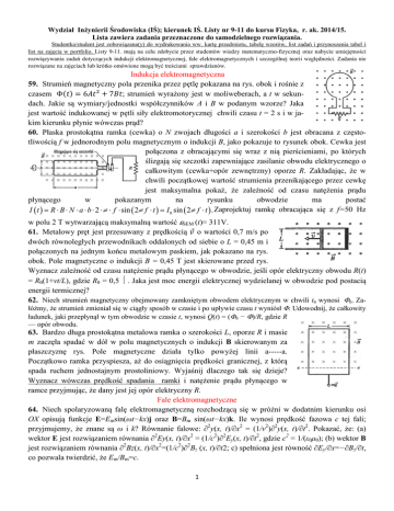 Wydział Inżynierii Środowiska (IŚ); kierunek IŚ. Listy nr 9-11 do kursu Fizyka, r. ak. 2014/15. Lista zawiera zadania przeznaczone do samodzielnego rozwiązania. Studentka/student jest zobowiązana(y) do wydrukowania ww. kartę przedmiotu, tabelę wzorów, list zadań i przynoszenia tabel i list na zajęcia w portfolio. Listy 9-11. mają na celu zdobycie przez studentów wiedzy matematyczno-fizycznej oraz nabycie umiejętności rozwiązywania zadań dotyczących indukcji elektromagnetycznej, fale elektromagnetycznych i szczególnej teorii względności. Zadania nie rozwiązane na zajęciach lub krótko omówione mogą być treściami sprawdzianów. Indukcja elektromagnetyczna 59. Strumień magnetyczny pola przenika przez pętlę pokazana na rys. obok i rośnie z =6 + 7 ; strumień wyrażony jest w moliweberach, a t w sekunczasem Φ dach. Jakie są wymiary/jednostki współczynników A i B w podanym wzorze? Jaka jest wartość indukowanej w pętli siły elektromotorycznej chwili czasu t = 2 s i w jakim kierunku płynie wówczas prąd? 60. Płaska prostokątna ramka (cewka) o N zwojach długości a i szerokości b jest obracana z częstotliwością f w jednorodnym polu magnetycznym o indukcji B, jako pokazuje to rysunek obok. Cewka jest połączona z obracającymi się wraz z nią pierścieniami, po których ślizgają się szczotki zapewniające zasilanie obwodu elektrycznego o całkowitym (cewka+opór zewnętrzny) oporze R. Zakładając, że w chwili początkowej wartość strumienia przenikającego przez cewkę jest maksymalna pokaż, że zależność od czasu natężenia prądu płynącego w pokazanym na rysunku obwodzie ma postać I ( t ) = R ⋅ B ⋅ N ⋅ a ⋅ b ⋅ 2 ⋅ π ⋅ f ⋅ sin ( 2π f ⋅ t ) = I 0 sin ( 2π f ⋅ t ) . Zaprojektuj ramkę obracająca się z f=50 Hz w polu 2 T wytwarzającą maksymalną wartość εSEM (t)= 311V. 61. Metalowy pręt jest przesuwany z prędkością o wartości 0,7 m/s po dwóch równoległych przewodnikach oddalonych od siebie o L = 0,45 m i połączonych na jednym końcu metalowym paskiem, jak pokazano na rys. obok. Pole magnetyczne o indukcji B = 0,45 T jest skierowane przed rys. Wyznacz zależność od czasu natężenie prądu płynącego w obwodzie, jeśli opór elektryczny obwodu R(t) = R0(1+vt/L), gdzie R0 = 0,5 Ω. Jaka jest moc energii elektrycznej wydzielanej w obwodzie pod postacią energii termicznej? 62. Niech strumień magnetyczny obejmowany zamkniętym obwodem elektrycznym w chwili t0 wynosi Φ0. Załóżmy, że strumień zmieniał się w ciągły sposób w czasie i po upływie czasu t wyniósł Φ. Udowodnij, że całkowity ładunek, jaki przepłynął w tym obwodzie w czasie t, wynosi Q(t) = (Φ0 − Φ)/R, gdzie R — opór obwodu. 63. Bardzo długa prostokątna metalowa ramka o szerokości L, oporze R i masie m zaczęła spadać w dół w polu magnetycznych o indukcji B skierowanym za płaszczyznę rys. Pole magnetyczne działa tylko powyżej linii a-----a. Początkowo ramka przyspiesza, aż do osiągnięcia prędkości granicznej, z którą spada ruchem jednostajnym prostoliniowy. Wyjaśnij dlaczego tak się dzieje? Wyznacz wówczas prędkość spadania ramki i natężenie prądu płynącego w ramce przyjmując, że dany jest jej opór elektryczny R. Fale elektromagnetyczne 64. Niech spolaryzowaną falę elektromagnetyczną rozchodzącą się w próżni w dodatnim kierunku osi OX opisują funkcje E=Emsin(ωt−kx)j oraz B=Bm sin(ωt−kx)k. Ile wynosi prędkość fazowa c tej fali; przyjmujemy, że znane są ω i k? Równanie falowe: ∂2y(x, t)/∂x2 = (1/v2)∂2y(x, t)/∂t2. Pokazać, że: (a) wektor E jest rozwiązaniem równania ∂2Ey(x, t)/∂x2 = (1/c2)∂2Ey(x, t)/∂t2, gdzie c2 = 1/(ε0µ0); (b) wektor B jest rozwiązaniem równania ∂2Bz(x, t)/∂x2=(1/c2)∂2Bz (x, t)/∂t2; c) spełniona jest równość ∂Ey/∂x=−∂Bz/∂t, co pozwala twierdzić, że Em/Bm=c. 1 65. Chwilowa gęstość energii u(x, t) fali elektromagnetycznej w próżni wynosi u(x, t) = ε0E2/2+B2/(2µ0). Korzystając ze związku E/B=c, pokaż, że u(x, t) = ε0E2. Czy jest prawdą, że w próżni gęstości energii pól elektrycznego i magnetycznego są sobie równe? Pokaż, że średnia wartość energii fali = elektromagnetycznej . d = = . Wektor Poyntinga definiuje wzór: S = (1/µ0)E×B=E×H. Pokaż, że: a) dla fali elektromagnetycznej z zadania 65. zachodzi równość |S| = ε0cE2 i |S| określa ilość energii przenoszonej przez falę w jednostce czasu przez jednostkę powierzchni ustawionej prostopadle do kierunku propagowania się fali; b) średnia wartość wektora Poyntinga, zwana intensywnością I fali, to ̅ = " = , $ , d = % = % & =' % = ' . O fali elektroma- gnetycznej z zadania 65. wiemy, że Em = 100V/m = 100N/C. Wyznaczyć: Bm, oraz I. 66. Fala elektromagnetyczna przenosi pęd. Padając prostopadle na powierzchnię wywiera na nią średnie *̅ *̅ + + ciśnienie równe (̅ = = , jeśli fala jest całkowicie pochłaniana lub (̅ = 2 = 2 , jeśli fala jest & & & & całkowicie odbijana. Płaska fala elektromagnetyczna o długości λ = 3 m rozchodzi się w próżni w dodatnim kierunku osi OX, a wektor natężenia jej pola elektrycznego ma kierunek osi OY i amplitudę 300 V/m. (a) Ile wynosi częstość ν tej fali? (b) Jaki jest kierunek i amplituda wektora indukcji pola magnetycznego tej fali? (c) Jakie są wartości k i ω, jeżeli E(x,t)=Emsin(kx − ωt)? (d) Ile wynosi uśredniona po czasie szybkość przepływu energii tej fali, czyli intensywność I (wyrażona w watach na metr kwadratowy)? e) Jakie ciśnienie wywiera ta fala padając prostopadle na czarną kartkę papieru o powierzchni 2m2? 67. a) Wzór ∆W/c =∆p określa związek między zmianą energii ∆W wywołaną pochłonięciem światła niosącego pęd ∆p. Statek kosmiczny o masie 1,5 · 103 kg dryfuje w przestrzeni kosmicznej i nie działa na niego żadna siła zewnętrzna. Astronauta włącza laser emitujący wiązkę promieniowania o mocy