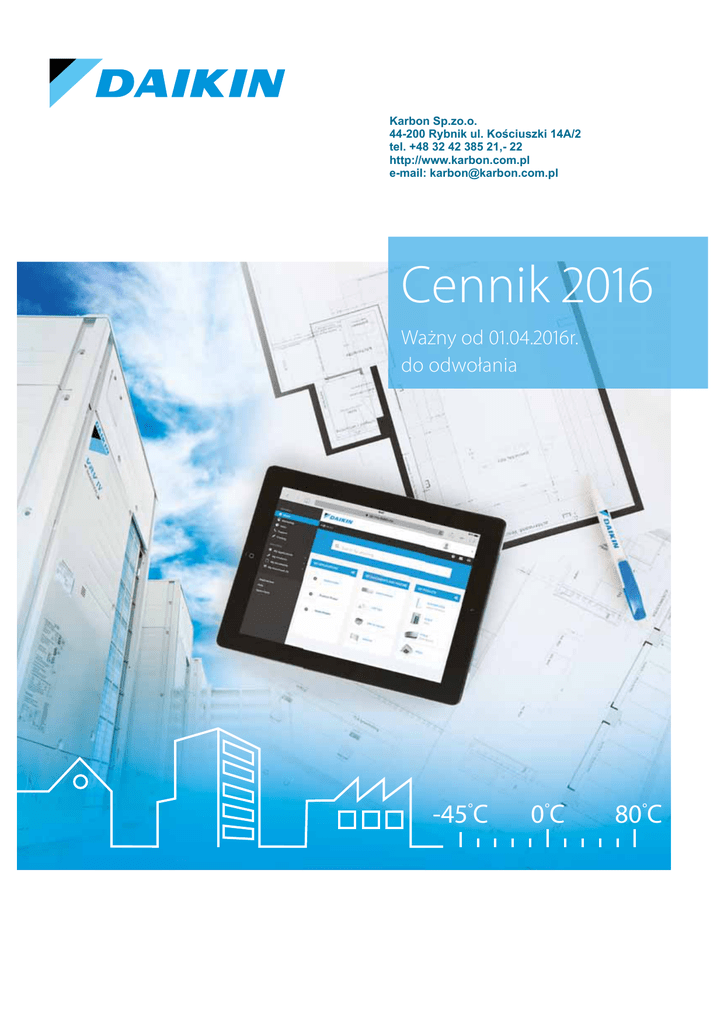 Karbon Sp.zo.o. 44-200 Rybnik ul. Kościuszki 14A/2 tel. +48 32 42 385 21,- 22 http://www.karbon.com.pl e-mail: [email protected] Cennik 2016 Ważny od 01.04.2016r. do odwołania -45°C 0°C 80°C Systemy solarne Daikin maksymalizują zastosowania słonecznej energii odnawialnej przez zastosowanie wysokosprawnych płaskich kolektorów płytowych. Termiczny system solarny Daikin jest dostępny w wersji drenażowej i ciśnieniowej i został zaprojektowany do pracy w połączeniu z pompami ciepła typu woda-powietrze Daikin Altherma dla uzyskania maksymalnej sprawności. Panele solarne posiadają aprobatę Solar Keymark i nadają się do domowych RHI. Drenażowy system solarny Ciśnieniowy system solarny > Drenażowy system solarny jest układem wymagającym niewielkiej obsługi i niepotrzebującym czynników chłodzących > Ciśnieniowy system solarny przesyła ciepło do niewentylowanego zbiornika poprzez specjalnie zaprojektowany zestaw wymienników ciepła. Pozwala to na ogrzanie całego zbiornika przez energię słoneczną > Składa się z bezciśnieniowego zasobnika ciepła, który może być łączony z pompami ciepła Daikin Altherma lub innym pomocniczym źródłem ciepła. > Woda w zasobniku jest pompowana do paneli słonecznych, podgrzewana i wraca celem stratyfikacji w zasobniku ciepła Daikin > Kiedy energia słoneczna nie jest dostępna, kolektory słoneczne opróżniają się a woda ścieka ponownie do zasobnika > Podczas nagrzewania słonecznego, pompa ciepła jest wyłączana w celu zapewnienia maksymalnej sprawności Standalone solar system > Wolnostojący system solarny jest kombinacją systemu ciśnieniowego i dwuwężownicowego niewentylowanego zbiornika i został zaprojektowany w celu połączenia z pomocniczym kotłem gazowym > Idealny do zastosowań zaadaptowanych dla gazu Solar pressurised Solar Drenażowy http://www.karbon.com.pl e-mail: [email protected] Daikin Airconditioning Poland Sp. z.o.o. - CENNIK 2016 95 OGRZEWANIE Termiczny system solarny Panel słoneczny EKSV / EKSH Cena za szt. (PLN) Typ Wysokość x Szerokość x Głębokość Wymiary Masa Maks. ciśnienie robocze Maks. temperatura w Informacje dla rzeczoznawców SAP i instalatorów MCS Strefa szczeliny brutto/ netto Sprawność zero strat Współczynnik strat ciepła (a1) Współczynnik strat ciepła (a2) Solar panel mm kg Bar °C m2 W/m2.K W/m2.K2 Solarną stację pomp Sterownik solarny DHW Thermal Store EKSV21P 3.800 Vertical 2000x1006x85 35 6 200 EKSV26P 3.500 Vertical 2000x1300x85 42 6 200 EKSH26P 3.600 Poziomy 1300x2000x85 42 6 200 2.0 / 1.8 0.784 4.25 0.0072 2.6 / 2.36 0.784 4.25 0.0072 2.6 / 2.36 0.784 4.25 0.0072 Solarna stacja pomp EKSRD / EKSRP Cena za szt. (PLN) System Wysokość x Szerokość x Głębokość Wymiary Zasilanie Pompa solarna Maks. pobór mocy przez pompę Maks. ciśnienie robocze Maks. wydajność pompy Zakres temperatur Connections mm W Bar m3/h °C - EKSRDS2A 1.800 pressurised 410x240x130 230 / 50Hz Grundfos solar 25-65 130 52 6 2 0-120 (160 krótki okres) 1¼” Żeński dla śruby pierścienia zaciskowego Ø 22 (x4) EKSRPS4A 3.920 Drenażowy 230x815x142 230 / 50Hz Grundfos UPS0 15-65 (x2) 120 - 162084 Part of EKSRPS4A 60x145x95 230 / 50Hz 5 Zwykły tekst 230 / 50Hz 2 Zwykły tekst OGRZEWANIE Sterownik solarny Wymiary Zasilanie Maks. pobór energii Wyświetlacz Wysokość x Szerokość x Głębokość mm W Zasobnik ciepła DHW EKHWP EKHWP300B EKHWP500B EKHWP300PB EKHWP500PB 10.000 12.000 10.550 12.550 300 59 359 1640x615x595 85 1.4 B 500 93 593 1640x790x790 85 1.4 B 300 64 364 595x615x1646 85 1.3 B 500 98 598 790x790x1658 85 1.4 B litrów Bar m2 27.9 6 5.8 29.0 6 6.0 27.9 6 2.7 29.0 6 3.8 litrów litrów m2 litrów m2 300 300 N/A 13.2 2.7 500 500 N/A 18.5 3.8 300 300 0.8 13.2 2.7 500 500 1.7 18.5 3.8 Cena za szt. (PLN) Pojemność magazynowa Masa (pusty) Masa (napełniony) Wysokość x Szerokość x Głębokość Wymiary Maks. temperatura magazynowania Strata ciepła przy 60°C Klasa efektywności energetycznej Materiał wężownicy Pojemność wody pitnej Maks. ciśnienie robocze (woda pitna) Powierzchnia wężownicy DHW Informacje dla rzeczoznawców SAP i instalatorów MCS Objętość całkowita (V) Dedykowana objętość solarna (Vs) Powierzchnia wężownicy solarnej Wydajność wężownicy grzejnej Powierzchnia wężownicy grzejnej Połączenia rurowe litrów kgs kgs mm °C kWh/24h Stal 1.4404 Zimna i gorąca woda Ogrzewanie przepływ/ powrót Solarne Dane wydajności cieplnej Cale Cale Cale Objętość gorącej wody przy danej prędkości pobierania; bez ponownego nagrzewania (wejście = 10°C/ wyjście = 40°C/ magazyn = 50 °C) Czas ponownego nagrzewania (Wh) przy danej objętości pobierania (wejście = 10°C/ wyjście = 40°C/ magazyn = 50 °C) Kombinacja zasobnika ciepła DHW litrów 8 l/min = 184 12 l/min = 153 8 l/min = 364 (1) 12 l/min = 318 (1) 8 l/m = 184 12 l/m = 153 8 l/m = 324 12 l/m = 282 mins Z pompą ciepła 8kW 90 litrów = 30 140 litrów = 45 EKHWP300B Z pompą ciepła 16kW 90 litrów = 17 140 litrów = 25 EKHWP500B Z pompą ciepła 8kW 90 litrów = 30 140 litrów = 45 EKHWP300PB Z pompą ciepła 16kW 90 litrów = 17 140 litrów = 25 EKHWP500PB ERLQ004-8 EKDVCPLT3HX EKBH3S ERSQ011-16 EKEPHT3H 16 51 35 ERLQ011-16 EKDVCPLT5H EKBH3S ERSQ011-16 EKEPHT5H 16 51 35 ERLQ004-8 EKDVCPLT3HX EKBH3S ERSQ011-16 EKEPHT3H 16 51 35 ERLQ011-16 EKDVCPLT5H EKBH3S ERSQ011-16 EKEPHT5H 16 51 35 Daikin Altherma LT Zestaw połączeń (2) Grzałka zanurzeniowa (wymagana) Daikin Altherma HT Zestaw połączeń Grzałka zanurzeniowa (opcjonalna) Gwint zewnętrzny 1” 1” Żeński / 1” męski Gwint wewnętrzny 1” 1” męski 1” Żeński / 1” męski 3/4” Żeński and 1” męski 1. z grzałką zanurzeniową 2. zestawy połączeń zawierają zawór 3-drogowy, czujniki i zawory odcinające 96 Do zastosowań rezydencyjnych, komercyjnych i przemysłowych http://www.karbon.com.pl e-mail: [email protected] Termiczny system solarny Daikin Panele słoneczne, elementy mocujące