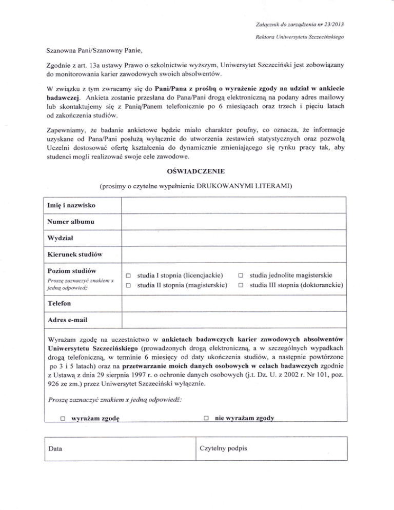 Załącznik do zarządzenia nr 23/20I3 Re kI or a Uniw ersyt etu Szcz ecińs kie go Szanowna Pani/Szanowny Panie, Zgodnie z art' 13a ustawy Prawo o szkolnictwie wyższym' Uniwersy.tet Szczeciński jest zobowiązany do monitorowania karięr zawodowych swoich absolwentów. W związku z tym zwracamy się do Pani/Pana z prośbąo wyrażenie zgody na udział w ankiecie badawczej. Ankieta zostanie przesłana do Pana/Pani drogą elęktroniczną na podany adres mailowy lub skontaktujemy się z Panią,/Panem telefonicznie po 6 miesiącach oraz trzech i pięciu latach od zakończenia studiów. Zapewniamy, Że badanie ankietowe będzie miało charalder poufny , co azltacza, że informacje uzyskane od Pana/Pani posłużąuyłącznie do utworzenia zestawień statystycznych oraz pozrvolą Uczelni dostosować ofeńę kształcenia do dynamicznie zmieniającego się rynku pracy tak, aby studenci mogli realizowaó swoje cele zawodowe. OSWIADCZENIE (prosimy o czytelne wypełnienie DRUKowA}nł\4I LITERAMI) Imię i nazwisko Numer albumu Wydział Kierunek studiów Poziom studiów Proszę zaznaczyć znakiem x jedną odpowiedź n n studia I stopnia (licencjackie) ! studia j ednolite magisterskie studia II stopnia (magisterskie) D studia III stopnia (doktoranckie) Telefon Adres e-mail WyrtŻam zgodę na uczestnictwo w ankietach badawcrych karier zawodowych absolwentów Uniwersytetu Szczecińskiego (prowadzonych drogą ęlektroniczną a w szczególnych wypadkach drogą telefoniczną w terminie 6 miesięcy od daty ukończenia studiów, a następnie powtórzone po 3 i 5 latach) oraz na przetwarzanie moich danych osobowych w celach badawcrych zgodnie z Ustawą zdrtia 29 sierpnia 1997 r. o ochronie danych osobowych (.t"Dz.U. z200Ż r. Nr 101, poz. 9Ż6 zę zm") przez Uniwersytet Szczeciński wyłącznie" Proszę zaznaczyć znakiem wvrażam zpode Data x jednąodpowiedź: D nie wyrażam zgody Czytelny podpis