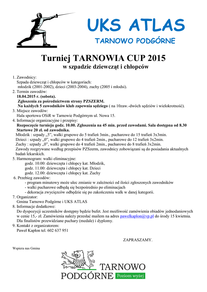 UKS ATLAS TARNOWO PODGÓRNE Turniej TARNOWIA CUP 2015 w szpadzie dziewcząt i chłopców 1. Zawodnicy: Szpada dziewcząt i chłopców w kategoriach: młodzik (2001-2002), dzieci (2003-2004), zuchy (2005 i młodsi). 2. Termin zawodów: 18.04.2015 r. (sobota). Zgłoszenia za pośrednictwem strony PZSZERM. Na każdych 5 zawodników klub zapewnia sędziego ( na 10zaw.-dwóch sędziów i wielokrotność). 3. Miejsce zawodów: Hala sportowa OSiR w Tarnowie Podgórnym ul. Nowa 15. 4. Informacje organizacyjne i przepisy: Rozpoczęcie turnieju godz. 10.00. Zgłoszenia na 45 min. przed zawodami. Sala dostępna od 8.30 Startowe 20 zł. od zawodnika. Młodzik : szpady „5”, walki grupowe do 5 trafień 3min., pucharowe do 15 trafień 3x3min. Dzieci : szpady „0”, walki grupowe do 4 trafień 2min., pucharowe do 12 trafień 3x2min. Zuchy : szpady „0”, walki grupowe do 4 trafień 2min., pucharowe do 8 trafień 3x2min. Zawody rozgrywane według przepisów PZSzerm, zawodnicy zobowiązani są do posiadania aktualnych badań lekarskich. 5. Harmonogram: walki eliminacyjne: godz. 10.00: dziewczęta i chłopcy kat. Młodzik, godz. 11.00: dziewczęta i chłopcy kat. Dzieci godz. 12.00: dziewczęta i chłopcy kat. Zuchy 6. Przebieg zawodów: - program minutowy może ulec zmianie w zależności od ilości zgłoszonych zawodników - walki pucharowe odbędą się bezpośrednio po eliminacjach - dekoracja zwycięzców odbędzie się po zakończeniu walk w danej kategorii. 7. Organizator: Gmina Tarnowo Podgórne i UKS ATLAS 8. Informacje dodatkowe: Do dyspozycji uczestników dostępny będzie bufet. Jest możliwość zamówienia obiadów jednodaniowych w cenie 15,- zł. Zamówienia należy przesłać mailem na adres [email protected] do środy 15 kwietnia. Dla finalistów przewidziane puchary (medale) i dyplomy. 9. Kontakt z organizatorem: Paweł Kapłon tel. 602 637 951 ZAPRASZAMY. Wspiera nas Gmina