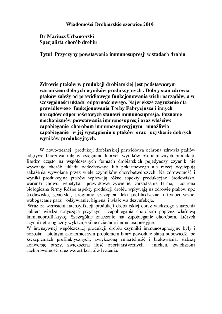 Wiadomości Drobiarskie czerwiec 2010 Dr Mariusz Urbanowski Specjalista chorób drobiu Tytuł Przyczyny powstawania immunosupresji w stadach drobiu Zdrowie ptaków w produkcji drobiarskiej jest podstawowym warunkiem dobrych wyników produkcyjnych . Dobry stan zdrowia ptaków zależy od prawidłowego funkcjonowania wielu narządów, a w szczególności układu odpornościowego. Największe zagrożenie dla prawidłowego funkcjonowania Torby Fabrycjusza i innych narządów odpornościowych stanowi immunosupresja. Poznanie mechanizmów powstawania immunosupresji oraz właściwe zapobieganie chorobom immunosupresyjnym umożliwia zapobieganie w jej wystąpieniu u ptaków oraz uzyskanie dobrych wyników produkcyjnych. W nowoczesnej produkcji drobiarskiej prawidłowa ochrona zdrowia ptaków odgrywa kluczowa rolę w osiąganiu dobrych wyników ekonomicznych produkcji. Bardzo często na współczesnych fermach drobiarskich pojedynczy czynnik nie wywołuje chorób układu oddechowego lub pokarmowego ale raczej występują zakażenia wywołane przez wiele czynników chorobotwórczych. Na zdrowotność i wyniki produkcyjne ptaków wpływają różne aspekty produkcyjne ;środowisko, warunki chowu, genetyka prawidłowe żywienie, zarządzanie fermą, ochrona biologiczna fermy Różne aspekty produkcji drobiu wpływają na zdrowie ptaków np.: środowisko, genetyka, programy szczepień, leki profilaktyczne i terapeutyczne, wzbogacanie pasz, odżywianie, higiena i właściwa dezynfekcja. Wraz ze wzrostem intensyfikacji produkcji drobiarskiej coraz większego znaczenia nabiera wiedza dotycząca przyczyn i zapobiegania chorobom poprzez właściwą immunoprofilaktykę. Szczególne znaczenie ma zapobieganie chorobom, których czynnik etiologiczny wykazuje silne działanie immunosupresyjne. W intensywnej współczesnej produkcji drobiu czynniki immunosupresyjne były i pozostają istotnym ekonomicznym problemem który powoduje słabą odpowiedź po szczepieniach profilaktycznych, zwiększoną śmiertelność i brakowania, słabszą konwersję paszy, zwiększoną ilość oportunistycznych infekcji, zwiększoną zachorowalność oraz wzrost kosztów leczenia. Immunosupresja Mianem immunosupresji określamy trwałe lub okresowe uszkodzenie układu odpornościowego powodujące obniżenie mechanizmów odpornościowych u ptaków. W konsekwencji ptaki nie mogą prawidłowo reagować na czynniki chorobotwórcze, gdyż uszkodzony układ odpornościowy nie jest w stanie wytworzyć prawidłowej odpowiedzi immunologicznej typu komórkowego lub humoralnego. Stanowi to ogromne zagrożenie we współczesnej hodowli drobiu, gdyż może bezpośrednio oddziaływać na spadek wyników produkcji, częstość powstawania zakażeń mięsa oraz produkcję jaj. Prawdopodobnie najlepiej znaną grupą czynników mogących wywołać immunosupresję są wirusy immunosupresyjne. Czynniki immunosupresyjne Do wirusów o działaniu immunosupresyjnym zaliczamy wirus choroby Mareka, wirus zakaźnego zapalenia torby Fabrycjusza- wirus choroby Gumboro (IBDV), wirus anemii kurcząt (CAA), oraz wirus białaczki drobiu (ALV) jak również Reowirusy, Reticuloendotheliosis (REV) krwotoczne zapalenie jelit indyków (HEV) oraz Adenowirusy. Czynnikami immunosupresyjnymi są również czynniki takie jak: czynniki bakteryjne, parazytologiczne, substancje chemiczne w paszy, antybiotyki, toksyny grzybicze –mikotoksyny, różnego rodzaju stresy środowiskowe takie jak zagęszczenie, nagła zmiana paszy nagłe zmiany warunków środowiskowych, temperatury wilgotności, ruchu powietrza oraz inne czynniki fizyczne. Mogą one działać indywidualnie lub łącznie, mając bezpośredni wpływ na kondycję drobiu i wyniki hodowli Torba Fabrycjusza jest głównym narządem układu odpornościowego u ptaków. Wirus choroby Mareka i choroby Gumboro powoduje uszkodzenia torby Fabrycjusza w pierwszych dniach życia. Powoduje to niezdolność układu odpornościowego ptaka do reagowania na szczepionkę albo na czynnik zakaźny. W niektórych przypadkach powoduje to u ptaków wytworzenie niedostatecznej ilości przeciwciał, a w konsekwencji brak powstania pełnej odporności dla ochrony przed infekcją określonym patogenem, przeciwko któremu je szczepiliśmy. Zniszczenie lub uszkodzenie torby Fabrycjusza może objawiać się poprzez wzrost śmiertelności, obniżenie przyrostów, wzrost spożycia paszy, zahamowanie rozwoju, nie wyrównane stado a w konsekwencji znaczne pogorszenie wyników hodowlanych stada. Wirus choroby Gumboro Wirus zakaźnego zapalenia torby Fabrycjusza (IBDV) uważany jest jako najważniejszy patogen odpowiedzialny za zjawisko immunosupresji w stadach drobiu. Liczne badania wykazały , że wirus IBD pozbawia ptaki zdolności do optymalnego reagowania przez wytwarzanie przeciwciał. Wczesne zakażenia klasycznym IBDV niszczą limfocyty B w torbie Fabrycjusza. Zakażenia w okresie pierwszych dwóch tygodniach życia powodują zwykle powstanie trwałej i ciężkiej immunosupresji. Uszkodzeniu ulega humoralna, oparta na komórkach B część układu odpornościowego. Uszkodzeniu przez wirusy IBD może również ulec komórkowy układ odpornościowy (Limfocyty T). Znaczna atrofia torby Fabrycjusza przy braku widocznych zmian zapalnych , jest typowa dla wariantowych szczepów IBDV. Szczepy te powodują ciężki stopień immunosupresji w pierwszych tygodniach życia , po której z reguły następuje wzrost przypadków zaburzeń ze strony układu oddechowego. Stwierdzono, że immunosupresja spowodowana przez wirus choroby Gumboro zmniejsza odpowiedź na szczepionki przeciwko pomorowi rzekomemu NDV, zakaźnemu zapaleniu oskrzeli IB , a nawet na szczepienie piskląt jednodniowych przeciwko chorobie Mareka. Wirus choroby Mareka Wirus choroby Mareka dostaje się do organizmu ptaka z wdychanym powietrzem. Poprzez płuca dostaje się do narządów limfatycznych. Działanie immunosupresyjne wirusa polega na bezpośredniej lizie limfocytów, lub pośrednio po