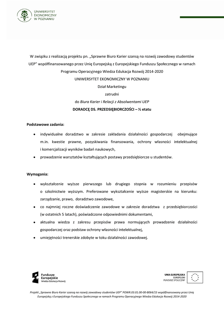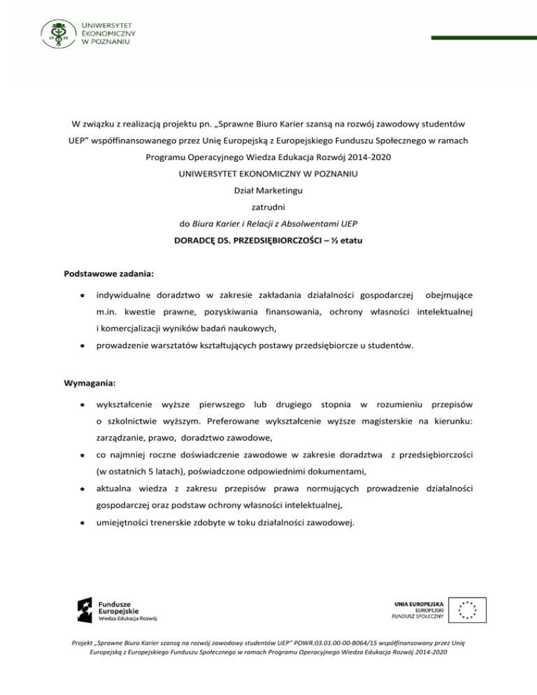 W związku z realizacją projektu pn. „Sprawne Biuro Karier szansą na rozwój zawodowy studentów UEP” współfinansowanego przez Unię Europejską z Europejskiego Funduszu Społecznego w ramach Programu Operacyjnego Wiedza Edukacja Rozwój 2014-2020 UNIWERSYTET EKONOMICZNY W POZNANIU Dział Marketingu zatrudni do Biura Karier i Relacji z Absolwentami UEP DORADCĘ DS. PRZEDSIĘBIORCZOŚCI – ½ etatu Podstawowe zadania: indywidualne doradztwo w zakresie zakładania działalności gospodarczej obejmujące m.in. kwestie prawne, pozyskiwania finansowania, ochrony własności intelektualnej i komercjalizacji wyników badań naukowych, prowadzenie warsztatów kształtujących postawy przedsiębiorcze u studentów. Wymagania: wykształcenie wyższe pierwszego lub drugiego stopnia w rozumieniu przepisów o szkolnictwie wyższym. Preferowane wykształcenie wyższe magisterskie na kierunku: zarządzanie, prawo, doradztwo zawodowe, co najmniej roczne doświadczenie zawodowe w zakresie doradztwa z przedsiębiorczości (w ostatnich 5 latach), poświadczone odpowiednimi dokumentami, aktualna wiedza z zakresu przepisów prawa normujących prowadzenie działalności gospodarczej oraz podstaw ochrony własności intelektualnej, umiejętności trenerskie zdobyte w toku działalności zawodowej. Projekt „Sprawne Biuro Karier szansą na rozwój zawodowy studentów UEP” POWR.03.01.00-00-B064/15 współfinansowany przez Unię Europejską z Europejskiego Funduszu Społecznego w ramach Programu Operacyjnego Wiedza Edukacja Rozwój 2014-2020 Oferujemy: zatrudnienie na umowę o pracę w wymiarze ½ czasu pracy, stabilne warunki zatrudnienia w renomowanej uczelni, pracę w profesjonalnym, doświadczonym zespole. Oferty powinny zawierać: CV wraz z listem motywacyjnym, kopie dokumentów potwierdzających kwalifikacje, kserokopie świadectw pracy i referencji, zgodę na przetwarzanie danych osobowych zgodnie z ustawą z dnia 29 sierpnia 1997 roku o ochronie danych osobowych (t.j. Dz. U. z 2014 roku, poz. 1182 ze zm.) Oferty należy przesłać w zamkniętych kopertach z dopiskiem: „REKRUTACJA – DORADCA DS. PRZEDSIĘBIORCZOŚCI – DO: DZIAŁ MARKETINGU BIURO KARIER I RELACJI Z ABSOLWENTAMI UEP” na adres: Uniwersytet Ekonomiczny w Poznaniu Dział Marketingu (Budynek A, p. 234a) al. Niepodległości 10, 61-875 Poznań albo przesłać na adres e-mail: [email protected] Termin składania ofert upływa 16.08.2016 roku. Uniwersytet Ekonomiczny w Poznaniu zastrzega sobie prawo przeprowadzenia rozmów kwalifikacyjnych z wybranymi kandydatami. Wynagrodzenie współfinansowane przez Unię Europejską z Europejskiego Funduszu Społecznego w ramach Programu Operacyjnego Wiedza Edukacja Rozwój 2014-2020 Projekt „Sprawne Biuro Karier szansą na rozwój zawodowy studentów UEP” POWR.03.01.00-00-B064/15 współfinansowany przez Unię Europejską z Europejskiego Funduszu Społecznego w ramach Programu Operacyjnego Wiedza Edukacja Rozwój 2014-2020