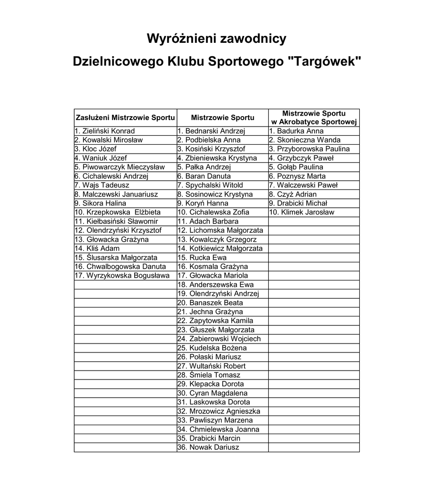 Wyróżnieni zawodnicy Dzielnicowego Klubu Sportowego "Targówek" Zasłużeni Mistrzowie Sportu 1. Zieliński Konrad 2. Kowalski Mirosław 3. Kloc Józef 4. Waniuk Józef 5. Piwowarczyk Mieczysław 6. Cichalewski Andrzej 7. Wajs Tadeusz 8. Malczewski Januariusz 9. Sikora Halina 10. Krzepkowska Elżbieta 11. Kiełbasiński Sławomir 12. Olendrzyński Krzysztof 13. Głowacka Grażyna 14. Kliś Adam 15. Ślusarska Małgorzata 16. Chwalbogowska Danuta 17. Wyrzykowska Bogusława Mistrzowie Sportu 1. Bednarski Andrzej 2. Podbielska Anna 3. Kosiński Krzysztof 4. Zbieniewska Krystyna 5. Pałka Andrzej 6. Baran Danuta 7. Spychalski Witold 8. Sosinowicz Krystyna 9. Koryń Hanna 10. Cichalewska Zofia 11. Adach Barbara 12. Lichomska Małgorzata 13. Kowalczyk Grzegorz 14. Kotkiewicz Małgorzata 15. Rucka Ewa 16. Kosmala Grażyna 17. Głowacka Mariola 18. Anderszewska Ewa 19. Olendrzyński Andrzej 20. Banaszek Beata 21. Jechna Grażyna 22. Zapytowska Kamila 23. Głuszek Małgorzata 24. Zabierowski Wojciech 25. Kudelska Bożena 26. Połaski Mariusz 27. Wultański Robert 28. Śmiela Tomasz 29. Klepacka Dorota 30. Cyran Magdalena 31. Laskowska Dorota 32. Mrozowicz Agnieszka 33. Pawliszyn Marzena 34. Chmielewska Joanna 35. Drabicki Marcin 36. Nowak Dariusz Mistrzowie Sportu w Akrobatyce Sportowej 1. Badurka Anna 2. Skonieczna Wanda 3. Przyborowska Paulina 4. Grzybczyk Paweł 5. Gołąb Paulina 6. Poznysz Marta 7. Walczewski Paweł 8. Czyż Adrian 9. Drabicki Michał 10. Klimek Jarosław