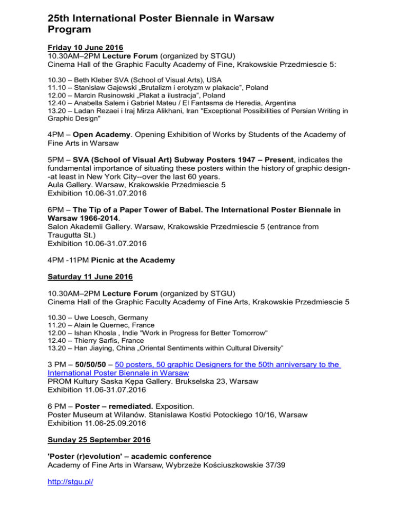 25th International Poster Biennale in Warsaw Program Friday 10 June 2016 10.30AM–2PM Lecture Forum (organized by STGU) Cinema Hall of the Graphic Faculty Academy of Fine, Krakowskie Przedmiescie 5: 10.30 – Beth Kleber SVA (School of Visual Arts), USA 11.10 – Stanisław Gajewski „Brutalizm i erotyzm w plakacie”, Poland 12.00 – Marcin Rusinowski „Plakat a ilustracja”, Poland 12.40 – Anabella Salem i Gabriel Mateu / El Fantasma de Heredia, Argentina 13.20 – Ladan Rezaei i Iraj Mirza Alikhani, Iran "Exceptional Possibilities of Persian Writing in Graphic Design" 4PM – Open Academy. Opening Exhibition of Works by Students of the Academy of Fine Arts in Warsaw 5PM – SVA (School of Visual Art) Subway Posters 1947 – Present, indicates the fundamental importance of situating these posters within the history of graphic design-at least in New York City--over the last 60 years. Aula Gallery. Warsaw, Krakowskie Przedmiescie 5 Exhibition 10.06-31.07.2016 6PM – The Tip of a Paper Tower of Babel. The International Poster Biennale in Warsaw 1966-2014. Salon Akademii Gallery. Warsaw, Krakowskie Przedmiescie 5 (entrance from Traugutta St.) Exhibition 10.06-31.07.2016 4PM -11PM Picnic at the Academy Saturday 11 June 2016 10.30AM–2PM Lecture Forum (organized by STGU) Cinema Hall of the Graphic Faculty Academy of Fine Arts, Krakowskie Przedmiescie 5 10.30 – Uwe Loesch, Germany 11.20 – Alain le Quernec, France 12.00 – Ishan Khosla , Indie "Work in Progress for Better Tomorrow" 12.40 – Thierry Sarfis, France 13.20 – Han Jiaying, China „Oriental Sentiments within Cultural Diversity” 3 PM – 50/50/50 – 50 posters, 50 graphic Designers for the 50th anniversary to the International Poster Biennale in Warsaw PROM Kultury Saska Kępa Gallery. Brukselska 23, Warsaw Exhibition 11.06-31.07.2016 6 PM – Poster – remediated. Exposition. Poster Museum at Wilanów. Stanislawa Kostki Potockiego 10/16, Warsaw Exhibition 11.06-25.09.2016 Sunday 25 September 2016 'Poster (r)evolution' – academic conference Academy of Fine Arts in Warsaw, Wybrzeże Kościuszkowskie 37/39 http://stgu.pl/
