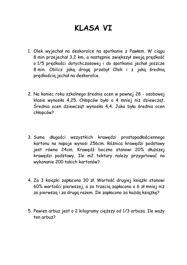 KLASA VI 1. Olek wyjechał na deskorolce na spotkanie z Pawłem. W ciągu 8 min przejechał 3,2 km, a następnie zwiększył swoją prędkość o 1/5 prędkości dotychczasowej i do spotkania jechał jeszcze 8 min. Oblicz jaką drogę przebył Olek i z jaką średnią prędkością jechał na deskorolce. 2. Na koniec roku szkolnego średnia ocen w pewnej 28 - osobowej klasie wynosiła 4,25. Chłopców było o 4 mniej niż dziewcząt. Średnia ocen dziewcząt wynosiła 4,4. Jaka była średnia ocen chłopców? 3. Suma długości wszystkich krawędzi prostopadłościennego kartonu na napoje wynosi 256cm. Różnica krawędzi podstawy jest równa 24cm. Krawędź boczna stanowi 20% dłuższej krawędzi podstawy. Ile m2 tektury należy przygotować na wykonanie 200 takich kartonów? 4. Za 3 książki zapłacono 30 zł. Wartość drugiej książki stanowi 60% wartości pierwszej, a za trzecią zapłacono o 6 zł mniej niż za pierwszą i za drugą razem. Ile zapłacono za każdą książkę? 5. Pewien arbuz jest o 2 kilogramy cięższy od 1/3 arbuza. Ile waży ten arbuz? KLASA V 1. Jeżeli z lewej kieszeni przełożę do prawej 4,50 zł, to w prawej kieszeni będę miał tyle, ile miałem początkowo w lewej kieszeni. Ile pieniędzy mam teraz w lewej kieszeni, jeżeli łącznie mam 20,50 zł? 2. Znajdź liczbę dwucyfrową, w której różnica cyfry dziesiątek i cyfry jedności wynosi 6, a cyfra jedności stanowi 1 cyfry dziesiątek. 3. Janek wypił 1/6 szklanki wody i dolał soku. Następnie wypił 1/3 szklanki wody z sokiem i dolał soku. Potem wypił 1/2 szklanki wody z sokiem i znów dolał soku. Na końcu wypił całą szklankę wody z sokiem. Czego wypił więcej – wody czy soku, jeżeli za każdym razem dolewał tyle soku, aby szklanka była pełna? 4. Pitagoras, matematyk grecki, który żył w VI w. p.n.e. zapytany o liczbę swoich uczniów, odpowiedział: „Połowa moich uczniów uczy się matematyki, czwarta część przyrody, siódma część milczenia, resztę stanowią trzy kobiety”. Ilu uczniów miał Pitagoras? 5. Obwód kwadratu wynosi 80 cm. O ile należy zmniejszyć bok tego kwadratu, żeby pole nowo powstałego kwadratu wynosiło 36 cm2? KLASA IV 1. Przed ośmiu laty syn miał 4 lata i był 10 razy młodszy od ojca. Ile razy młodszy jest teraz syn od ojca? 2. Światło rozchodzi się z prędkością 300 000 km/s. Oblicz odległość Ziemi od Słońca, jeżeli czas przejścia światła od Słońca do Ziemi trwa 8 minut 20 sekund. 3. Pies waży 9 razy więcej niż kot, mysz jest 20 razy lżejsza od kota, a rzepa jest 6 razy cięższa niż mysz. Ile razy pies jest cięższy od rzepy? 4. Każdy uczeń klasy IV należy do koła matematycznego lub polonistycznego. 20 uczniów należy do koła matematycznego, 16 uczniów do koła polonistycznego, a do jednego i drugiego koła należy 6 uczniów. Ilu uczniów jest w tej klasie? 5. Prostokąt i kwadrat mają takie same obwody równe 24 cm. Jeden bok prostokąta jest o 2 cm większy od długości boku kwadratu. Jakie są wymiary prostokąta?