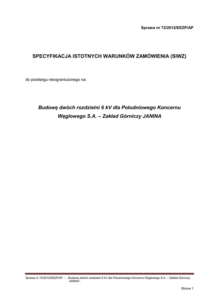 Sprawa nr 72/2012/EEZP/AP SPECYFIKACJA ISTOTNYCH WARUNKÓW ZAMÓWIENIA (SIWZ) do przetargu nieograniczonego na: Budowę dwóch rozdzielni 6 kV dla Południowego Koncernu Węglowego S.A. – Zakład Górniczy JANINA Sprawa nr 72/2012/EEZP/AP – „Budowa dwóch rozdzielni 6 kV dla Południowego Koncernu Węglowego S.A. – Zakład Górniczy JANINA”. Strona 1 NAZWA I ADRES ZAMAWIAJĄCEGO REALIZUJĄCEGO POSTĘPOWANIE Południowy Koncern Węglowy S.A. 43 – 600 Jaworzno, ul. Grunwaldzka 37 Adres internetowy (URL): www.pkwsa.pl Wydział Zamówień Publicznych: godziny urzędowania - od 7:00 do 15:00; fax +48 32 615 08 62 lub +48 32 615 59 42, tel. +48 32 618 54 31 Kancelaria Główna - czynna w godzinach od 7:00 do 15:00 TRYB UDZIELENIA ZAMÓWIENIA Przetarg nieograniczony Podstawa prawna: art. 134 ust. 1 oraz art. 39 ustawy z dnia 29 stycznia 2004 r. Prawo zamówień publicznych (tekst jedn. Dz. U. z 2010 r. Nr 113, poz. 759 z późn. zm.). PRZEDMIOT ZAMÓWIENIA Nazwa nadana przez Zamawiającego: Budowa dwóch rozdzielni 6 kV dla Południowego Koncernu Węglowego S.A. – Zakład Górniczy JANINA Nazwa wg Wspólnego Słownika Zamówień: Kod CPV: 31213100 – Rozdzielnie, 31310000 – Sieci zasilające, 32581000 – Sprzęt do przesyłu danych Szczegółowy opis przedmiotu zamówienia stanowi załącznik nr 1 do SIWZ. TERMIN REALIZACJI ZAMÓWIENIA zadanie nr 1: do 90 dni od daty zawarcia umowy. zadanie nr 2: do 150 dni od daty zawarcia umowy. WYKAZ ZAŁĄCZNIKÓW DO SIWZ Załącznik nr 1 – Opis przedmiotu zamówienia. Załącznik nr 2 – FORMULARZ OFERTOWY (wzór). Załącznik nr 3 – Wykaz dostaw (wzór). Załącznik nr 4 – Oświadczenia Wykonawcy potwierdzające brak podstaw do wykluczenia z postępowania (wzór). Sprawa nr 72/2012/EEZP/AP – „Budowa dwóch rozdzielni 6 kV dla Południowego Koncernu Węglowego S.A. – Zakład Górniczy JANINA”. Strona 2 Załącznik nr 5 – Oświadczenia Wykonawcy dotyczące zdolności technicznej (wzór). Załącznik nr 6 – Zintegrowana Polityka Jakości, Środowiska, Bezpieczeństwa i Higieny Pracy w Południowym Koncernie Węglowym S.A. Załącznik nr 7 – Projekt UMOWY. Załącznik nr 8 – Szczegółowa specyfikacja dostawy (wzór). Załącznik nr 9 – Wykaz osób które będą wykonywać zamówienie lub będą uczestniczyć w wykonywaniu zamówienia zgodnie z zapisami zawartymi w Prawie geologicznym i górniczym, w zakresie kierowania, nadzorowania i kontroli nad robotami stanowiącymi przedmiot zamówienia (wzór). Załącznik nr 10 – Wykaz osób posiadających kwalifikacje dla wykonywania czynności specjalistycznych w podziemnych zakładach górniczych wymienionych w art. 53. ust. 6 ustawy Prawo geologiczne i górnicze z dnia 9.06.2011 r. (Dz. U. Nr 163, poz. 981) które będą uczestniczyć w wykonywaniu zamówienia (wzór). Załącznik nr 11 – Cennik opłat dla podmiotów zewnętrznych współpracujących z Południowym Koncernem Węglowym S.A. Zgodnie z art. 36 ust. 1 ustawy Prawo zamówień publicznych określa się poniższe warunki: INFORMACJE OGÓLNE I. 1. Ilekroć w niniejszej Specyfikacji zastosowane jest pojęcie „ustawa” bez bliższego określenia o jaką ustawę chodzi, to dotyczy to znowelizowanej ustawy z dnia 29.01.2004 roku Prawo zamówień publicznych. 2. Wykonawca przedstawi ofertę w języku polskim - zgodną z postanowieniami SIWZ. 3. Wykonawca złoży jedną ofertę w dwóch egzemplarzach, tj.: oryginał w tradycyjnej formie pisemnej oraz kopię oferty wykonaną z oryginału – w wersji elektronicznej na płycie CD–ROM z możliwością odczytu w programach Microsoft Word i/lub Microsoft Excel i/lub Adobe Reader (pliki zapisane w formacie PDF) 4. Ofertę stanowi wypełniony „Formularz ofertowy” stanowiący załącznik nr 2 do SIWZ wraz z wymaganymi przez Zamawiającego dokumentami oraz oświadczeniami. 5. W razie rozbieżności między treścią oryginału i kopii - obowiązuje treść oryginału oferty. 6. Złożenie większej liczby ofert spowoduje odrzucenie wszystkich ofert złożonych przez danego Wykonawcę. 7. Wykonawca poniesie wszelkie koszty związane z przygotowaniem i złożeniem oferty. Zamawiający nie przewiduje zwrotu kosztów związanych z uczestnictwem w postępowaniu. 8. Wykonawcy mogą wspólnie ubiegać się o udzielenie zamówienia. Grupa Wykonawców ubiegająca się o udzielenie zamówienia musi przyjąć formę prawną określoną w art. 23 ustawy. 9. Jeżeli oferta Wykonawców wspólnie ubiegających się o udzielenie zamówienia zostanie wybrana, przed zawarciem umowy w sprawie przedmiotowego zamówienia Zamawiający żąda przedłożenia umowy regulującej współpracę tych Wykonawców. Sprawa nr 72/2012/EEZP/AP – „Budowa dwóch rozdzielni 6 kV dla Południowego Koncernu Węglowego S.A. – Zakład Górniczy JANINA”. Strona 3 10. Zamawiający informuje, że umożliwi wgląd do jawnej części złożonych ofert w wyznaczonym przez siebie terminie, określonym w pisemnej odpowiedzi na pisemny wniosek zainteresowanego. 11. Wymaga się, aby najpóźniej w dniu zawierania umowy, ale przed jej podpisaniem Wykonawca dostarczył Zamawiającemu listę jednostek zależnych wchodzących w skład Grupy Kapitałowej wykonawcy w rozumieniu przepisów o rachunkowości, która stanowić będzie załącznik do umowy oraz niezwłocznie informował Zamawiającego o każdej zmianie w składzie swojej Grupy Kapitałowej. Jeśli wykonawca nie należy do żadnej Grupy Kapitałowej, zamiast listy jednostek zależnych składa stosowne oświadczenie, że jego firma nie wchodzi w skład żadnej Grupy Kapitałowej i nie posiada jednostek zależnych wchodzących w skład jego Grupy Kapitałowej. Niedostarczenie powyższej listy jednostek zależnych lub stosownego oświadczenia w terminie wyznaczonym przez zamawiającego będzie traktowane jako uchylanie się wykonawcy od zawarcia umowy, co w konsekwencji skutkować będzie zatrzymaniem wadium na podstawie art. 46 ust. 5 ustawy. 12. Wymaga 