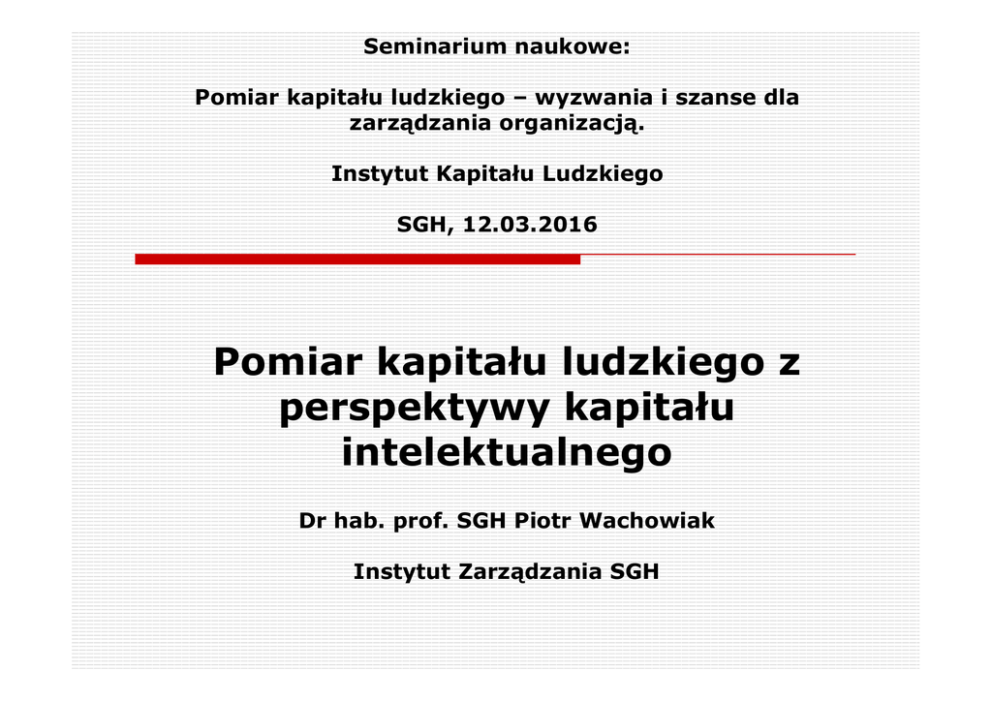 Seminarium naukowe: Pomiar kapitału ludzkiego – wyzwania i szanse dla zarządzania organizacją. Instytut Kapitału Ludzkiego SGH, 12.03.2016 Pomiar kapitału ludzkiego z perspektywy kapitału intelektualnego Dr hab. prof. SGH Piotr Wachowiak Instytut Zarządzania SGH Kapitał intelektualny przedsiębiorstwa Kapitał intelektualny przedsiębiorstwa jest jego systemem korzeniowym. Jest pomiarem ukrytych dynamicznych czynników, które leżą u podstaw widocznego przedsiębiorstwa. Stanowi różnicę między wartością rynkową przedsiębiorstwa, a wartością księgową, tworząc aktywa niefinansowe przedsiębiorstwa ( niewidzialne). © Piotr Wachowiak 2 Kapitał intelektualny - to „ukryte” aktywa przedsiębiorstwa Kapitał intelektualny Kapitał Kapitał Kapitał ludzki organizacyjny rynkowy © Piotr Wachowiak 3 Kapitał ludzki Kapitał ludzki są to kompetencje, które posiadają pracownicy. Na kompetencje składają się ich kwalifikacje, umiejętności, doświadczenie oraz postawy. © Piotr Wachowiak 4 Wnioski wynikające z analizy narzędzi służących do pomiaru kapitału ludzkiego z perspektywy kapitału intelektualnego Nie ma jednego uniwersalnego narzędzia pomiaru kapitału ludzkiego. Większość badaczy opowiada się za narzędziami wielowskaźnikowymi. Duża część badaczy proponuje wskaźniki pomiaru kapitału ludzkiego bez określenia dokładnego sposobu ich wyliczenia oraz operacjonalizacji. Poszczególni badacze w zaproponowanych przez siebie modelach kładą nacisk na różne obszary kapitału ludzkiego. Część badaczy proponuje odrębne wskaźniki w odniesieniu do poszczególnych kategorii kapitału ludzkiego, wyodrębnionych ze względu na: zajmowane stanowisko w strukturze organizacyjnej, formę zatrudnienia. W większości zaproponowanych metod pomiaru kapitału ludzkiego występują zarówno wskaźniki jakościowe jak i ilościowe. © Piotr Wachowiak 5 Wielowskaźnikowy model wskaźnikowy kapitału ludzkiego przez pryzmat kapitału intelektualnego Kategorie wskaźników Wskaźniki kosztów Wskaźniki czasowo-ilościowe Wskaźniki wydajności/efektywności Wskaźniki finansowe Wskaźniki jakościowe © Piotr Wachowiak 6 Wskaźniki kosztów KATEGORIA WSKAŹNIKA WSKAŹNIK Wskaźnik kosztu pozyskania pracownika Wskaźnik kosztu szkoleń Wskaźnik kosztu wynagrodzeń całkowitych Wskaźniki kosztów Wskaźnik kosztu odejścia pracownika Wskaźnik kosztu inwestycji w pracownika Wskaźnik kosztu zastąpienia pracownika © Piotr Wachowiak SPOSÓB POMIARU Koszty rekrutacji i selekcji przypadające na jednego nowo zatrudnionego pracownika do średniego wynagrodzenia całkowitego pracownika Koszty szkoleń przypadające na jednego pracownika Koszty wynagrodzeń całkowitych na jednego pracownika Koszty odejścia pracowników (np. odprawy pracownicze, koszty zastępstw) przypadające na jednego zatrudnionego pracownika Wskaźnik kosztu szkoleń do Wskaźnika kosztu wynagrodzeń całkowitych Wskaźnik kosztu odejścia pracownika + Wskaźnik kosztu pozyskania pracownika 7 Wskaźniki czasowoilościowe Wskaźnik fluktuacji kadr Liczba pracowników odchodzących w danym okresie w stosunku do ogólnej liczby pracowników zatrudnionych w przedsiębiorstwie Wskaźnik dostępności kapitału ludzkiego Liczba pracowników pracujących w pełnym wymiarze czasu pracy w stosunku do ogólnej liczby pracowników zatrudnionych w przedsiębiorstwie Wskaźnik zakotwiczenia pracowników Liczba pracowników zatrudnionych na czas nieokreślony w stosunku do ogólnej liczby pracowników zatrudnionych w przedsiębiorstwie Wskaźnik czasu szkoleń Liczba dni szkoleniowych przypadających na jednego pracownika Średni czas potrzebny do wdrożenia nowego pracownika do realizacji zadań na stanowiskach w przedsiębiorstwie Wskaźniki czasowo-ilościowe Wskaźnik czasu zastąpienia pracownika Wskaźnik rozwoju zawodowego Wskaźnik zaangażowania pracowników w działalność badawczo-rozwojową Wskaźnik absencji © Piotr Wachowiak Liczba pracowników objętych indywidualnym programem rozwoju zawodowego w stosunku do ogólnej liczby pracowników Liczba pracowników zatrudnionych w działach badawczo-rozwojowych w stosunku do ogólnej liczby pracowników Średnia liczba dni absencji w ciągu jednego roku przypadająca na jednego pracownika 8 Wskaźniki wydajności/efektywności Wskaźnik kreatywności pracowniczej Liczba zgłoszonych inicjatyw przypadająca na jednego pracownika Wskaźnik wykorzystania kreatywności pracowniczej Liczba zrealizowanych inicjatyw pracowniczych przypadających na jednego pracownika Wskaźniki wydajności/efektywności © Piotr Wachowiak 9 Wskaźniki finansowe Wskaźnik dochodowości pracowników Wartość dodana przypadająca na jednego pracownika Wskaźnik przychodowości pracowników Wielkość przychodów przypadająca na jednego pracownika Wskaźnik generowania wartości przez pracowników Wartość rynkowa przedsiębiorstwa w przeliczeniu na jednego pracownika Wskaźniki finansowe © Piotr Wachowiak 10 Wskaźniki jakościowe Wskaźnik doświadczenia branżowego Wskaźnik doświadczenia firmowego Wskaźniki jakościowe Wskaźnik zróżnicowania pracowników pod względem wieku / płci Procentowy udział pracowników w poszczególnych przedziałach wiekowych ( przedział wiekowy obejmuje dziesięć lat) Procentowy udział kobiet w ogólnej liczbie pracowników Wskaźnik poziomu wykształcenia Liczba pracowników posiadających wyższe wykształcenie w stosunku do ogólnej liczby pracowników Liczba pracowników zatrudnionych zgodnie ze swoim wykształceniem w stosunku do ogólnej liczby pracowników Wskaźnik dopasowania kompetencyjnego pracowników Wskaźnik unikatowości kompetencyjnej Wskaźnik satysfakcji zawodowej © Piotr Wachowiak Średnia liczba lat pracy w branży pracowników zatrudnionych w przedsiębiorstwie Średnia liczba lat pracy pracowników w danym przedsiębiorstwie Udział ekspertów o znaczącej pozycji w branży w stosunku do ogólnej licz