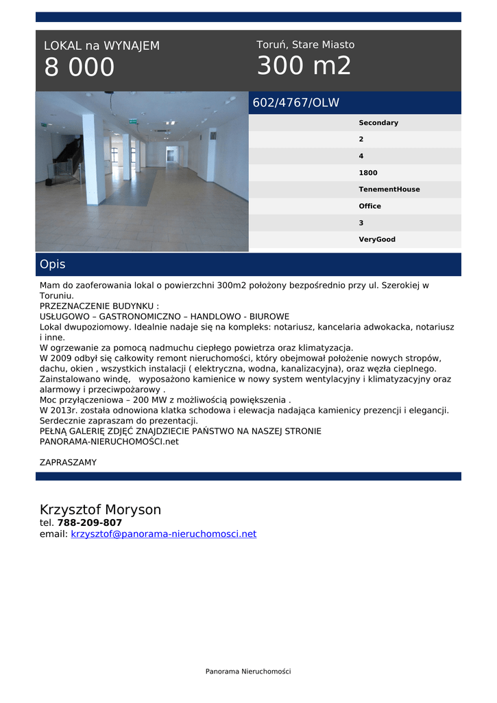 LOKAL na WYNAJEM 8 000 Toruń, Stare Miasto 300 m2 602/4767/OLW Secondary 2 4 1800 TenementHouse Office 3 VeryGood Opis Mam do zaoferowania lokal o powierzchni 300m2 położony bezpośrednio przy ul. Szerokiej w Toruniu. PRZEZNACZENIE BUDYNKU : USŁUGOWO – GASTRONOMICZNO – HANDLOWO - BIUROWE Lokal dwupoziomowy. Idealnie nadaje się na kompleks: notariusz, kancelaria adwokacka, notariusz i inne. W ogrzewanie za pomocą nadmuchu ciepłego powietrza oraz klimatyzacja. W 2009 odbył się całkowity remont nieruchomości, który obejmował położenie nowych stropów, dachu, okien , wszystkich instalacji ( elektryczna, wodna, kanalizacyjna), oraz węzła cieplnego. Zainstalowano windę, wyposażono kamienice w nowy system wentylacyjny i klimatyzacyjny oraz alarmowy i przeciwpożarowy . Moc przyłączeniowa – 200 MW z możliwością powiększenia . W 2013r. została odnowiona klatka schodowa i elewacja nadająca kamienicy prezencji i elegancji. Serdecznie zapraszam do prezentacji. PEŁNĄ GALERIĘ ZDJĘĆ ZNAJDZIECIE PAŃSTWO NA NASZEJ STRONIE PANORAMA-NIERUCHOMOŚCI.net ZAPRASZAMY Krzysztof Moryson tel. 788-209-807 email: [email protected] Panorama Nieruchomości Powered by TCPDF (www.tcpdf.org)