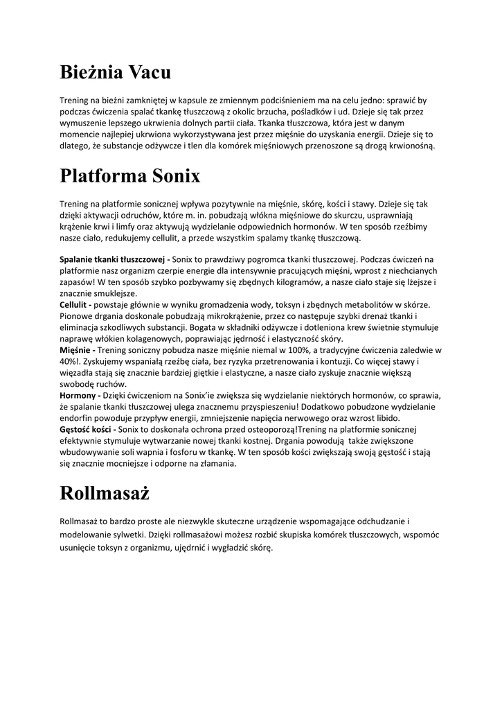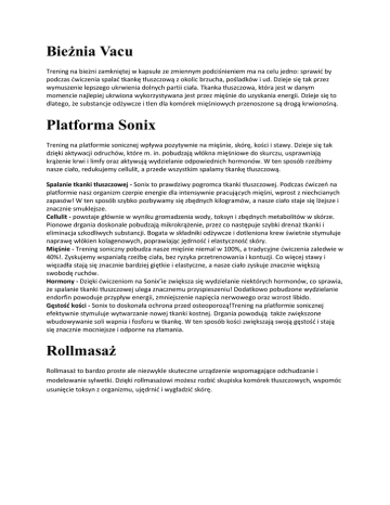 Bieżnia Vacu Trening na bieżni zamkniętej w kapsule ze zmiennym podciśnieniem ma na celu jedno: sprawić by podczas ćwiczenia spalać tkankę tłuszczową z okolic brzucha, pośladków i ud. Dzieje się tak przez wymuszenie lepszego ukrwienia dolnych partii ciała. Tkanka tłuszczowa, która jest w danym momencie najlepiej ukrwiona wykorzystywana jest przez mięśnie do uzyskania energii. Dzieje się to dlatego, że substancje odżywcze i tlen dla komórek mięśniowych przenoszone są drogą krwionośną. Platforma Sonix Trening na platformie sonicznej wpływa pozytywnie na mięśnie, skórę, kości i stawy. Dzieje się tak dzięki aktywacji odruchów, które m. in. pobudzają włókna mięśniowe do skurczu, usprawniają krążenie krwi i limfy oraz aktywują wydzielanie odpowiednich hormonów. W ten sposób rzeźbimy nasze ciało, redukujemy cellulit, a przede wszystkim spalamy tkankę tłuszczową. Spalanie tkanki tłuszczowej - Sonix to prawdziwy pogromca tkanki tłuszczowej. Podczas ćwiczeń na platformie nasz organizm czerpie energie dla intensywnie pracujących mięśni, wprost z niechcianych zapasów! W ten sposób szybko pozbywamy się zbędnych kilogramów, a nasze ciało staje się lżejsze i znacznie smuklejsze. Cellulit - powstaje głównie w wyniku gromadzenia wody, toksyn i zbędnych metabolitów w skórze. Pionowe drgania doskonale pobudzają mikrokrążenie, przez co następuje szybki drenaż tkanki i eliminacja szkodliwych substancji. Bogata w składniki odżywcze i dotleniona krew świetnie stymuluje naprawę włókien kolagenowych, poprawiając jędrność i elastyczność skóry. Mięśnie - Trening soniczny pobudza nasze mięśnie niemal w 100%, a tradycyjne ćwiczenia zaledwie w 40%!. Zyskujemy wspaniałą rzeźbę ciała, bez ryzyka przetrenowania i kontuzji. Co więcej stawy i więzadła stają się znacznie bardziej giętkie i elastyczne, a nasze ciało zyskuje znacznie większą swobodę ruchów. Hormony - Dzięki ćwiczeniom na Sonix’ie zwiększa się wydzielanie niektórych hormonów, co sprawia, że spalanie tkanki tłuszczowej ulega znacznemu przyspieszeniu! Dodatkowo pobudzone wydzielanie endorfin powoduje przypływ energii, zmniejszenie napięcia nerwowego oraz wzrost libido. Gęstość kości - Sonix to doskonała ochrona przed osteoporozą!Trening na platformie sonicznej efektywnie stymuluje wytwarzanie nowej tkanki kostnej. Drgania powodują także zwiększone wbudowywanie soli wapnia i fosforu w tkankę. W ten sposób kości zwiększają swoją gęstość i stają się znacznie mocniejsze i odporne na złamania. Rollmasaż Rollmasaż to bardzo proste ale niezwykle skuteczne urządzenie wspomagające odchudzanie i modelowanie sylwetki. Dzięki rollmasażowi możesz rozbić skupiska komórek tłuszczowych, wspomóc usunięcie toksyn z organizmu, ujędrnić i wygładzić skórę.