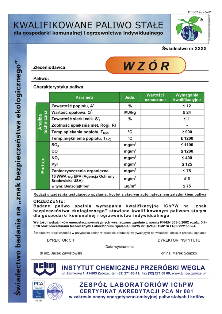 F/I/1-07 Stan 06/07 ® logo świadectwa z biblioteki klipartów COREL KWALIFIKOWANE PALIWO STAŁE dla gospodarki komunalnej i ogrzewnictwa indywidualnego WZÓR Zleceniodawca: Paliwo: Charakterystyka paliwa Parametr Analiza techniczna % Wymagania kwalifikacyjne ≤ 12 MJ/kg ≥ 24 % ≤1 Jedn. Zawartość popiołu, Ar r Wartość opałowa, Q i r Zawartość siarki całk. S t Zdolność spiekania met. Rogi, RI Wartości oznaczone - Temp.spiekania popiołu, TS(O) °C Temp.mięknienia popiołu, TA(O) °C ≥ 900 ≥ 1200 mg/m 3 ≤ 1100 mg/m 3 ≤ 1200 mg/m 3 ≤ 400 mg/m 3 ≤ 125 Zanieczyszczenia organiczne mg/m 3 ≤ 75 16 WWA wg EPA (Agencja Ochrony Środowiska USA) w tym: Benzo(a)Piren mg/m3 ≤5 μg/m3 ≤ 75 SO2 CO Emisje Świadectwo badania na „znak bezpieczeństwa ekologicznego” Świadectwo nr XXXX NO2 Pył Rodzaj urządzenia testującego spalanie: kocioł z ciągłym automatycznym załadunkiem paliw a ORZECZENIE: Badane paliwo spełnia wymagania kw alifikacyjne IChPW na „znak bezpieczeństwa ekologicznego” stawiane kwalifikowanym paliwom stałym dla gospodarki komunalnej i ogrzewnictwa indywidualnego Wartości wskaźników energetyczno-emisyjnych wyznaczono zgodnie z normą PN-EN 303-5:2002 rozdz. 5.75.10 oraz procedurami technicznymi Laboratorium Spalania IChPW nr Q/ZS/P/15/01/A I Q/ZS/P/15/02/A Świadectwo traci ważność w przypadku zmian w procesie produkcji wpływających na wskaźniki emisji z procesu spalania DYREKTOR CIT DYREKTOR INSTYTUTU Data wystawienia dr inż. Jacek Zawistowski dr inż. Marek Ściążko INSTYTUT CHEMICZNEJ PRZERÓBKI WĘGLA ul. Zamkowa 1, 41-803 Zabrze; tel. (32) 271 00 41; fax (32) 271 08 09; www.ichpw.zabrze.pl ZESPÓŁ LABORATORIÓW IChPW CERTYFIKAT AKREDYTACJI PCA Nr 081 w zakresie oceny energetyczno-emisyjnej paliw stałych i kotłów