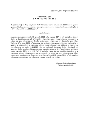 Opatówek, dnia 08 grudnia 2016 roku INFORMACJA OWYNIKUPRZETARGU Na podstawie § 12 Rozporządzenia Rady Ministrów z dnia 14 września 2004 roku w sprawie sposobu i trybu przeprowadzania przetargów oraz rokowań na zbycie nieruchomości /Dz. U. z 2004 roku nr 207 poz. 2108 ze zm./ zawiadamiam 00 że, przeprowadzony w dniu 08 grudnia 2016 roku o godz. 11 w sali posiedzeń Urzędu Gminy w Opatówku przy pl. Wolności 14 I przetarg ustny nieograniczony na oddanie w najem na czas nieoznaczony lokalu użytkowego położonego w Opatówku przy Placu Wolności 17 o pow. 56,50 m2 zakończył się wynikiem negatywnym. Komisja stwierdziła, że zgodnie z ogłoszeniem o przetargu ustnym nieograniczonym na oddanie w najem ww. nieruchomości do dnia 29.11.2016 roku na rachunek bankowy Gminy Opatówek nie wpłynęło żadne wadium. Stawka czynszu wywoławczego za 1 m2 powierzchni użytkowej lokalu wynosiła 20,94 zł + 23% VAT. W związku z powyższym, komisja stwierdza, że w przetargu ustnym nieograniczonym na oddanie w najem na czas nieoznaczony lokalu użytkowego położonego w Opatówku przy Placu Wolności 17 o pow. 56,50 m2 nie ustalono najemcy przedmiotowej nieruchomości z uwagi na brak oferentów. Sekretarz Gminy Opatówek /-/ Krzysztof Dziedzic