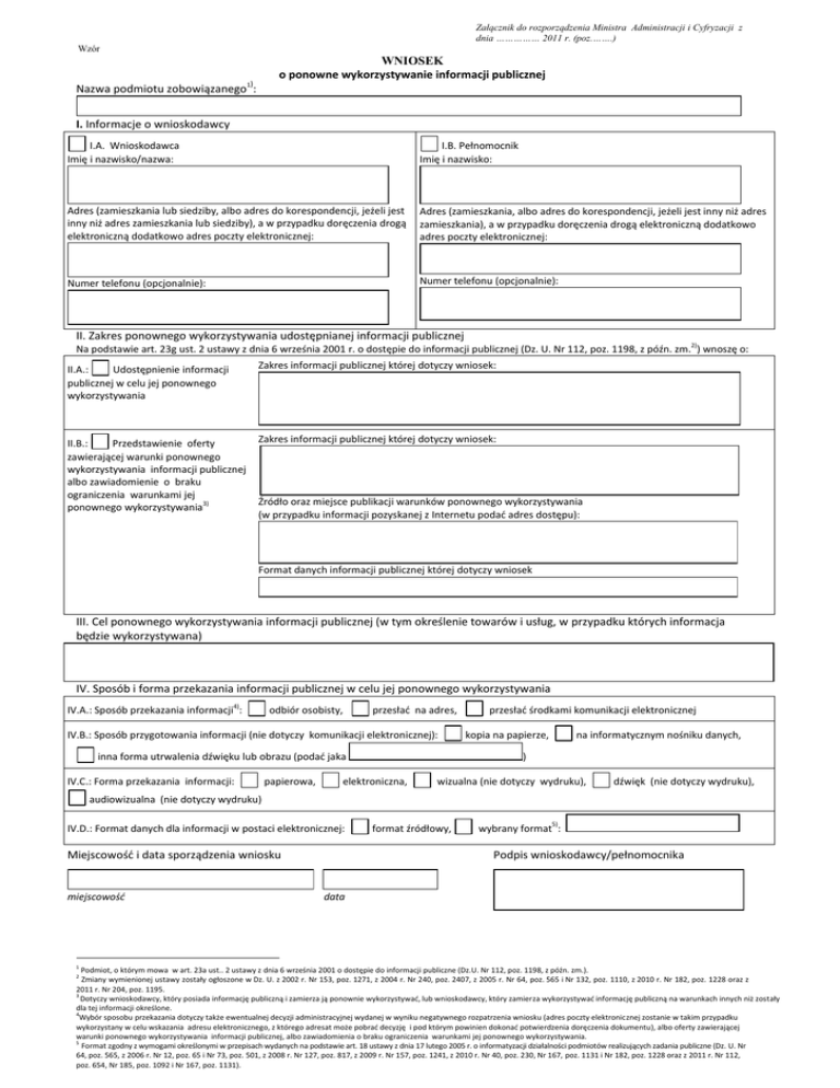 Załącznik do rozporządzenia Ministra Administracji i Cyfryzacji z dnia …………… 2011 r. (poz.…….) Wzór WNIOSEK o ponowne wykorzystywanie informacji publicznej ) Nazwa podmiotu zobowiązanego1 : I. Informacje o wnioskodawcy I.A. Wnioskodawca Imię i nazwisko/nazwa: I.B. Pełnomocnik Imię i nazwisko: Adres (zamieszkania lub siedziby, albo adres do korespondencji, jeżeli jest inny niż adres zamieszkania lub siedziby), a w przypadku doręczenia drogą elektroniczną dodatkowo adres poczty elektronicznej: Adres (zamieszkania, albo adres do korespondencji, jeżeli jest inny niż adres zamieszkania), a w przypadku doręczenia drogą elektroniczną dodatkowo adres poczty elektronicznej: Numer telefonu (opcjonalnie): Numer telefonu (opcjonalnie): II. Zakres ponownego wykorzystywania udostępnianej informacji publicznej Na podstawie art. 23g ust. 2 ustawy z dnia 6 września 2001 r. o dostępie do informacji publicznej (Dz. U. Nr 112, poz. 1198, z późn. zm.2)) wnoszę o: II.A.: Udostępnienie informacji publicznej w celu jej ponownego wykorzystywania Zakres informacji publicznej której dotyczy wniosek: II.B.: Przedstawienie oferty zawierającej warunki ponownego wykorzystywania informacji publicznej albo zawiadomienie o braku ograniczenia warunkami jej ponownego wykorzystywania3) Zakres informacji publicznej której dotyczy wniosek: Źródło oraz miejsce publikacji warunków ponownego wykorzystywania (w przypadku informacji pozyskanej z Internetu podać adres dostępu): Format danych informacji publicznej której dotyczy wniosek III. Cel ponownego wykorzystywania informacji publicznej (w tym określenie towarów i usług, w przypadku których informacja będzie wykorzystywana) IV. Sposób i forma przekazania informacji publicznej w celu jej ponownego wykorzystywania IV.A.: Sposób przekazania informacji4): odbiór osobisty, przesłać na adres, IV.B.: Sposób przygotowania informacji (nie dotyczy komunikacji elektronicznej): inna forma utrwalenia dźwięku lub obrazu (podać jaka IV.C.: Forma przekazania informacji: papierowa, przesłać środkami komunikacji elektronicznej kopia na papierze, na informatycznym nośniku danych, ) elektroniczna, wizualna (nie dotyczy wydruku), dźwięk (nie dotyczy wydruku), audiowizualna (nie dotyczy wydruku) IV.D.: Format danych dla informacji w postaci elektronicznej: Miejscowość i data sporządzenia wniosku miejscowość 1 format źródłowy, wybrany format5): Podpis wnioskodawcy/pełnomocnika data Podmiot, o którym mowa w art. 23a ust.. 2 ustawy z dnia 6 września 2001 o dostępie do informacji publiczne (Dz.U. Nr 112, poz. 1198, z późn. zm.). Zmiany wymienionej ustawy zostały ogłoszone w Dz. U. z 2002 r. Nr 153, poz. 1271, z 2004 r. Nr 240, poz. 2407, z 2005 r. Nr 64, poz. 565 i Nr 132, poz. 1110, z 2010 r. Nr 182, poz. 1228 oraz z 2011 r. Nr 204, poz. 1195. 3 Dotyczy wnioskodawcy, który posiada informację publiczną i zamierza ją ponownie wykorzystywać, lub wnioskodawcy, który zamierza wykorzystywać informację publiczną na warunkach innych niż zostały dla tej informacji określone. 4 Wybór sposobu przekazania dotyczy także ewentualnej decyzji administracyjnej wydanej w wyniku negatywnego rozpatrzenia wniosku (adres poczty elektronicznej zostanie w takim przypadku wykorzystany w celu wskazania adresu elektronicznego, z którego adresat może pobrać decyzję i pod którym powinien dokonać potwierdzenia doręczenia dokumentu), albo oferty zawierającej warunki ponownego wykorzystywania informacji publicznej, albo zawiadomienia o braku ograniczenia warunkami jej ponownego wykorzystywania. 5 Format zgodny z wymogami określonymi w przepisach wydanych na podstawie art. 18 ustawy z dnia 17 lutego 2005 r. o informatyzacji działalności podmiotów realizujących zadania publiczne (Dz. U. Nr 64, poz. 565, z 2006 r. Nr 12, poz. 65 i Nr 73, poz. 501, z 2008 r. Nr 127, poz. 817, z 2009 r. Nr 157, poz. 1241, z 2010 r. Nr 40, poz. 230, Nr 167, poz. 1131 i Nr 182, poz. 1228 oraz z 2011 r. Nr 112, poz. 654, Nr 185, poz. 1092 i Nr 167, poz. 1131). 2