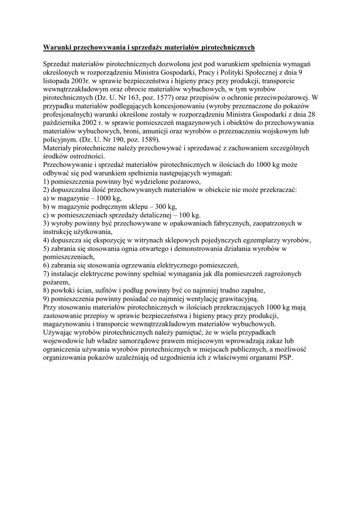 Warunki przechowywania i sprzedaŜy materiałów pirotechnicznych SprzedaŜ materiałów pirotechnicznych dozwolona jest pod warunkiem spełnienia wymagań określonych w rozporządzeniu Ministra Gospodarki, Pracy i Polityki Społecznej z dnia 9 listopada 2003r. w sprawie bezpieczeństwa i higieny pracy przy produkcji, transporcie wewnątrzzakładowym oraz obrocie materiałów wybuchowych, w tym wyrobów pirotechnicznych (Dz. U. Nr 163, poz. 1577) oraz przepisów o ochronie przeciwpoŜarowej. W przypadku materiałów podlegających koncesjonowaniu (wyroby przeznaczone do pokazów profesjonalnych) warunki określone zostały w rozporządzeniu Ministra Gospodarki z dnia 28 października 2002 r. w sprawie pomieszczeń magazynowych i obiektów do przechowywania materiałów wybuchowych, broni, amunicji oraz wyrobów o przeznaczeniu wojskowym lub policyjnym. (Dz. U. Nr 190, poz. 1589). Materiały pirotechniczne naleŜy przechowywać i sprzedawać z zachowaniem szczególnych środków ostroŜności. Przechowywanie i sprzedaŜ materiałów pirotechnicznych w ilościach do 1000 kg moŜe odbywać się pod warunkiem spełnienia następujących wymagań: 1) pomieszczenia powinny być wydzielone poŜarowo, 2) dopuszczalna ilość przechowywanych materiałów w obiekcie nie moŜe przekraczać: a) w magazynie – 1000 kg, b) w magazynie podręcznym sklepu – 300 kg, c) w pomieszczeniach sprzedaŜy detalicznej – 100 kg. 3) wyroby powinny być przechowywane w opakowaniach fabrycznych, zaopatrzonych w instrukcję uŜytkowania, 4) dopuszcza się ekspozycję w witrynach sklepowych pojedynczych egzemplarzy wyrobów, 5) zabrania się stosowania ognia otwartego i demonstrowania działania wyrobów w pomieszczeniach, 6) zabrania się stosowania ogrzewania elektrycznego pomieszczeń, 7) instalacje elektryczne powinny spełniać wymagania jak dla pomieszczeń zagroŜonych poŜarem, 8) powłoki ścian, sufitów i podług powinny być co najmniej trudno zapalne, 9) pomieszczenia powinny posiadać co najmniej wentylację grawitacyjną. Przy stosowaniu materiałów pirotechnicznych w ilościach przekraczających 1000 kg mają zastosowanie przepisy w sprawie bezpieczeństwa i higieny pracy przy produkcji, magazynowaniu i transporcie wewnątrzzakładowym materiałów wybuchowych. UŜywając wyrobów pirotechnicznych naleŜy pamiętać, Ŝe w wielu przypadkach wojewodowie lub władze samorządowe prawem miejscowym wprowadzają zakaz lub ograniczenia uŜywania wyrobów pirotechnicznych w miejscach publicznych, a moŜliwość organizowania pokazów uzaleŜniają od uzgodnienia ich z właściwymi organami PSP.