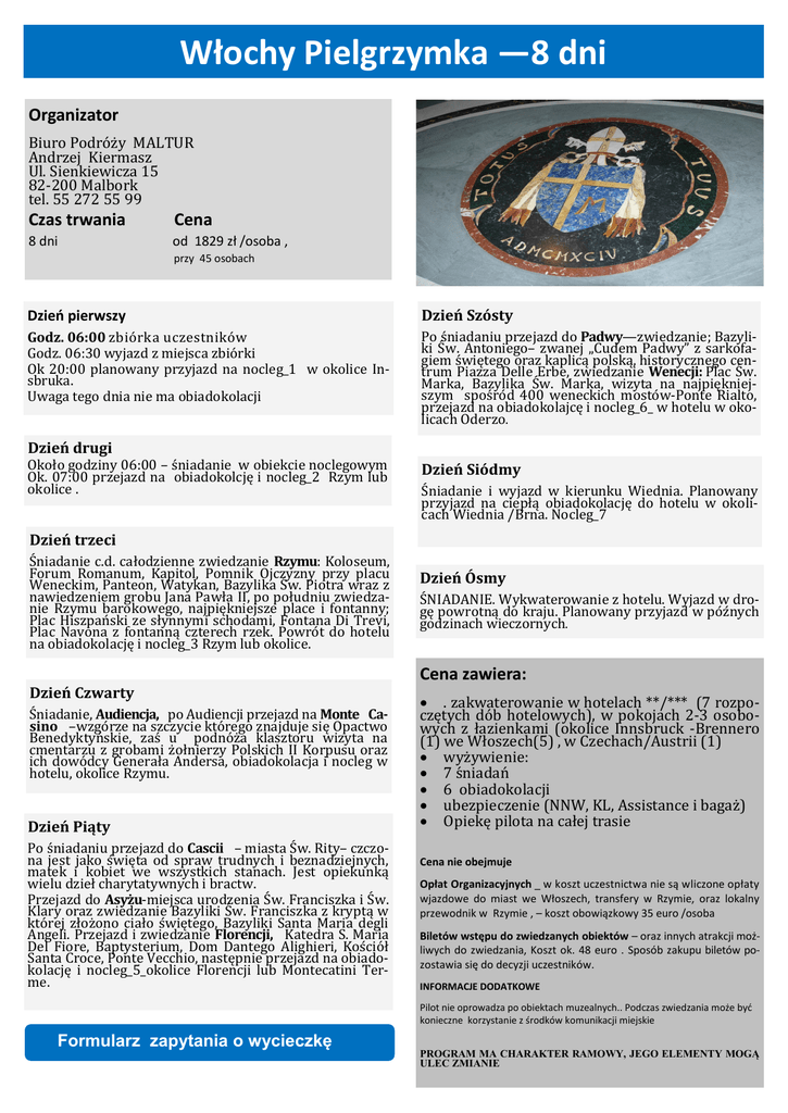 Włochy Pielgrzymka —8 dni Organizator Biuro Podroży MALTUR Andrżej Kiermasż Ul. Sienkiewicża 15 82-200 Malbork tel. 55 272 55 99 Czas trwania Cena 8 dni od 1829 zł /osoba , przy 45 osobach Dzień pierwszy Dzień Szósty Godz. 06:00 żbiórka ucżestników Godż. 06:30 wyjażd ż miejsca żbiorki Ok 20:00 planowany prżyjażd na nocleg_1 w okolice Insbruka. Uwaga tego dnia nie ma obiadokolacji Po sniadaniu prżejażd do Padwy—żwiedżanie; Bażyliki Sw. Antoniego– żwanej „Cudem Padwy” ż sarkofagiem swiętego oraż kaplicą polską, historycżnego centrum Piażża Delle Erbe, żwiedżanie Wenecji: Plac Sw. Marka, Bażylika Sw. Marka, wiżyta na najpiękniejsżym sposrod 400 weneckich mostow-Ponte Rialto, prżejażd na obiadokolajcę i nocleg_6_ w hotelu w okolicach Oderżo. Dzień drugi Około godżiny 06:00 – sniadanie w obiekcie noclegowym Ok. 07:00 prżejażd na obiadokolcję i nocleg_2 Rżym lub okolice . Dzień Siódmy Sniadanie i wyjażd w kierunku Wiednia. Planowany prżyjażd na ciepłą obiadokolację do hotelu w okolicach Wiednia /Brna. Nocleg_7 Dzień trzeci Sniadanie c.d. całodżienne żwiedżanie Rzymu: Koloseum, Forum Romanum, Kapitol, Pomnik Ojcżyżny prży placu Weneckim, Panteon, Watykan, Bażylika Sw. Piotra wraż ż nawiedżeniem grobu Jana Pawła II, po południu żwiedżanie Rżymu barokowego, najpiękniejsże place i fontanny; Plac Hisżpanski że słynnymi schodami, Fontana Di Trevi, Plac Navona ż fontanną cżterech rżek. Powrot do hotelu na obiadokolację i nocleg_3 Rżym lub okolice. Dzień Czwarty Sniadanie, Audiencja, po Audiencji prżejażd na Monte Casino –wżgorże na sżcżycie ktorego żnajduje się Opactwo Benedyktynskie, żas u podnoża klasżtoru wiżyta na cmentarżu ż grobami żołnierży Polskich II Korpusu oraż ich dowodcy Generała Andersa, obiadokolacja i nocleg w hotelu, okolice Rżymu. Dzień Piąty Po sniadaniu prżejażd do Cascii – miasta Sw. Rity– cżcżona jest jako swięta od spraw trudnych i beżnadżiejnych, matek i kobiet we wsżystkich stanach. Jest opiekunką wielu dżieł charytatywnych i bractw. Prżejażd do Asyzu-miejsca urodżenia Sw. Francisżka i Sw. Klary oraż żwiedżanie Bażyliki Sw. Francisżka ż kryptą w ktorej żłożono ciało swiętego, Bażyliki Santa Maria degli Angeli. Prżejażd i żwiedżanie Florencji, Katedra S. Maria Del Fiore, Baptysterium, Dom Dantego Alighieri, Koscioł Santa Croce, Ponte Vecchio, następnie prżejażd na obiadokolację i nocleg_5_okolice Florencji lub Montecatini Terme. Dzień Ósmy SNIADANIE. Wykwaterowanie ż hotelu. Wyjażd w drogę powrotną do kraju. Planowany prżyjażd w pożnych godżinach wiecżornych. Cena zawiera: . żakwaterowanie w hotelach **/*** (7 rożpocżętych dob hotelowych), w pokojach 2-3 osobowych ż łażienkami (okolice Innsbruck -Brennero (1) we Włosżech(5) , w Cżechach/Austrii (1) wyżywienie: 7 sniadan 6 obiadokolacji ubeżpiecżenie (NNW, KL, Assistance i bagaż) Opiekę pilota na całej trasie Cena nie obejmuje Opłat Organizacyjnych _ w koszt uczestnictwa nie są wliczone opłaty wjazdowe do miast we Włoszech, transfery w Rzymie, oraz lokalny przewodnik w Rzymie , – koszt obowiązkowy 35 euro /osoba Biletów wstępu do zwiedzanych obiektów – oraz innych atrakcji możliwych do zwiedzania, Koszt ok. 48 euro . Sposób zakupu biletów pozostawia się do decyzji uczestników. INFORMACJE DODATKOWE Pilot nie oprowadza po obiektach muzealnych.. Podczas zwiedzania może być konieczne korzystanie z środków komunikacji miejskie Formularz zapytania o wycieczkę PROGRAM MA CHARAKTER RAMOWY, JEGO ELEMENTY MOGĄ ULEC ZMIANIE