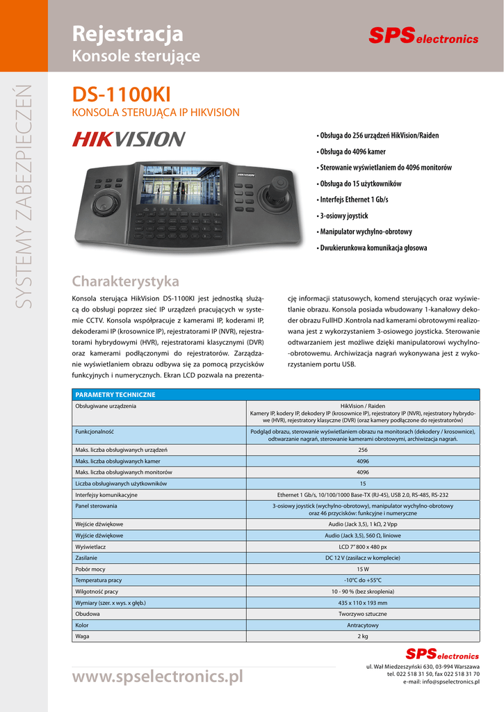Rejestracja SYSTEMY ZABEZPIECZEŃ Konsole sterujące DS-1100KI KONSOLA STERUJĄCA IP HIKVISION • Obsługa do 256 urządzeń HikVision/Raiden • Obsługa do 4096 kamer • Sterowanie wyświetlaniem do 4096 monitorów • Obsługa do 15 użytkowników • Interfejs Ethernet 1 Gb/s • 3-osiowy joystick • Manipulator wychylno-obrotowy • Dwukierunkowa komunikacja głosowa Charakterystyka Konsola sterująca HikVision DS-1100KI jest jednostką służą- cję informacji statusowych, komend sterujących oraz wyświe- cą do obsługi poprzez sieć IP urządzeń pracujących w syste- tlanie obrazu. Konsola posiada wbudowany 1-kanałowy deko- mie CCTV. Konsola współpracuje z kamerami IP, koderami IP, der obrazu FullHD .Kontrola nad kamerami obrotowymi realizo- dekoderami IP (krosownice IP), rejestratorami IP (NVR), rejestra- wana jest z wykorzystaniem 3-osiowego joysticka. Sterowanie torami hybrydowymi (HVR), rejestratorami klasycznymi (DVR) odtwarzaniem jest możliwe dzięki manipulatorowi wychylno- oraz kamerami podłączonymi do rejestratorów. Zarządza- -obrotowemu. Archiwizacja nagrań wykonywana jest z wyko- nie wyświetlaniem obrazu odbywa się za pomocą przycisków rzystaniem portu USB. funkcyjnych i numerycznych. Ekran LCD pozwala na prezentaPARAMETRY TECHNICZNE Obsługiwane urządzenia HikVision / Raiden Kamery IP, kodery IP, dekodery IP (krosownice IP), rejestratory IP (NVR), rejestratory hybrydowe (HVR), rejestratory klasyczne (DVR) (oraz kamery podłączone do rejestratorów) Funkcjonalność Podgląd obrazu, sterowanie wyświetlaniem obrazu na monitorach (dekodery / krosownice), odtwarzanie nagrań, sterowanie kamerami obrotowymi, archiwizacja nagrań. Maks. liczba obsługiwanych urządzeń 256 Maks. liczba obsługiwanych kamer 4096 Maks. liczba obsługiwanych monitorów 4096 Liczba obsługiwanych użytkowników Interfejsy komunikacyjne Panel sterowania 15 Ethernet 1 Gb/s, 10/100/1000 Base-TX (RJ-45), USB 2.0, RS-485, RS-232 3-osiowy joystick (wychylno-obrotowy), manipulator wychylno-obrotowy oraz 46 przycisków: funkcyjne i numeryczne Wejście dźwiękowe Audio (Jack 3,5), 1 kΩ, 2 Vpp Wyjście dźwiękowe Audio (Jack 3,5), 560 Ω, liniowe Wyświetlacz Zasilanie Pobór mocy Temperatura pracy Wilgotność pracy LCD 7’’ 800 x 480 px DC 12 V (zasilacz w komplecie) 15 W -10°C do +55°C 10 - 90 % (bez skroplenia) Wymiary (szer. x wys. x głęb.) 435 x 110 x 193 mm Obudowa Tworzywo sztuczne Kolor Antracytowy Waga 2 kg www.spselectronics.pl ul. Wał Miedzeszyński 630, 03-994 Warszawa tel. 022 518 31 50, fax 022 518 31 70 e-mail: [email protected]