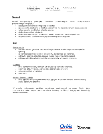 Wygląd Uczeń odbywający praktykę powinien przestrzegać zasad dotyczących poprawnego wyglądu: szczególna dbałość o higienę osobistą; ręce czyste, zadbane z krótko obciętymi, nie lakierowanymi paznokciami; włosy czyste, krótkie lub gładko spięte; delikatny makijaż lub brak; delikatny zapach (np. dyskretna woda toaletowa zamiast perfum); dopuszczalna biżuteria to wyłącznie obrączka i zegarek. Strój Restauracja koszula: biała, gładka, bez wzorów (w okresie letnim dopuszcza się krótki rękaw), spódnica/spodnie: czarne, krój prosty, (spódnica do kolana), półbuty: czarne, gładkie, (panie mogą mieć niewielki obcas), rajstopy cienkie w kolorze cielistym, skarpety w kolorze czarnym. Kuchnia strój ochronny: biały fartuch lub bluza i spodnie kucharskie, nakrycie głowy: białe, całkowicie zasłaniające włosy, obuwie: pełne, wygodne, zapaska. Recepcja oraz pokoje strój zgodny z wymogami obowiązującymi w danym hotelu lub wskazany przez opiekuna praktyk. W czasie odbywania praktyk, uczniowie postrzegani są przez Gości jako pracownicy, więc swym zachowaniem, kulturą osobistą i wyglądem kształtują wizerunek hotelu.