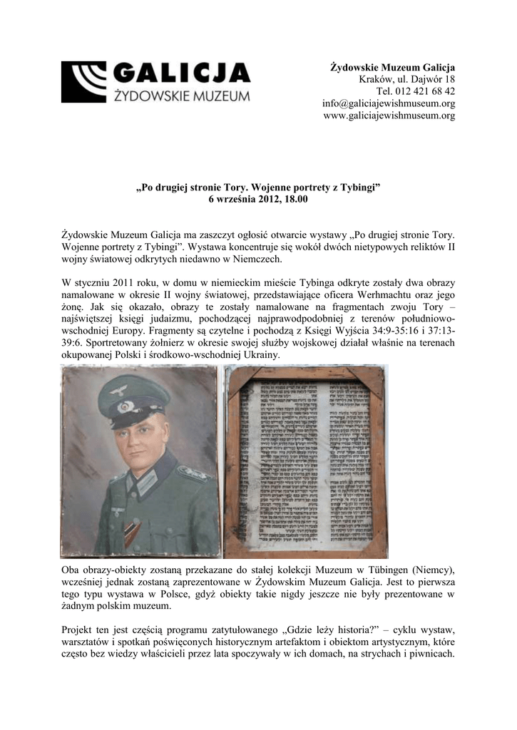 Żydowskie Muzeum Galicja Kraków, ul. Dajwór 18 Tel. 012 421 68 42 [email protected] www.galiciajewishmuseum.org „Po drugiej stronie Tory. Wojenne portrety z Tybingi” 6 września 2012, 18.00 Żydowskie Muzeum Galicja ma zaszczyt ogłosić otwarcie wystawy „Po drugiej stronie Tory. Wojenne portrety z Tybingi”. Wystawa koncentruje się wokół dwóch nietypowych reliktów II wojny światowej odkrytych niedawno w Niemczech. W styczniu 2011 roku, w domu w niemieckim mieście Tybinga odkryte zostały dwa obrazy namalowane w okresie II wojny światowej, przedstawiające oficera Werhmachtu oraz jego żonę. Jak się okazało, obrazy te zostały namalowane na fragmentach zwoju Tory – najświętszej księgi judaizmu, pochodzącej najprawodpodobniej z terenów południowowschodniej Europy. Fragmenty są czytelne i pochodzą z Księgi Wyjścia 34:9-35:16 i 37:1339:6. Sportretowany żołnierz w okresie swojej służby wojskowej działał właśnie na terenach okupowanej Polski i środkowo-wschodniej Ukrainy. Oba obrazy-obiekty zostaną przekazane do stałej kolekcji Muzeum w Tübingen (Niemcy), wcześniej jednak zostaną zaprezentowane w Żydowskim Muzeum Galicja. Jest to pierwsza tego typu wystawa w Polsce, gdyż obiekty takie nigdy jeszcze nie były prezentowane w żadnym polskim muzeum. Projekt ten jest częścią programu zatytułowanego „Gdzie leży historia?” – cyklu wystaw, warsztatów i spotkań poświęconych historycznym artefaktom i obiektom artystycznym, które często bez wiedzy właścicieli przez lata spoczywały w ich domach, na strychach i piwnicach. Bardzo często obiekty te, na pierwszy rzut oka uznawane za bezużyteczne, mają ogromną wartość – symboliczną i historyczną. Poprzez ten program chcemy zachęcić do poszukiwań, a ze znalezionych obiektów stworzyć wystawę, dokumentującą losy znanych i nieznanych osób, których historie właśnie poprzez te zachowane przedmioty przeplatają się dziś z naszą. Wystawa obrazów namalowanych na zwojach Tory ma ogromne znaczenie na wielu poziomach. Dla wyznawców judaizmu Tora jest świętą księgą, której należy się ogromny szacunek. Dla katolików teksty składajace się na hebrajską Torę wchodzą w skład Starego Testamentu, mają więc dla nich nie mniej ważne znaczenie. Desakralizacja, jaka spotkała te dwa fragmenty Pisma, dotyka więc w równym stopniu żydów jak i katolików. Obiekty te są więc symbolami zagłady totalnej, która wydarzyła się 70 lat temu w Europie, Zagłady, która dotknęła przede wszystkim Żydów, ale również ludzi innych wyznań – w tym katolickich księży. Fakt użycia tych przedmiotów w takim, a nie innym celu – uwiecznienia portretu oprawcy na najważniejszym dla jego ofiar symbolu – unaocznia też to, iż Zagłada miała dotyczyć nie tylko ludzi, ale całych systemów wartości. „Istnieje tylko kilka historycznych pozostałości po Zagładzie, które w podobny sposób fizycznie i symbolicznie łączą kultury oprawcy i ofiary jak te namalowane na zwojach Tory” mówi główny kurator wystawy Jason Francisco. „Na jednej stronie widzimy twarz nazistowskiej arogancji i to nie przez ciemny mundur SS i swastykę, a przez niepokojąco normalnie wyglądające twarze przystojnego oficera armi niemieckiej, i jego młodej, uśmiechniętej żony. Na odwrocie czytamy jeden z najbardziej podniosłych fragmentów w całej Torze: odnowienie przymierza” zauważa Francisco. Obrazy te dziś są zatem niezwykłym przykładem tego, do czego zdolny jest człowiek. W okresie okupacji nazistowskie Niemcy masowo wykorzystywały przedmioty należące do ofiar: okulary i ubrania należące do zamordowanych Żydów były rozdzielane pomiędzy niemieckich cywilów i żołnierzy, przedmioty wartościowe przechodziły na własność niemieckich władz. Wykorzystywano również ciała samych ofiar – włosy zamordowanych używane były między innymi w przemyśle. Największa liczba ofiar Holokaustu została zamordowana w 1942 roku – dziś, dokładnie 70 lat później – poprzez tę wystawę pragniemy pokazać nie tylko skalę tej zbrodni, ale również jej różne aspekty w bardzo osobistym wymiarze: na przykładzie historii konkretnych osób i konkretnych przedmiotów. Za pomocą tych obiektów Żydowskie Muzeum Galicja pragnie również poruszyć temat zagrabionych dóbr materialnych, z których wiele nigdy nie wróciło do swoich właścicieli. Dzieła sztuki, antyki, obiekty kultu – wszelkie przedmioty wartościowe pochodzące z podbitych terenów były albo zagrabiane przez nazistów albo niszczone – działania te wyrażały całkowitą supremację oprawców i upokorzenie ofiar. Obiektom towarzyszą teksty historyczne oraz nagrania audio zawierające rozmowy autorów wystawy z osobami pochodzącymi z różnych kręgów kulturowych: rabinem, klerykiem, młodymi Niemcami, Polakami oraz członkami żydowskiej społeczności Krakowa, ocalonymi z Holokaustu, artystami i dziennikarzami. Wszyscy zapytani zostali o kilka rzeczy związanych z tymi obiektami: czym one dla nich są, co symbolizują, co powinno się w ich przekonaniu z nimi zrobić. Ponadto odwiedzający będą też mogli nagrać swoje przemyślenia i reakcje związane z wystawą na odpowiednio przygotowanym stanowisku. Wystawa została przygotowana przez światowej sławy kuratora, prof. Jasona Francisco ze Stanów Zjednaczonych. Za warstwę merytoryczną odpowiada Żydowskie Muzuem Galicja. Otwarcie wystawy odbędzie się 6 września o godzinie 18.00. Ekspozycję będzie można oglądać do 6 listopada. Patroni honorowi: Prezydent Miasta Krakowa Jacek Majchrowski Konsulat Generalny Republiki Federalnej Niemiec w Krakowie Konsulat Generalny Stanów Zjednoczonych Patroni medialni: Radio Kraków TVP Kraków New Eastern Europe Kontakt: Tomasz Strug Kierownik działu wystaw Żydowskie Muzeum Galicja ul. Dajwór 18 31-052 Kraków Tel/Fax: (0048) 12 421 68 42 [email protected] Natalia Oleksy Kierownik sekcji 