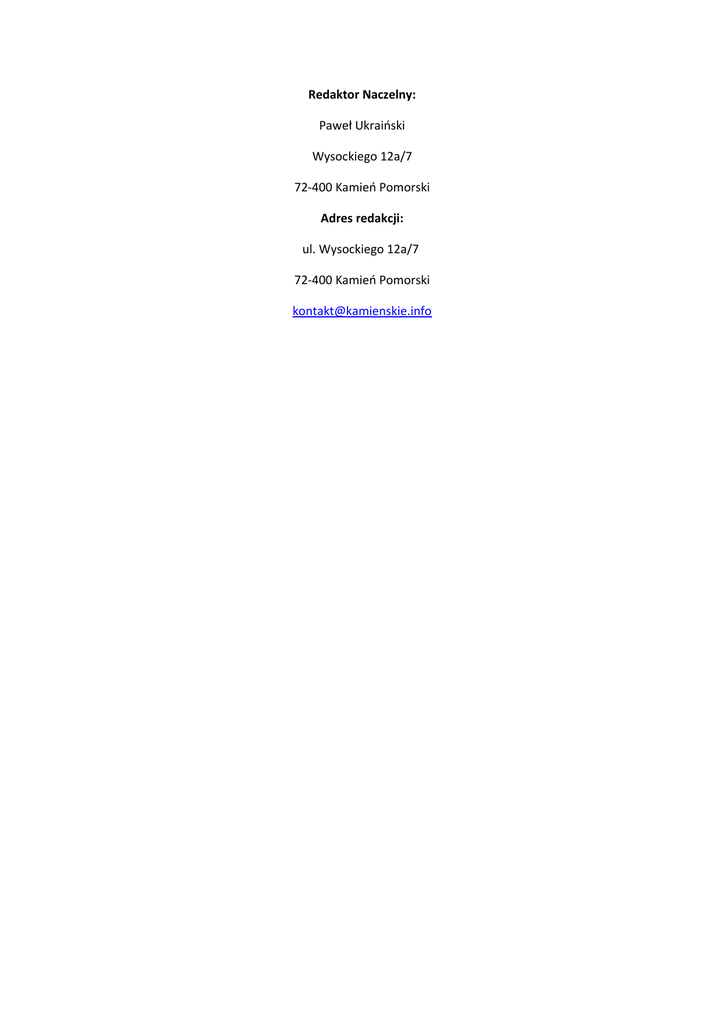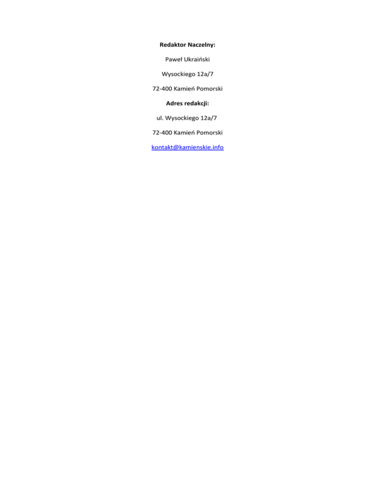 Redaktor Naczelny: Paweł Ukraiński Wysockiego 12a/7 72-400 Kamień Pomorski Adres redakcji: ul. Wysockiego 12a/7 72-400 Kamień Pomorski [email protected]