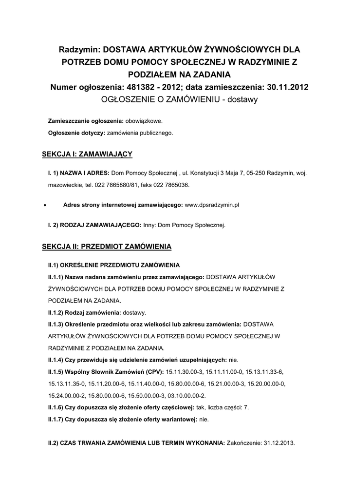 Radzymin: DOSTAWA ARTYKUŁÓW ŻYWNOŚCIOWYCH DLA POTRZEB DOMU POMOCY SPOŁECZNEJ W RADZYMINIE Z PODZIAŁEM NA ZADANIA Numer ogłoszenia: 481382 - 2012; data zamieszczenia: 30.11.2012 OGŁOSZENIE O ZAMÓWIENIU - dostawy Zamieszczanie ogłoszenia: obowiązkowe. Ogłoszenie dotyczy: zamówienia publicznego. SEKCJA I: ZAMAWIAJĄCY I. 1) NAZWA I ADRES: Dom Pomocy Społecznej , ul. Konstytucji 3 Maja 7, 05-250 Radzymin, woj. mazowieckie, tel. 022 7865880/81, faks 022 7865036. Adres strony internetowej zamawiającego: www.dpsradzymin.pl I. 2) RODZAJ ZAMAWIAJĄCEGO: Inny: Dom Pomocy Społecznej. SEKCJA II: PRZEDMIOT ZAMÓWIENIA II.1) OKREŚLENIE PRZEDMIOTU ZAMÓWIENIA II.1.1) Nazwa nadana zamówieniu przez zamawiającego: DOSTAWA ARTYKUŁÓW ŻYWNOŚCIOWYCH DLA POTRZEB DOMU POMOCY SPOŁECZNEJ W RADZYMINIE Z PODZIAŁEM NA ZADANIA. II.1.2) Rodzaj zamówienia: dostawy. II.1.3) Określenie przedmiotu oraz wielkości lub zakresu zamówienia: DOSTAWA ARTYKUŁÓW ŻYWNOŚCIOWYCH DLA POTRZEB DOMU POMOCY SPOŁECZNEJ W RADZYMINIE Z PODZIAŁEM NA ZADANIA. II.1.4) Czy przewiduje się udzielenie zamówień uzupełniających: nie. II.1.5) Wspólny Słownik Zamówień (CPV): 15.11.30.00-3, 15.11.11.00-0, 15.13.11.33-6, 15.13.11.35-0, 15.11.20.00-6, 15.11.40.00-0, 15.80.00.00-6, 15.21.00.00-3, 15.20.00.00-0, 15.24.00.00-2, 15.80.00.00-6, 15.50.00.00-3, 03.10.00.00-2. II.1.6) Czy dopuszcza się złożenie oferty częściowej: tak, liczba części: 7. II.1.7) Czy dopuszcza się złożenie oferty wariantowej: nie. II.2) CZAS TRWANIA ZAMÓWIENIA LUB TERMIN WYKONANIA: Zakończenie: 31.12.2013. SEKCJA III: INFORMACJE O CHARAKTERZE PRAWNYM, EKONOMICZNYM, FINANSOWYM I TECHNICZNYM III.2) ZALICZKI Czy przewiduje się udzielenie zaliczek na poczet wykonania zamówienia: nie III.3) WARUNKI UDZIAŁU W POSTĘPOWANIU ORAZ OPIS SPOSOBU DOKONYWANIA OCENY SPEŁNIANIA TYCH WARUNKÓW III. 3.1) Uprawnienia do wykonywania określonej działalności lub czynności, jeżeli przepisy prawa nakładają obowiązek ich posiadania Opis sposobu dokonywania oceny spełniania tego warunku o Oferent spełnia warunek na podstawie załączonych do oferty dokumentów. III.3.2) Wiedza i doświadczenie Opis sposobu dokonywania oceny spełniania tego warunku o Oferent spełnia warunek na podstawie załączonych do oferty dokumentów. III.3.3) Potencjał techniczny Opis sposobu dokonywania oceny spełniania tego warunku o Oferent spełnia warunek na podstawie załączonych do oferty dokumentów. III.3.4) Osoby zdolne do wykonania zamówienia Opis sposobu dokonywania oceny spełniania tego warunku o Oferent spełnia warunek na podstawie załączonych do oferty dokumentów. III.3.5) Sytuacja ekonomiczna i finansowa Opis sposobu dokonywania oceny spełniania tego warunku o Oferent spełnia warunek na podstawie załączonych do oferty dokumentów. III.4) INFORMACJA O OŚWIADCZENIACH LUB DOKUMENTACH, JAKIE MAJĄ DOSTARCZYĆ WYKONAWCY W CELU POTWIERDZENIA SPEŁNIANIA WARUNKÓW UDZIAŁU W POSTĘPOWANIU ORAZ NIEPODLEGANIA WYKLUCZENIU NA PODSTAWIE ART. 24 UST. 1 USTAWY III.4.1) W zakresie wykazania spełniania przez wykonawcę warunków, o których mowa w art. 22 ust. 1 ustawy, oprócz oświadczenia o spełnieniu warunków udziału w postępowaniu, należy przedłożyć: III.4.2) W zakresie potwierdzenia niepodlegania wykluczeniu na podstawie art. 24 ust. 1 ustawy, należy przedłożyć: oświadczenie o braku podstaw do wykluczenia aktualny odpis z właściwego rejestru, jeżeli odrębne przepisy wymagają wpisu do rejestru, w celu wykazania braku podstaw do wykluczenia w oparciu o art. 24 ust. 1 pkt 2 ustawy, wystawiony nie wcześniej niż 6 miesięcy przed upływem terminu składania wniosków o dopuszczenie do udziału w postępowaniu o udzielenie zamówienia albo składania ofert, a w stosunku do osób fizycznych oświadczenie w zakresie art. 24 ust. 1 pkt 2 ustawy wykonawca powołujący się przy wykazywaniu spełniania warunków udziału w postępowaniu na potencjał innych podmiotów, które będą brały udział w realizacji części zamówienia, przedkłada także dokumenty dotyczące tego podmiotu w zakresie wymaganym dla wykonawcy, określonym w pkt III.4.2. III.4.3) Dokumenty podmiotów zagranicznych Jeżeli wykonawca ma siedzibę lub miejsce zamieszkania poza terytorium Rzeczypospolitej Polskiej, przedkłada: III.4.3.1) dokument wystawiony w kraju, w którym ma siedzibę lub miejsce zamieszkania potwierdzający, że: nie otwarto jego likwidacji ani nie ogłoszono upadłości - wystawiony nie wcześniej niż 6 miesięcy przed upływem terminu składania wniosków o dopuszczenie do udziału w postępowaniu o udzielenie zamówienia albo składania ofert III.6) INNE DOKUMENTY Inne dokumenty niewymienione w pkt III.4) albo w pkt III.5) a) próbki towarów zgodnie z załącznikami do SIWZ. - inne dokumenty: a) Zaakceptowane istotne postanowienia umowy. b) Wypełniony i podpisany formularz oferty i cenowy wraz z załącznikami. III.7) Czy ogranicza się możliwość ubiegania się o zamówienie publiczne tylko dla wykonawców, u których ponad 50 % pracowników stanowią osoby niepełnosprawne: nie SEKCJA IV: PROCEDURA IV.1) TRYB UDZIELENIA ZAMÓWIENIA IV.1.1) Tryb udzielenia zamówienia: przetarg nieograniczony. IV.2) KRYTERIA OCENY OFERT IV.2.2) Czy przeprowadzona będzie aukcja elektroniczna: nie. IV.3) ZMIANA UMOWY Czy przewiduje się istotne zmiany postanowień zawartej umowy w stosunku do treści oferty, na podstawie której dokonano wyboru wykonawcy: tak Dopuszczalne zmiany postanowień umowy oraz określenie warunków zmian 1. Ceny zaoferowane w formularzu cenowym mogą być waloryzowane o wskaźnik wzrostu i spadku cen towarów i usług raz do roku, po uprzednim pisemnym zawiadomieniu o tym fakcie zamawiającego i otrzymaniu jego zgody. 2. W szczególnych sytuacjach niemożliwych do przewidzenia w dniu podpisania umowy (drastyczny wzrost cen produktów w całym kraju) ceny mogą ulec zmianie tylko jeden raz o inny wskaźnik. IV.4) INFORMACJE A