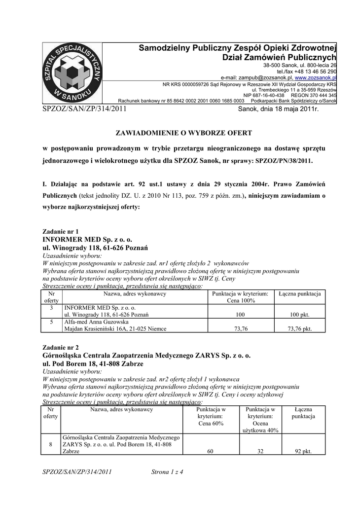Samodzielny Publiczny Zespół Opieki Zdrowotnej Dział Zamówień Publicznych 38-500 Sanok, ul. 800-lecia 26 tel./fax +48 13 46 56 290 e-mail: [email protected], www.zozsanok.pl NR KRS 0000059726 Sąd Rejonowy w Rzeszowie XII Wydział Gospodarczy KRS ul. Trembeckiego 11 a 35-959 Rzeszów NIP 687-16-40-438 REGON 370 444 345 Rachunek bankowy nr 85 8642 0002 2001 0060 1685 0003 Podkarpacki Bank Spółdzielczy o/Sanok SPZOZ/SAN/ZP/314/2011 Sanok, dnia 18 maja 2011r. ZAWIADOMIENIE O WYBORZE OFERT w postępowaniu prowadzonym w trybie przetargu nieograniczonego na dostawę sprzętu jednorazowego i wielokrotnego użytku dla SPZOZ Sanok, nr sprawy: SPZOZ/PN/38/2011. I. Działając na podstawie art. 92 ust.1 ustawy z dnia 29 stycznia 2004r. Prawo Zamówień Publicznych (tekst jednolity DZ. U. z 2010 Nr 113, poz. 759 z późn. zm.), niniejszym zawiadamiam o wyborze najkorzystniejszej oferty: Zadanie nr 1 INFORMER MED Sp. z o. o. ul. Winogrady 118, 61-626 Poznań Uzasadnienie wyboru: W niniejszym postępowaniu w zakresie zad. nr1 ofertę złożyło 2 wykonawców Wybrana oferta stanowi najkorzystniejszą prawidłowo złożoną ofertę w niniejszym postępowaniu na podstawie kryteriów oceny wyboru ofert określonych w SIWZ tj. Ceny Streszczenie oceny i punktacja, przedstawia się następująco: Nr Nazwa, adres wykonawcy oferty 3 INFORMER MED Sp. z o. o. ul. Winogrady 118, 61-626 Poznań 5 Alfa-med Anna Guzowska Majdan Krasieniński 16A, 21-025 Niemce Punktacja w kryterium: Cena 100% Łączna punktacja 100 100 pkt. 73,76 73,76 pkt. Zadanie nr 2 Górnośląska Centrala Zaopatrzenia Medycznego ZARYS Sp. z o. o. ul. Pod Borem 18, 41-808 Zabrze Uzasadnienie wyboru: W niniejszym postępowaniu w zakresie zad. nr2 ofertę złożył 1 wykonawca Wybrana oferta stanowi najkorzystniejszą prawidłowo złożoną ofertę w niniejszym postępowaniu na podstawie kryteriów oceny wyboru ofert określonych w SIWZ tj. Ceny i oceny użytkowej Streszczenie oceny i punktacja, przedstawia się następująco: Nr oferty 8 Nazwa, adres wykonawcy Górnośląska Centrala Zaopatrzenia Medycznego ZARYS Sp. z o. o. ul. Pod Borem 18, 41-808 Zabrze SPZOZ/SAN/ZP/314/2011 Strona 1 z 4 Punktacja w kryterium: Cena 60% Punktacja w kryterium: Ocena użytkowa 40% Łączna punktacja 60 32 92 pkt. Zadanie nr 3 Górnośląska Centrala Zaopatrzenia Medycznego ZARYS Sp. z o. o. ul. Pod Borem 18, 41-808 Zabrze Uzasadnienie wyboru: W niniejszym postępowaniu w zakresie zad. nr3 ofertę złożył 1 wykonawca Wybrana oferta stanowi najkorzystniejszą prawidłowo złożoną ofertę w niniejszym postępowaniu na podstawie kryteriów oceny wyboru ofert określonych w SIWZ tj. Ceny i oceny użytkowej Streszczenie oceny i punktacja, przedstawia się następująco: Nr oferty 8 Nazwa, adres wykonawcy Górnośląska Centrala Zaopatrzenia Medycznego ZARYS Sp. z o. o. ul. Pod Borem 18, 41-808 Zabrze Punktacja w kryterium: Cena 60% Punktacja w kryterium: Ocena użytkowa 40% Łączna punktacja 60 40 100 pkt. Zadanie nr 4 Górnośląska Centrala Zaopatrzenia Medycznego ZARYS Sp. z o. o. ul. Pod Borem 18, 41-808 Zabrze Uzasadnienie wyboru: W niniejszym postępowaniu w zakresie zad. nr4 ofertę złożyło 2 wykonawców Wybrana oferta stanowi najkorzystniejszą prawidłowo złożoną ofertę w niniejszym postępowaniu na podstawie kryteriów oceny wyboru ofert określonych w SIWZ tj. Ceny i oceny użytkowej Streszczenie oceny i punktacja, przedstawia się następująco: Nr oferty 4 8 Nazwa, adres wykonawcy TRIDENT MED s. c. ul. Nowy Świat 60/13, 00-357 Warszawa Górnośląska Centrala Zaopatrzenia Medycznego ZARYS Sp. z o. o. ul. Pod Borem 18, 41-808 Zabrze Punktacja w kryterium: Cena 60% Punktacja w kryterium: Ocena użytkowa 40% Łączna punktacja 49,99 32 81,99 pkt. 60 40 100 pkt. Zadanie nr 5 BERYL MED Ltd. 72 NEW BOND STREET, MAYFAIR, LONDON W1S 1RR, Wielka Brytania adres do korespondencji: ul. Racławicka 46/6, 30-017 Kraków Uzasadnienie wyboru: W niniejszym postępowaniu w zakresie zad. nr5 ofertę złożyło 2 wykonawców Wybrana oferta stanowi najkorzystniejszą prawidłowo złożoną ofertę w niniejszym postępowaniu na podstawie kryteriów oceny wyboru ofert określonych w SIWZ tj. Ceny i oceny użytkowej Streszczenie oceny i punktacja, przedstawia się następująco: Nr oferty 1 8 Nazwa, adres wykonawcy BERYL MED Ltd. 72 NEW BOND STREET, MAYFAIR, LONDON W1S 1RR, Wielka Brytania adres do korespondencji: ul. Racławicka 46/6, 30-017 Kraków Górnośląska Centrala Zaopatrzenia Medycznego ZARYS Sp. z o. o. ul. Pod Borem 18, 41-808 Zabrze SPZOZ/SAN/ZP/314/2011 Strona 2 z 4 Punktacja w kryterium: Cena 60% Punktacja w kryterium: Ocena użytkowa 40% Łączna punktacja 60 40 100pkt. 54,98 40 94,98 pkt. Zadanie nr 6 Covidien Polska Sp. z o. o. Al. Jerozolimskie 162, 02-342 Warszawa Uzasadnienie wyboru: W niniejszym postępowaniu w zakresie zad. nr 6 ofertę złożył 1 wykonawca Wybrana oferta stanowi najkorzystniejszą prawidłowo złożoną ofertę w niniejszym postępowaniu na podstawie kryteriów oceny wyboru ofert określonych w SIWZ tj. Ceny Streszczenie oceny i punktacja, przedstawia się następująco: Nr oferty 7 Nazwa, adres wykonawcy Punktacja w kryterium: Cena 100% Łączna punktacja 100 100 pkt. Covidien Polska Sp. z o. o. Al. Jerozolimskie 162, 02-342 Warszawa Zadanie nr 7 Przedsiębiorstwo Handlowe MEDRES Zbigniew Majcher ul. Torowa 3, 35-205 Rzeszów Uzasadnienie wyboru: W niniejszym postępowaniu w zakresie zad. nr 7 ofertę złożyło 2 wykonawców Wybrana oferta stanowi najkorzystniejszą prawidłowo złożoną ofertę w niniejszym postępowaniu na podstawie kryteriów oceny wyboru ofert określonych w SIWZ tj. Ceny Streszczenie oceny i punktacja, przedstawia się następująco: Nr oferty 6 8 Nazwa, adres wykonawcy Przedsiębiorstwo Handlowe MEDRES Zbigniew Majcher ul. Torowa 3, 35-205 Rzeszów Górnośląska Centrala Zaopatrzenia Medycznego ZARYS Sp. z o. o. ul. Pod Borem 18, 41-808 Zabrze Punktacja w kryterium: Cena 100% Łączna punkta