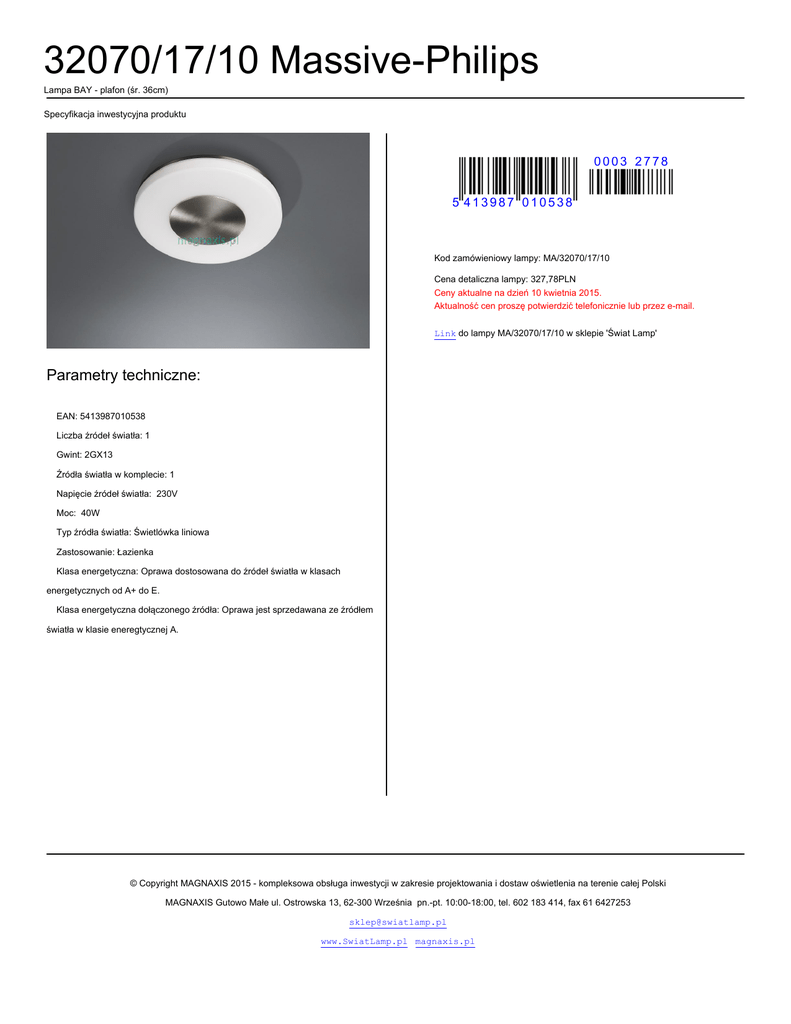 32070/17/10 Massive-Philips Lampa BAY - plafon (śr. 36cm) Specyfikacja inwestycyjna produktu 0003 2778 5 413987 010538 Kod zamówieniowy lampy: MA/32070/17/10 Cena detaliczna lampy: 327,78PLN Ceny aktualne na dzień 10 kwietnia 2015. Aktualność cen proszę potwierdzić telefonicznie lub przez e-mail. Link do lampy MA/32070/17/10 w sklepie 'Świat Lamp' Parametry techniczne: EAN: 5413987010538 Liczba źródeł światła: 1 Gwint: 2GX13 Źródła światła w komplecie: 1 Napięcie źródeł światła: 230V Moc: 40W Typ źródła światła: Świetlówka liniowa Zastosowanie: Łazienka Klasa energetyczna: Oprawa dostosowana do źródeł światła w klasach energetycznych od A+ do E. Klasa energetyczna dołączonego źródła: Oprawa jest sprzedawana ze źródłem światła w klasie eneregtycznej A. © Copyright MAGNAXIS 2015 - kompleksowa obsługa inwestycji w zakresie projektowania i dostaw oświetlenia na terenie całej Polski MAGNAXIS Gutowo Małe ul. Ostrowska 13, 62-300 Września pn.-pt. 10:00-18:00, tel. 602 183 414, fax 61 6427253 [email protected] www.SwiatLamp.pl magnaxis.pl