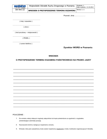 Wojewódzki Ośrodek Ruchu Drogowego w Poznaniu OK-WO-22 WNIOSEK O PRZYSPIESZENIE TERMINU EGZAMINU Wydanie: 1 Data wydania: 12.10.2012 Strona 1 z 1 Poznań, dnia ……………… …………………………………………… ( imię i nazwisko ) …………………………………………… ( ulica ) …………………………………………… ( kod pocztowy – miejscowość ) …………………………………………… ( PESEL ) …………………………………………… ( numer telefonu ) Dyrektor WORD w Poznaniu WNIOSEK O PRZYSPIESZENIE TERMINU EGZAMINU PAŃSTWOWEGO NA PRAWO JAZDY ___________________________________________________________________ ___________________________________________________________________ ___________________________________________________________________ ___________________________________________________________________ ___________________________________________________________________ ___________________________________________________________________ ___________________________________________________________________ ___________________________________________________________________ ___________________________________________________________________ ___________________________________________________________________ ___________________________________________________________________ ___________________________________________________________________ POUCZENIE : 1. Do wniosku naleŜy dołączyć oryginały załączników lub kopie potwierdzone za zgodność z oryginałem, potwierdzające zaistniałą sytuację. 2. Wyznaczenie terminu nastąpi po rozpatrzeniu wniosku. 3. Wniosek, który jest uzasadniony moŜe zostać rozpatrzony negatywnie z braku moŜliwości organizacyjnych Ośrodka.