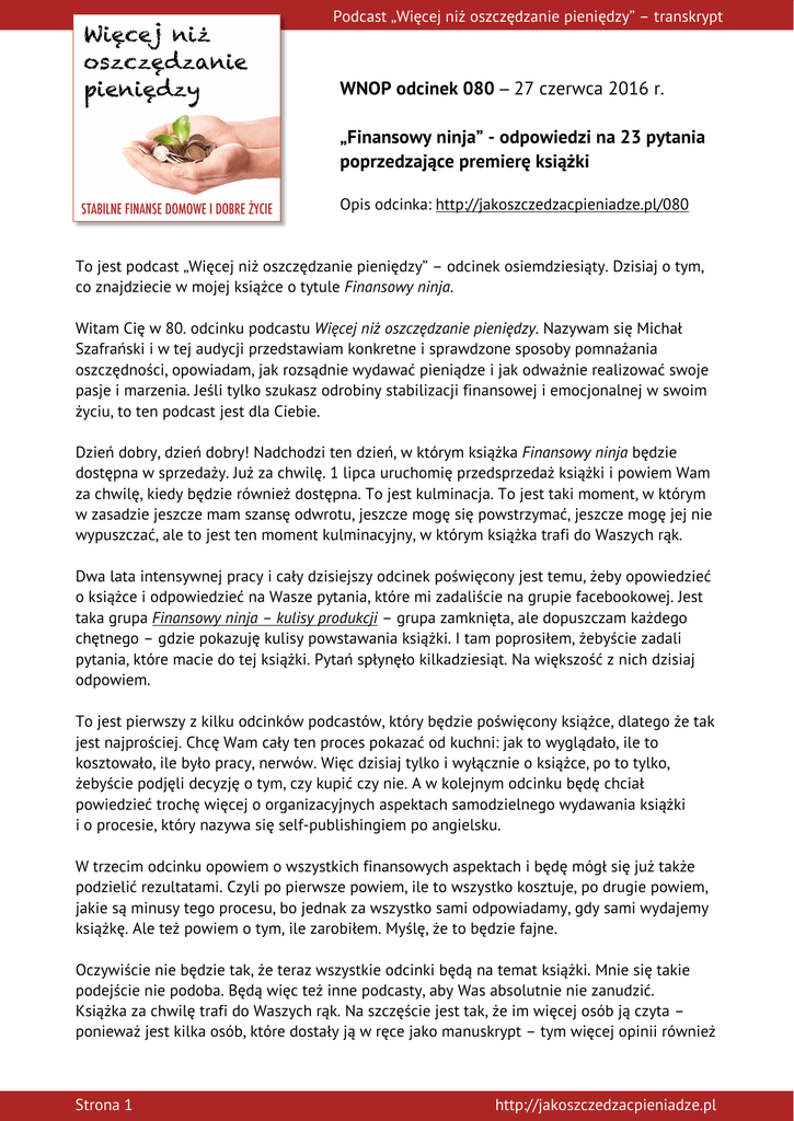 Podcast „Więcej niż oszczędzanie pieniędzy” – transkrypt WNOP odcinek 080 – 27 czerwca 2016 r. „Finansowy ninja” - odpowiedzi na 23 pytania poprzedzające premierę książki Opis odcinka: http://jakoszczedzacpieniadze.pl/080 To jest podcast „Więcej niż oszczędzanie pieniędzy” – odcinek osiemdziesiąty. Dzisiaj o tym, co znajdziecie w mojej książce o tytule Finansowy ninja. Witam Cię w 80. odcinku podcastu Więcej niż oszczędzanie pieniędzy. Nazywam się Michał Szafrański i w tej audycji przedstawiam konkretne i sprawdzone sposoby pomnażania oszczędności, opowiadam, jak rozsądnie wydawać pieniądze i jak odważnie realizować swoje pasje i marzenia. Jeśli tylko szukasz odrobiny stabilizacji finansowej i emocjonalnej w swoim życiu, to ten podcast jest dla Ciebie. Dzień dobry, dzień dobry! Nadchodzi ten dzień, w którym książka Finansowy ninja będzie dostępna w sprzedaży. Już za chwilę. 1 lipca uruchomię przedsprzedaż książki i powiem Wam za chwilę, kiedy będzie również dostępna. To jest kulminacja. To jest taki moment, w którym w zasadzie jeszcze mam szansę odwrotu, jeszcze mogę się powstrzymać, jeszcze mogę jej nie wypuszczać, ale to jest ten moment kulminacyjny, w którym książka trafi do Waszych rąk. Dwa lata intensywnej pracy i cały dzisiejszy odcinek poświęcony jest temu, żeby opowiedzieć o książce i odpowiedzieć na Wasze pytania, które mi zadaliście na grupie facebookowej. Jest taka grupa Finansowy ninja – kulisy produkcji – grupa zamknięta, ale dopuszczam każdego chętnego – gdzie pokazuję kulisy powstawania książki. I tam poprosiłem, żebyście zadali pytania, które macie do tej książki. Pytań spłynęło kilkadziesiąt. Na większość z nich dzisiaj odpowiem. To jest pierwszy z kilku odcinków podcastów, który będzie poświęcony książce, dlatego że tak jest najprościej. Chcę Wam cały ten proces pokazać od kuchni: jak to wyglądało, ile to kosztowało, ile było pracy, nerwów. Więc dzisiaj tylko i wyłącznie o książce, po to tylko, żebyście podjęli decyzję o tym, czy kupić czy nie. A w kolejnym odcinku będę chciał powiedzieć trochę więcej o organizacyjnych aspektach samodzielnego wydawania książki i o procesie, który nazywa się self-publishingiem po angielsku. W trzecim odcinku opowiem o wszystkich finansowych aspektach i będę mógł się już także podzielić rezultatami. Czyli po pierwsze powiem, ile to wszystko kosztuje, po drugie powiem, jakie są minusy tego procesu, bo jednak za wszystko sami odpowiadamy, gdy sami wydajemy książkę. Ale też powiem o tym, ile zarobiłem. Myślę, że to będzie fajne. Oczywiście nie będzie tak, że teraz wszystkie odcinki będą na temat książki. Mnie się takie podejście nie podoba. Będą więc też inne podcasty, aby Was absolutnie nie zanudzić. Książka za chwilę trafi do Waszych rąk. Na szczęście jest tak, że im więcej osób ją czyta – ponieważ jest kilka osób, które dostały ją w ręce jako manuskrypt – tym więcej opinii również Strona 1 http://jakoszczedzacpieniadze.pl Podcast „Więcej niż oszczędzanie pieniędzy” – transkrypt dostaję. Kilka osób już takie opinie mi przesłało i te opinie są zadowalające na tyle, żebym się troszeczkę uspokoił wewnętrznie. Zawsze dla autora jest dużym stresem, kiedy książka ukazuje się na rynku – czy zostanie zaakceptowana, czy zostanie obowiązkową lekturą, fajną, przydatną, wartą ceny, którą za nią się zapłaci, czy też nie; czy zdecydowanie nie należy jej polecić. Marek, który przeczytał już większość książki, napisał mi wczoraj komentarz, kiedy napisałem mu „Miłego wieczoru”. „Miłego? Nie wiem, czy dzisiaj zasnę. To jest taki Wilk z Wall Street z punktu widzenia konsumenta”. Serce mi po prostu urosło, jak przeczytałem ten komentarz. Nie będę przedłużał i przechodzę do Waszych pytań. Po kolei na nie odpowiadam. Komplet pytań na temat książki Finansowy ninja. 1. Czego dotyczy książka? Prośba o podsumowanie najważniejszych rozdziałów. Książkę napisałem w taki sposób, żeby składała się z kilku części. Każda z nich jest niezależna, ale zaczynamy od tego, że część pierwszą mogę określić jako trening finansowego ninja. Trening takiej osoby, która chciałaby być osobą bezpieczną finansowo, sprawnie poruszającą się po świecie finansów osobistych, i ten trening to jest przede wszystkim praca nad motywacją, nad podejściem do pieniędzy z jednej strony, z drugiej – próba określenia celów, czy to oszczędzania, czy ogólnie posiadania większej ilości pieniędzy na kontach, i planowanie długofalowe. Ten trening to jest podstawa, czyli odpowiedź na pytanie, dlaczego w ogóle chcemy oszczędzać albo dlaczego chcemy mieć więcej pieniędzy, jak można się do określenia takich celów przymierzyć. To się również przewijało u mnie w podcastach, ale w książce zebrałem to w dosyć spójny sposób. To jest tylko wstęp. Druga część jest już bardzo merytoryczna. Jakby pierwsza nie była… Ale druga jest już bardziej narzędziowa, bo w drugiej części omawiam arsenał finansowego ninja, czyli wszystkie podstawowe narzędzia, którymi przychodzi posługiwać się osobie dbającej o stan swoich finansów. To z jednej strony, czyli tłumaczę, co to jest kalkulator finansowy, budżet domowy, jak się nimi posługiwać, jak planować, jak weryfikować, czy nasze zarządzanie finansami idzie w taką stronę, w jaką byśmy chcieli. I tu znowu pojawia się element planu: jak ułożyć konkretny plan działania i krótkoterminowego, i średnioterminowego, i długoterminowego. Ale też w tej części mówię o fundamentach zdrowych finansów. Czyli w szczególności podpowiadam, na co jesteśmy narażeni jako konsumenci usług finansowych, ale również konsumenci ogólnie. Jakie zagrożenia na nas czyhają, kto te pułapki na nas zastawia i