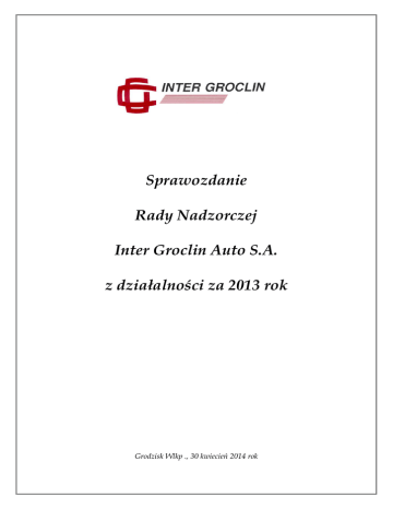 Sprawozdanie Rady Nadzorczej Inter Groclin Auto S.A. z działalności za 2013 rok Grodzisk Wlkp ., 30 kwiecień 2014 rok Rada Nadzorcza Inter Groclin Auto S.A. Sprawozdanie z działalności Stosownie do postanowień Kodeksu spółek handlowych, Rada Nadzorcza Spółki Inter Groclin Auto S.A. przedkłada Walnemu Zgromadzeniu sprawozdanie z działalności w okresie od 01 stycznia do 31 grudnia 2013 roku. I. Informacja o kadencji Rady Nadzorczej. Bieżąca kadencja członków Rady Nadzorczej rozpoczęła się w dniu 28 czerwca 2011r. Mandaty obecnych członków Rady Nadzorczej wygasają najpóźniej z dniem odbycia Walnego Zgromadzenia Akcjonariuszy, zatwierdzającego sprawozdania finansowe za rok obrotowy 2013. II. Skład Rady Nadzorczej i zmiany w składzie Rady w trakcie roku obrotowego. Na dzień 01 stycznia 2013r., skład Rady Nadzorczej Inter Groclin Auto SA przedstawiał się następująco: 1. Waldemar Frąckowiak – Przewodniczący Rady Nadzorczej 1. Wojciech Witkowski – Wiceprzewodniczący Rady Nadzorczej 2. Janusz Brzeziński – Sekretarz Rady Nadzorczej 3. Monika Drzymała – Członek Rady Nadzorczej 4. Krzysztof Jordan – Członek Rady Nadzorczej W dniu 21 maja 2013 roku Nadzwyczajne Walne Zgromadzenie Inter Groclin Auto SA odwołało z funkcji członka Rady Nadzorczej Panią Monikę Drzymała oraz Pana Krzysztofa Jordana. W tym samym dniu Nadzwyczajne Walne Zgromadzenie Inter Groclin Auto SA powołało w skład Rady Nadzorczej Pana Piotra Gałązkę na Wiceprzewodniczącego Rady Nadzorczej oraz Panów Wilfrieda Gerstnera; Jörga – Holgera Horniga; Mike Gerstnera na członków Rady Nadzorczej. Zgodnie z §17 ust. 1a do czasu dostosowania po raz pierwszy po wpisaniu do rejestru przedsiębiorców zmian §17 ust.1 Statutu dokonywanej na podstawie Uchwały nr 4/2013 z dnia 25 kwietnia 2013 roku Nadzwyczajnego Walnego Zgromadzenia Spółki w sprawie zmiany Statutu składu Rady Nadzorczej do wymogów §17 ust.1 Statutu, Rad Nadzorcza składała się z pięciu dotychczasowych członków, w tym Przewodniczącego, powoływanych na okres wspólnej kadencji. W związku z dokonaniem wpisu do rejestru przedsiębiorców zmiany §17 ust.1 Statutu Inter Groclin Auto SA od dnia 21.06.2013 roku Rada Nadzorcza Inter Groclin Auto SA działała w następującym składzie: Waldemar Frąckowiak – Przewodniczący Rady Nadzorczej Piotr Gałązka - Wiceprzewodniczący Rady Nadzorczej Janusz Brzeziński – Sekretarz Rady Nadzorczej Wojciech Witkowski – Członek Rady Nadzorczej Wilfried Gerstner - Członek Rady Nadzorczej Jörg-Holger Hornig - Członek Rady Nadzorczej Mike Gerstner - Członek Rady Nadzorczej Na pierwszym posiedzeniu Rady Nadzorczej w zmienionym składzie w dniu 21.06.2013r., Pan Wojciech Witkowski dotychczasowy wiceprzewodniczący Rady Nadzorczej zrezygnował z funkcji Wiceprzewodniczącego. Na dzień 31 grudnia 2013r., skład Rady Nadzorczej Inter Groclin Auto SA nie uległ zmianie. III. Działalność Rady Nadzorczej. Podstawą działalności Rady Nadzorczej Inter Groclin Auto SA były Kodeks spółek handlowych, Statut Spółki, Regulamin Rady Nadzorczej oraz Dobre Praktyki Spółek Notowanych na Giełdzie Papierów Wartościowych. 2 Rada Nadzorcza Inter Groclin Auto S.A. Sprawozdanie z działalności Rada Nadzorcza podejmowała swoje decyzje w formie uchwał i opinii przekazywanych Zarządowi oraz Walnemu Zgromadzeniu. Działania Rady Nadzorczej w 2013 roku udokumentowane zostały w protokołach z posiedzeń Rady Nadzorczej odbytych w trybie stacjonarnym z udziałem członków Rady Nadzorczej oraz posiedzeń, które przeprowadzono z wykorzystaniem środków medialnych ( w tzw. Trybie obiegowym). W 2013 roku Rada Nadzorcza Inter Groclin Auto SA odbyła dwadzieścia jeden posiedzeń w tym; dziewięć posiedzeń stacjonarnych, a dwanaście w tzw. Trybie obiegowym. Na swoich posiedzeniach Rada Nadzorcza podjęła 36 uchwał w formie osobnych dokumentów. Programy posiedzeń Rady Nadzorczej obejmowały wszystkie istotne zagadnienia dotyczące Spółki, których rozpatrywanie było realizacją nadzoru nad całokształtem jej działalności. W 2013 roku Rada Nadzorcza zgodnie z przyjętym planem pracy zajmowała się m.in. następującymi zagadnieniami: Oceną rocznych sprawozdań finansowych Inter Groclin Auto S.A. i grupy kapitałowej za rok 2012, Oceną sprawozdań Zarządu z działalności Spółki i grupy kapitałowej za 2012 rok, Oceną wniosku Zarządu dotyczącą podziału zysku za rok obrotowy 2012, Opiniowaniem porządku obrad oraz projektów uchwał przedstawionych na Walnym Zgromadzeniu, Wyborem audytora do badania i przeglądu sprawozdań finansowych Spółki i grupy kapitałowej, Oceną okresowych sprawozdań finansowych Spółki grupy kapitałowej IGA w 2013 roku. Poza działaniami wynikającymi z planu pracy w 2013 roku Rada Nadzorcza zajmowała się sprawami bieżącymi związanymi z funkcjonowaniem Spółki. Przyjęto jednolity tekst Statutu Spółki uwzględniający zmiany uchwalone przez Nadzwyczajne Walne Zgromadzenie Spółki w dniu 25.04.2013 roku, monitorowano i oceniano przebieg procesu integracyjnego potencjałów produkcyjnych i ekonomicznych Inter Groclin Auto SA i Kabel-Technik-Polska Sp. z o.o. IV. Komitet Audytu. W I półroczu 2013 roku z uwagi na minimalną liczbę członków Rady nadzorczej tj. pięciu, zadania Komitetu Audytu pełniła cała Rada Nadzorcza Inter Groclin Auto SA. Po zmianie Statutu Spółki i zwiększenia liczby członków Rady Nadzorczej do siedmiu osób, Rada Nadzorcza w głosowaniu tajnym powołała Komitet Audytu w następującym składzie: Piotr Gałązka – Przewodniczący Komitetu Audytu, Wilfried Gerstner – Członek Komitetu Audytu Wojciech Witkowski - Członek Komitetu Audytu W dniu 18.10.2013 roku w głosowaniu tajnym Rada Nadzorcza powołała Janusza Brzezińskiego jako czwartego członka Komitetu Audytu, a w celu usprawnienia pracy Komitetu Audytu na wniosek Przewodniczącego Komitetu Audytu funkcję wiceprzewodnic