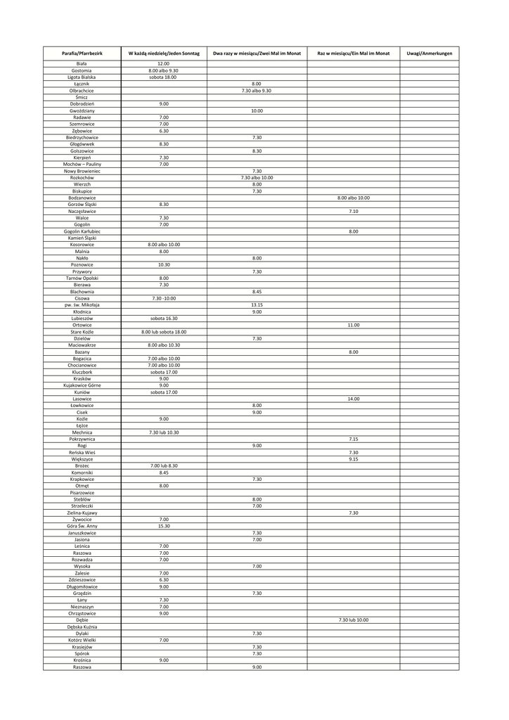 Parafia/Pfarrbezirk W każdą niedzielę/Jeden Sonntag Biała Gostomia Ligota Bialska Łącznik Olbrachcice Śmicz Dobrodzień Gwoździany Radawie Szemrowice Zębowice Biedrzychowice Głogówwek Golszowice Kierpień Mochów – Pauliny Nowy Browieniec Rozkochów Wierzch Biskupice Bodzanowice Gorzów Śląski Naczęsławice Walce Gogolin Gogolin Karłubiec Kamień Śląski Kosorowice Malnia Nakło Poznowice Przywory Tarnów Opolski Bierawa Blachownia Cisowa pw. św. Mikołaja Kłodnica Lubieszów Ortowice Stare Koźle Dzielów Maciowakrze Bazany Bogacica Chocianowice Kluczbork Krasków Kujakowice Górne Kuniów Lasowice Łowkowice Cisek Koźle Łężce Mechnica Pokrzywnica Rogi Reńska Wieś Większyce Brożec Komorniki Krapkowice Otmęt Pisarzowice Steblów Strzeleczki Zielina-Kujawy Żywocice Góra Św. Anny Januszkowice Jasiona Leśnica Raszowa Rozwadza Wysoka Zalesie Zdzieszowice Długomiłowice Grzędzin Łany Nieznaszyn Chrząstowice Dębie Dębska Kuźnia Dylaki Kotórz Wielki Krasiejów Spórok Krośnica Raszowa 12.00 8.00 albo 9.30 sobota 18.00 Dwa razy w miesiącu/Zwei Mal im Monat Raz w miesiącu/Ein Mal im Monat 8.00 7.30 albo 9.30 9.00 10.00 7.00 7.00 6.30 7.30 8.30 8.30 7.30 7.00 7.30 7.30 albo 10.00 8.00 7.30 8.00 albo 10.00 8.30 7.10 7.30 7.00 8.00 8.00 albo 10.00 8.00 8.00 10.30 7.30 8.00 7.30 8.45 7.30 -10.00 13.15 9.00 sobota 16.30 11.00 8.00 lub sobota 18.00 7.30 8.00 albo 10.30 8.00 7.00 albo 10.00 7.00 albo 10.00 sobota 17.00 9.00 9.00 sobota 17.00 14.00 8.00 9.00 9.00 7.30 lub 10.30 7.15 9.00 7.30 9.15 7.00 lub 8.30 8.45 7.30 8.00 8.00 7.00 7.30 7.00 15.30 7.30 7.00 7.00 7.00 7.00 7.00 7.00 6.30 9.00 7.30 7.30 7.00 9.00 7.30 lub 10.00 7.30 7.00 7.30 7.30 9.00 9.00 Uwagi/Anmerkungen Daniec Schodnia Borucin Cyprzanów Krowiarki Krzanowice Pawłów Pietrowice Wielkie Samborowice Wojnowice Boguszyce Chróścina Opolska Chrząszczyce Dąbrówka Górna Domecko Komprachcice Ligota Prószkwska Polska Nowa Wieś Prószków Rogów Opolski Wawelno Zimnice Wielkie Łubowice Racibórz - kościół św. Jakuba Racibórz-Markowice Racibórz-Ostróg Racibórz-Płonia Racibórz-Studzienna Racibórz-Ocice Rudnik Chróścice Czarnowąsy Dobrzeń Wielki Kup Luboszyce Łubniany Popielów Stare Siołkowice Zawada Dolna Dziewkowice Grodzisko Izbicko Jemielnica Kadłub Rozmierz Strzelce Op. - św.Wawrzyńca Sucha Bienkowice Bojanów Bolesław Krzyżanowice Owsiszcze Racibórz Sudół Rudyszwałd Tworków Zabełków Centawa Klucz Kotulin Ujazd Fałkowice Ligota Turawska Kadłub Zakrzów Osowiec-Węgry Stare Budkowice Zagwiździe Kielcza Kolonowskie Staniszcze Małe Staniszcze Wielkie Zawadzkie NSPJ Żędowice 7.00 7.30 7.30 7.00 7.30 7.30 7.30 8.15 10.30 9.00 8.00 lub 10.00 7.00 9.00 8.00 7.00 lub10.00 9.00 8.00 lub 10.00 9.00 7.00 sobota 18.00 7.30 7.30 9.00 9.00 Sobota 18.00 9.00 7.00 8.00 8.00 10.30 7.00 albo 9.00 8.15 7.00 7.30 7.00 7.30 7.30 8.45 8.00 8.00 sobota 18.00 7.00 6.30 7.15 7.30 6.45 8.45 7.30 8.00 7.00 7.00 9.00 9.00 10.00 8.00 8.00 albo 10.00 9.30 9.00 7.45 7.00 8.30 9.00 7.30 albo 10.00 7.30 7.30 albo 10.00 7.30 7.30 7.00 7.30