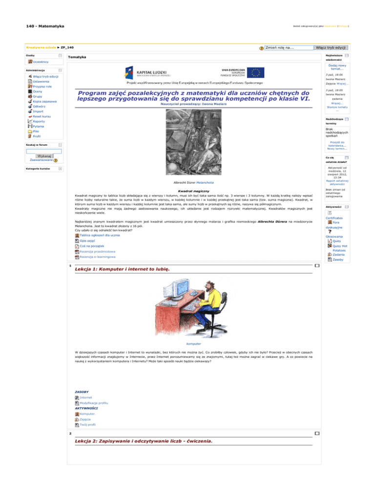 140 - Matematyka Jesteś zalogowany(a) jako Recenzent (W yloguj) Kreatywna szkoła ► ZP_140 Osoby Zmień rolę na... Włącz tryb edycji Najświeższe Tematyka wiadomości Uczestnicy Dodaj nowy temat... Administracja 3 paź, 18:06 Włącz tryb edycji Iwona Maziarz Ustawienia Zajęcia Więcej... Przypisz role Oceny Program zajęć pozalekcyjnych z matematyki dla uczniów chętnych do lepszego przygotowania się do sprawdzianu kompetencji po klasie VI. Grupy Kopia zapasowa Nauczyciel prowadzący: Iwona Maziarz Odtwórz 3 paź, 18:05 Iwona Maziarz zadania Więcej... Starsze tematy ... Import Reset kursu Nadchodzące Raporty terminy Pytania Brak nadchodzących spotkań Pliki Profil Przejdź do kalendarza... Nowy termin... Szukaj w forum Co się Zaawansowane ostatnio działo? Kategorie kursów Albrecht Dürer Melancholia Kwadrat magiczny Kwadrat magiczny to tablica liczb składająca się z wierszy i kolumn, musi ich być taka sama ilość np. 3 wiersze i 3 kolumny. W każdą kratkę należy wpisać Aktywność od niedziela, 12 sierpień 2012, 13:34 Raport ostatniej aktywności Brak zmian od ostatniego zalogowania różne liczby naturalne takie, że suma liczb w każdym wierszu, w każdej kolumnie i w każdej przekątnej jest taka sama (tzw. suma magiczna). Kwadrat, w którym suma liczb w każdym wierszu i każdej kolumnie jest taka sama, ale sumy liczb w przekątnych są różne, nazywa się półmagicznym. Kwadraty magiczne nie mają żadnego zastosowania naukowego, ich układanie jest rodzajem rozrywki matematycznej. Kwadratów magicznych jest Aktywności nieskończenie wiele. Certificates Najbardziej znanym kwadratem magicznym jest kwadrat umieszczony przez słynnego malarza i grafika niemieckiego Albrechta Dürera na miedziorycie Melancholia. Jest to kwadrat złożony z 16 pól. Fora dyskusyjne Czy udało ci się odnaleźć ten kwadrat? Tablica ogłoszeń dla ucznia Głosowania Opis zajęć Quizy Coś na początek Quizy Hot Recenzja przedmiotowa Potatoes Zadania Recenzja e-learningowa Zasoby 1 Lekcja 1: Komputer i internet to lubię. komputer W dzisiejszych czasach komputer i Internet to wynalazki, bez których nie można żyć. Co zrobiłby człowiek, gdyby ich nie było? Przecież w obecnych czasach większość informacji znajdujemy w Internecie, przez Internet porozumiewamy się ze znajomymi, tutaj też można zagrać w ciekawe gry. A co powiecie na naukę z wykorzystaniem komputera i Internetu? Może taki sposób nauki będzie ciekawszy? ZASOBY Internet Modyfikacja profilu AKTYWNOŚCI Komputer. Zajęcia Twój profil 2 Lekcja 2: Zapisywanie i odczytywanie liczb - ćwiczenia. Magia cyfr, fot. Shutterstock Cyfry arabskie, właściwie cyfry indyjskie europeizowane – cyfry stosowane obecnie powszechnie na całym świecie do zapisywania liczb. Są to kolejno znaki: 0, 1, 2, 3, 4, 5, 6, 7, 8 oraz 9 i służą do zapisu liczb w systemie dziesiątkowym. Cyfry i dziesiętny system pozycyjny pochodzą z Indii. Około VII wieku Indie najechali Arabowie. Podbili kraj, splądrowali miasta. Ich łupem padły skarby, dzieła sztuki, starożytne indyjskie pisma, także te zawierające wiedzę matematyczną i astronomiczną. Uczeni arabscy bardzo chętnie studiowali matematykę. Cyfry weszły do powszechnego użytku, a ich propagatorem był arabski matematyk Muhammad ibn Musa al-Chorezm. Na zachodzie w średniowieczu rozprzestrzenili je Arabowie (stąd ich przyjęta w Europie nazwa), a ich propagatorem w Europie był włoski matematyk Fibonacci. Cyfry rzymskie są pochodzenia etruskiego, które Rzymianie przejęli około 500 p.n.e. Przy pomocy znaków rzymskich wygodnie zapisuje się liczby, problemem jest natomiast zapisywanie nawet prostych działań arytmetycznych i nie można zapisać ułamków. W dzisiejszych czasach tych znaków używa się do numerowania rozdziałów w książkach, zapisywania dat, godzin. W zapisie rzymskim wyróżnia się kilka podstawowych znaków: I – 1 V – 5 X – 10 L – 50 C – 100 D – 500 M – 1000. ZASOBY Syatemy liczbowe AKTYWNOŚCI Magia cyfr Czy podobają ci się zajęcia? 3 Lekcja 3: Własności działań na liczbach naturalnych. liczydło Od początku swojej edukacji matematycznej uczyliście się wykonywać pewne działania na liczbach - dodawanie, odejmowanie, mnożenie i dzielenie. Proste obliczenia wykonujecie w pamięci, te bardziej skomplikowane pisemnie, a bardzo trudne przy użyciu kalkulatora. Działania poznane przez was to: suma - dodawanie różnica - odejmowanie iloczyn - mnożenie iloraz - dzielenie. ZASOBY Cztery działania na liczbach AKTYWNOŚCI Ćwiczymy liczenie Test interaktywny 4 Lekcja 4: Ćwiczenia utrwalające działania na liczbach naturalnych. Nazwy dużych liczb Tabela zawiera nazwy dużych liczb takich, których nie używa się na co dzień w szkole. Warto jednak wiedzieć, że takie są i mają swoje nazwy. Nazwa Zapis wykładniczy Zapis pozycyjny tysiąc 103 1 000 milion 106 1 000 000 miliard 109 1 000 000 000 bilion 1012 1 000 000 000 000 biliard 1015 1 000 000 000 000 000 trylion 1018 1 000 000 000 000 000 000 tryliard 1021 1 000 000 000 000 000 000 000 kwadrylion 1024 1 000 000 000 000 000 000 000 000 kwintylion 1030 1 000 000 000 000 000 000 000 000 000 000 sekstylion 1036 1 000 000 000 000 000 000 000 000 000 000 000 000 septylion 1042 1 000 000 000 000 000 000 000 000 000 000 000 000 000 000 oktylion 1048 1 000 000 000 000 000 000 000 000 000 000 000 000 000 000 000 000 nonylion 1054 decylion 1060 centylion 10600 ZASOBY Kolejność wykonywania działań AKTYWNOŚCI Test liczby naturalne Rozwiąż zadanie. 5 Lekcja 5:Ciekawe zadania matematyczne. We współczesnym nauczaniu matematyki zdania tekstowe zajmują znaczące miejsce i pełnią niebagatelną rolę. Wiążą matematykę z życiem codziennym i przygotowują do rozwiązywania różnych problemów praktycznych. Sprzyjają wielostronnej aktywizacji i integrują różne obszary edukacyjne. ZASOBY Filmik Rozwiązywanie zadań tekstowych AKTYWNOŚCI Matematyka i z