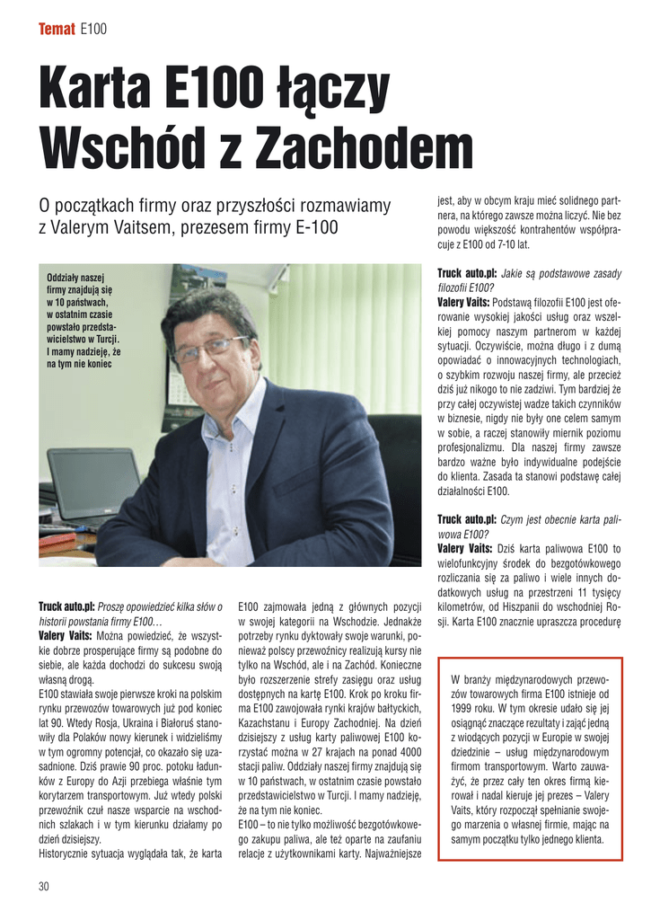 Temat E100 Karta E100 łączy Wschód z Zachodem O początkach firmy oraz przyszłości rozmawiamy z Valerym Vaitsem, prezesem firmy E-100 Truck auto.pl: Jakie są podstawowe zasady filozofii E100? Valery Vaits: Podstawą filozofii E100 jest oferowanie wysokiej jakości usług oraz wszelkiej pomocy naszym partnerom w każdej sytuacji. Oczywiście, można długo i z dumą opowiadać o innowacyjnych technologiach, o szybkim rozwoju naszej firmy, ale przecież dziś już nikogo to nie zadziwi. Tym bardziej że przy całej oczywistej wadze takich czynników w biznesie, nigdy nie były one celem samym w sobie, a raczej stanowiły miernik poziomu profesjonalizmu. Dla naszej firmy zawsze bardzo ważne było indywidualne podejście do klienta. Zasada ta stanowi podstawę całej działalności E100. Oddziały naszej firmy znajdują się w 10 państwach, w ostatnim czasie powstało przedstawicielstwo w Turcji. I mamy nadzieję, że na tym nie koniec Truck auto.pl: Proszę opowiedzieć kilka słów o historii powstania firmy E100… Valery Vaits: Można powiedzieć, że wszystkie dobrze prosperujące firmy są podobne do siebie, ale każda dochodzi do sukcesu swoją własną drogą. E100 stawiała swoje pierwsze kroki na polskim rynku przewozów towarowych już pod koniec lat 90. Wtedy Rosja, Ukraina i Białoruś stanowiły dla Polaków nowy kierunek i widzieliśmy w tym ogromny potencjał, co okazało się uzasadnione. Dziś prawie 90 proc. potoku ładunków z Europy do Azji przebiega właśnie tym korytarzem transportowym. Już wtedy polski przewoźnik czuł nasze wsparcie na wschodnich szlakach i w tym kierunku działamy po dzień dzisiejszy. Historycznie sytuacja wyglądała tak, że karta 30 jest, aby w obcym kraju mieć solidnego partnera, na którego zawsze można liczyć. Nie bez powodu większość kontrahentów współpracuje z E100 od 7-10 lat. E100 zajmowała jedną z głównych pozycji w swojej kategorii na Wschodzie. Jednakże potrzeby rynku dyktowały swoje warunki, ponieważ polscy przewoźnicy realizują kursy nie tylko na Wschód, ale i na Zachód. Konieczne było rozszerzenie strefy zasięgu oraz usług dostępnych na kartę E100. Krok po kroku firma E100 zawojowała rynki krajów bałtyckich, Kazachstanu i Europy Zachodniej. Na dzień dzisiejszy z usług karty paliwowej E100 korzystać można w 27 krajach na ponad 4000 stacji paliw. Oddziały naszej firmy znajdują się w 10 państwach, w ostatnim czasie powstało przedstawicielstwo w Turcji. I mamy nadzieję, że na tym nie koniec. E100 – to nie tylko możliwość bezgotówkowego zakupu paliwa, ale też oparte na zaufaniu relacje z użytkownikami karty. Najważniejsze Truck auto.pl: Czym jest obecnie karta paliwowa E100? Valery Vaits: Dziś karta paliwowa E100 to wielofunkcyjny środek do bezgotówkowego rozliczania się za paliwo i wiele innych dodatkowych usług na przestrzeni 11 tysięcy kilometrów, od Hiszpanii do wschodniej Rosji. Karta E100 znacznie upraszcza procedurę W branży międzynarodowych przewozów towarowych firma E100 istnieje od 1999 roku. W tym okresie udało się jej osiągnąć znaczące rezultaty i zająć jedną z wiodących pozycji w Europie w swojej dziedzinie – usług międzynarodowym firmom transportowym. Warto zauważyć, że przez cały ten okres firmą kierował i nadal kieruje jej prezes – Valery Vaits, który rozpoczął spełnianie swojego marzenia o własnej firmie, mając na samym początku tylko jednego klienta. płatności za drogi, punkty serwisowe, myjnie, parkingi, hotele i promy. Nasza firma oferuje możliwość odzyskania podatku VAT za paliwo nabyte w państwach należących do Unii Europejskiej. Jest to doskonała możliwość zredukowania przez przewoźników swoich wydatków o 20 proc Użytkownicy firmy E100 korzystają także z usług Klubu Pomocy. Jest to unikalna organizacja, której odpowiedników nie ma ani w Europie, ani w Azji. Klub pomaga przewoźnikom drogowym w każdych, nawet najbardziej problematycznych sytuacjach na drodze. Specjalnie uruchomiliśmy także gorącą linię telefoniczną, która całodobowo świadczy pomoc i wsparcie informacyjne. MAX. Można na nich nabyć wysokiej jakości, sprawdzone produkty paliwowe po cenach hurtowych. Nasza karta paliwowa posiada bankowe standardy zabezpieczeń, dzięki czemu użytkownicy E100 nie muszą się martwić o bezpieczeństwo swoich środków. Poza biznesowymi, umacniamy również osobiste relacje, przeprowadzając cały szereg wspólnych imprez. Niedawno w Polsce zorganizowaliśmy duży piknik rodzinny. E100 to jedna z niewielu firm, która opracowuje dla kierowców samochodów ciężarowych specjalne programy promocyjne, w zależności od ilości nabywanego paliwa. Może to być sycący obiad, filiżanka aromatycznej kawy lub drobna, ale bardzo przydatna w trasie rzecz. Dziś karta paliwowa E100 to wielofunkcyjny środek do bezgotówkowego rozliczania się za paliwo i wiele innych dodatkowych usług na przestrzeni 11 tysięcy kilometrów, od Hiszpanii do wschodniej Rosji. Truck auto.pl: Co wyróżnia E100 spośród konkurencji? Jakie szczególne zalety można podkreślić? Valery Vaits: E100 bezustannie pracuje w interesie partnerów. Dla nich opracowany został przez nas specjalny system zniżek na paliwo w sieci E100. Unikalną ofertą cenową wyróżniają się kompleksy stacji należących do sieci Power Truck auto.pl: Proszę powiedzieć o planach firmy na najbliższe lata. Valery Vaits: Trudno przewidywać, jak będzie rozwijał się świat przewozów drogowych w ciągu kilku najbliższych lat. Ale proszę być pewnym, że E100 zawsze trzyma rękę na pulsie i nadal będzie dążyć do tego, by oferować użytkownikom maksymalny wachlarz usług potrzebnych w trasie. Mamy już zaplanowane otwarcie szeregu nowych tras i rozszerzenie sieci stacji paliw. Firma ma również wiele innych projektów, których realizacja przyniesie znaczne ułatwienie pracy naszym klientom. Niech będzie to jednak dla nich miłą 
