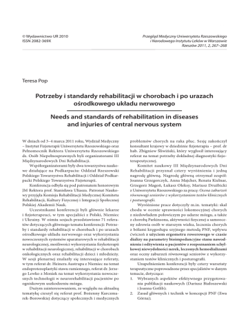 Strzępka, Kruk Szpital jako spółka prawa handlowego na przykładzie Centrum Medycznego w Łańcucie © Wydawnictwo UR 2010 ISSN 2082-369X 267 Przegląd Medyczny Uniwersytetu Rzeszowskiego i Narodowego Instytutu Leków w Warszawie Rzeszów 2011, 2, 267–268 Teresa Pop Potrzeby i standardy rehabilitacji w chorobach i po urazach ośrodkowego układu nerwowego Needs and standards of rehabilitation in diseases and injuries of central nervous system W dniach od 3–4 marca 2011 roku, Wydział Medyczny – Instytut Fizjoterapii Uniwersytetu Rzeszowskiego oraz Pełnomocnik Rektora Uniwersytetu Rzeszowskiego ds. Osób Niepełnosprawnych byli organizatorami III Międzynarodowych Dni Rehabilitacji. Współorganizatorami były dwa towarzystwa naukowe działające na Podkarpaciu: Oddział Rzeszowski Polskiego Towarzystwa Rehabilitacji i Oddział Podkarpacki Polskiego Towarzystwa Fizjoterapii. Konferencja odbyła się pod patronatem honorowym JM Rektora prof. Stanisława Uliasza. Patronat Naukowy przyjęła Komisja Rehabilitacji Medycznej Komitetu Rehabilitacji, Kultury Fizycznej i Integracji Społecznej Polskiej Akademii Nauk. Uczestnikami konferencji byli głównie lekarze i fizjoterapeuci, w tym specjaliści z Polski, Niemiec i Ukrainy. W ośmiu sesjach przedstawiono 71 referatów dotyczących głównego tematu konferencji: Potrzeby i standardy rehabilitacji w chorobach i po urazach ośrodkowego układu nerwowego oraz wykorzystania nowoczesnych systemów aparaturowych w rehabilitacji neurologicznej, możliwości wykorzystania fizykoterapii w rehabilitacji neurologicznej, rehabilitacji w chorobach onkologicznych oraz rehabilitacji dzieci i młodzieży. W sesji plenarnej znalazły się interesujące referaty, w tym referat dr. Heinera Austrupa z Niemiec na temat endoprotezoplastyki stawu ramiennego, referat dr. Jerzego Lewko z Moniek na temat wykorzystania nowoczesnych technologii w neurorehabilitacji pacjentów po ogniskowym uszkodzeniu mózgu. Dużym zainteresowaniem, ze względu na aktualną tematykę cieszył się referat prof. Bożenny Karczmarek-Borowskiej dotyczący społecznych i medycznych problemów chorych na raka płuc. Sesję zakończył konsultant krajowy w dziedzinie fizjoterapia – prof. dr hab. Zbigniew Śliwiński, który wygłosił interesujący referat na temat potrzeby dokładnej diagnostyki fizjoterapeutycznej. Komitet naukowy III Międzynarodowych Dni Rehabilitacji przyznał cztery wyróżnienia i jedną nagrodę główną. Nagrodę główną otrzymał zespół: Joanna Grzegorczyk, Anna Majcher, Renata Kielnar, Grzegorz Magoń, Łukasz Oleksy, Mariusz Drużbicki z Uniwersytetu Rzeszowskiego za pracę: Ocena zaburzeń równowagi seniorów z wykorzystaniem testów klinicznych i posturografii. Wyróżnione prace dotyczyły m.in. tematyki: skal chodu w ocenie sprawności lokomocyjnej chorych z niedowładem połowiczym po udarze mózgu, a także z chorobą Parkinsona, aktywności fizycznej a samooceny zdrowia osób w starszym wieku, leczenia chorych z bólami kręgosłupa szyjnego metodą PNF, wpływu ćwiczeń z użyciem ergometru rowerowego w czasie dializy na parametry bioimpedancyjne stanu nawodnienia i odżywienia u pacjentów z rozpoznaniem schyłkowej niewydolności nerek, leczonych hemodializami oraz oceny zaburzeń równowagi seniorów z wykorzystaniem testów klinicznych i posturografii. Uzupełnieniem konferencji były cztery warsztaty terapeutyczne poprowadzone przez specjalistów w danym temacie, dotyczące: 1. Wybranych aspektów efektywnego przygotowania publikacji naukowych (Dariusz Białoszewski i Joanna Gotlib); 2. Zasad głównych i technik w koncepcji PNF (Ewa Górna); 268 Przegląd Medyczny Uniwersytetu Rzeszowskiego i Narodowego Instytutu Leków w Warszawie, 2011, 2, 267–268 3. Ćwiczeń sensomotorycznych (Sylwia Mętel); 4. Efektywności zabiegów kinezyterapeutycznych stosowanych w odcinku szyjnym kręgosłupa u chorych z chronicznym łokciem tenisisty (Romana Lamatza – Niemcy). III Międzynarodowe Dni Rehabilitacji można zaliczyć do udanych imprez naukowych. Tak samo oceniali konferencję jej uczestnicy w listach pokonferencyjnych kierowanych do organizatorów.