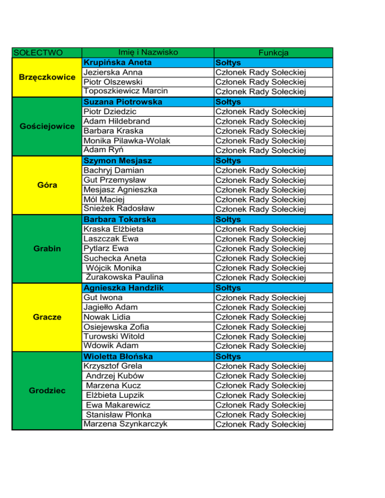 Imię i Nazwisko Krupińska Aneta Jezierska Anna Brzęczkowice Piotr Olszewski Toposzkiewicz Marcin Suzana Piotrowska Piotr Dziedzic Adam Hildebrand Gościejowice Barbara Kraska Monika Pilawka-Wolak Adam Ryń Szymon Mesjasz Bachryj Damian Gut Przemysław Góra Mesjasz Agnieszka Mól Maciej Śnieżek Radosław Barbara Tokarska Kraska Elżbieta Laszczak Ewa Pytlarz Ewa Grabin Suchecka Aneta Wójcik Monika Żurakowska Paulina Agnieszka Handzlik Gut Iwona Jagiełło Adam Nowak Lidia Gracze Osiejewska Zofia Turowski Witold Wdowik Adam Wioletta Błońska Krzysztof Grela Andrzej Kubów Marzena Kucz Grodziec Elżbieta Lupzik Ewa Makarewicz Stanisław Płonka Marzena Szynkarczyk SOŁECTWO Funkcja Sołtys Członek Rady Sołeckiej Członek Rady Sołeckiej Członek Rady Sołeckiej Sołtys Członek Rady Sołeckiej Członek Rady Sołeckiej Członek Rady Sołeckiej Członek Rady Sołeckiej Członek Rady Sołeckiej Sołtys Członek Rady Sołeckiej Członek Rady Sołeckiej Członek Rady Sołeckiej Członek Rady Sołeckiej Członek Rady Sołeckiej Sołtys Członek Rady Sołeckiej Członek Rady Sołeckiej Członek Rady Sołeckiej Członek Rady Sołeckiej Członek Rady Sołeckiej Członek Rady Sołeckiej Sołtys Członek Rady Sołeckiej Członek Rady Sołeckiej Członek Rady Sołeckiej Członek Rady Sołeckiej Członek Rady Sołeckiej Członek Rady Sołeckiej Sołtys Członek Rady Sołeckiej Członek Rady Sołeckiej Członek Rady Sołeckiej Członek Rady Sołeckiej Członek Rady Sołeckiej Członek Rady Sołeckiej Członek Rady Sołeckiej Alicja Atamańczuk Bukowski Piotr Jaczowice Kalbarczyk Małgorzata Kozak Małgorzata Monika Zawadzka Dec Bożena Dec Tomasz Kamińska Anna Jakubowice Kassak Bogusława Papierowska Katarzyna Zaczek Łukasz Zięba Barbara Żaneta Kałwa Aleksandrowicz Sylwia Krasna Góra Dec Mirosław Franczyk Dominika Lelek Władysław Jan Gorczowski Dorota Litwinowicz Marta Zdunek Aneta Borowicz Lipno Robert Dressler Albert Nagel Ewelina Płaczek Katarzyna Olszewska Marta Didyk Będkowski Tomasz Dębiński Edward Dolak Rafał Magnuszowice Grębowiec Justyna Korzanowski Kacper Sarnicki Wi9told Wysocka Izabela Kazimierz Walczuk Szczepkowski Zbigniew Magnuszowiczki Walczyna Jolanta Wawryczuk Daniel Leszek Wajman Krzysztof Gwiazdowski Michałówek Marta Krupa Małgorzata Kyć Sołtys Członek Rady Sołeckiej Członek Rady Sołeckiej Członek Rady Sołeckiej Sołtys Członek Rady Sołeckiej Członek Rady Sołeckiej Członek Rady Sołeckiej Członek Rady Sołeckiej Członek Rady Sołeckiej Członek Rady Sołeckiej Członek Rady Sołeckiej Sołtys Członek Rady Sołeckiej Członek Rady Sołeckiej Członek Rady Sołeckiej Członek Rady Sołeckiej Sołtys Członek Rady Sołeckiej Członek Rady Sołeckiej Członek Rady Sołeckiej Członek Rady Sołeckiej Członek Rady Sołeckiej Członek Rady Sołeckiej Członek Rady Sołeckiej Sołtys Członek Rady Sołeckiej Członek Rady Sołeckiej Członek Rady Sołeckiej Członek Rady Sołeckiej Członek Rady Sołeckiej Członek Rady Sołeckiej Członek Rady Sołeckiej Sołtys Członek Rady Sołeckiej Członek Rady Sołeckiej Członek Rady Sołeckiej Sołtys Członek Rady Sołeckiej Członek Rady Sołeckiej Członek Rady Sołeckiej Zdzisław Kutyła Adamczyk Roman Bunia Krzysztof Czerkawski Jacek Molestowice Kocan Maria Miśta Andrzej Pośpiech Tadeusz Samson Halina Dariusz Rusnak Mainka Tomasz Cichosz Jacek Piotrowa Kutyła Sławomir Łucarz Witold Pilarek Piotr Zbigniew Nowak Bieruta Robert Nieckarz Czesław Rogi Sitnik Piotr Szeliga Ryszard Zieliński Jan Klaudia Garda Agnieszka Garda Radosław Kaliciak Radoszowice Klaudia Kacprzak Anna Ciećka Ilona Ptak Ireneusz Naściuk Katarzyna Amorgowicz Daniel Jezierski Józef Micuń Roszkowice Arkadiusz Polański Lucyna Salera Marek Sikorski Witold Turowski Renata Pochwat Bandrowski Tomasz Rutki Cendal Małgorzata Galla Sebastian Izabela Mihilewicz Joanna Murkowska Robert Gutka Rzędziwojowice Małgorzata Biela Małgorzata Nieckarz Daniel Pieniacha Sołtys Członek Rady Sołeckiej Członek Rady Sołeckiej Członek Rady Sołeckiej Członek Rady Sołeckiej Członek Rady Sołeckiej Członek Rady Sołeckiej Członek Rady Sołeckiej Sołtys Członek Rady Sołeckiej Członek Rady Sołeckiej Członek Rady Sołeckiej Członek Rady Sołeckiej Członek Rady Sołeckiej Sołtys Członek Rady Sołeckiej Członek Rady Sołeckiej Członek Rady Sołeckiej Członek Rady Sołeckiej Członek Rady Sołeckiej Sołtys Członek Rady Sołeckiej Członek Rady Sołeckiej Członek Rady Sołeckiej Członek Rady Sołeckiej Członek Rady Sołeckiej Sołtys Członek Rady Sołeckiej Członek Rady Sołeckiej Członek Rady Sołeckiej Członek Rady Sołeckiej Członek Rady Sołeckiej Członek Rady Sołeckiej Członek Rady Sołeckiej Sołtys Członek Rady Sołeckiej Członek Rady Sołeckiej Członek Rady Sołeckiej Sołtys Członek Rady Sołeckiej Członek Rady Sołeckiej Członek Rady Sołeckiej Członek Rady Sołeckiej Członek Rady Sołeckiej Marta Biernacka Białowąs Urszula Brykowska Magda Faron Elżbieta Sady Król Kazimierz Martynowicz Stanisław Moździerska Beata Szmitowicz Henryk Teresa Kociołek Natalia Antolak Kamil Korytkowski Sarny Wielki Władysława Mihilewicz Aleksandra Szmit Kamila Ukleja Elżbieta Żelichowska-Lewko Karina Bieniek Sosnówka Bogusław Dębiński Wiesław Płonka Bernarda Jagiełło Dzialuk Kazimiera Szydłowiec Śl. Józwa Jolanta Sygula Marek Mirosław Nowak Gurazdowski Kazimierz Lach Mariusz Tarnica Nowak Renata Pierzga Grażyna Bożena Sobótka Gonsior Paweł Łabuz Barbara Tłustoręby Połowniak Violetta Walicka Krystyna Zając Wioletta Władysław Pruszyński Janusz Barbara Kownacki Piotr Wydrowice Kosterkiewicz Michał Król Marek Pruszyńska-Stańczyk Iwona Sołtys Członek Rady Sołeckiej Członek Rady Sołeckiej Członek Rady Sołeckiej Członek Rady Sołeckiej Członek Rady Sołeckiej Członek Rady Sołeckiej Członek Rady Sołeckiej Sołtys Członek Rady Sołeckiej Członek Rady Sołeckiej Członek Rady S