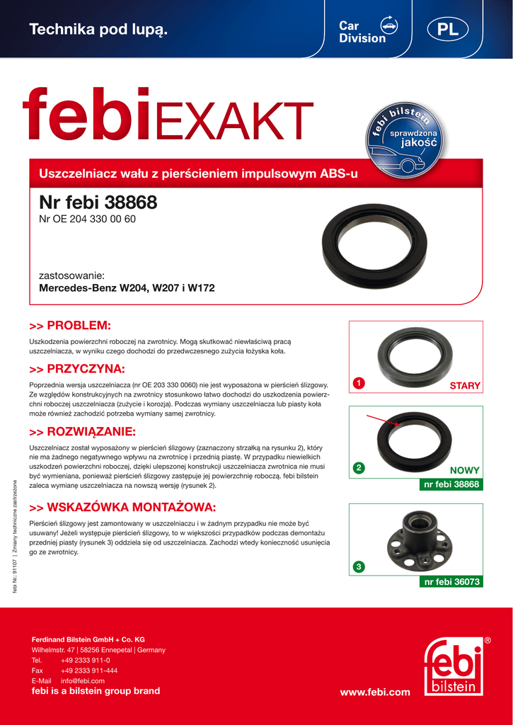 PL Technika pod lupą. febiEXAKT Uszczelniacz wału z pierścieniem impulsowym ABS-u Nr febi 38868 Nr OE 204 330 00 60 zastosowanie: Mercedes-Benz W204, W207 i W172 >> PROBLEM: Uszkodzenia powierzchni roboczej na zwrotnicy. Mogą skutkować niewłaściwą pracą uszczelniacza, w wyniku czego dochodzi do przedwczesnego zużycia łożyska koła. >> PRZYCZYNA: Poprzednia wersja uszczelniacza (nr OE 203 330 0060) nie jest wyposażona w pierścień ślizgowy. Ze względów konstrukcyjnych na zwrotnicy stosunkowo łatwo dochodzi do uszkodzenia powierzchni roboczej uszczelniacza (zużycie i korozja). Podczas wymiany uszczelniacza lub piasty koła może również zachodzić potrzeba wymiany samej zwrotnicy. 1 STARY 2 NOWY nr febi 38868 febi Nr.: 91107 | Zmiany techniczne zastrzeżone >> ROZWIĄZANIE: Uszczelniacz został wyposażony w pierścień ślizgowy (zaznaczony strzałką na rysunku 2), który nie ma żadnego negatywnego wpływu na zwrotnicę i przednią piastę. W przypadku niewielkich uszkodzeń powierzchni roboczej, dzięki ulepszonej konstrukcji uszczelniacza zwrotnica nie musi być wymieniana, ponieważ pierścień ślizgowy zastępuje jej powierzchnię roboczą. febi bilstein zaleca wymianę uszczelniacza na nowszą wersję (rysunek 2). >> WSKAZÓWKA MONTAŻOWA: Pierścień ślizgowy jest zamontowany w uszczelniaczu i w żadnym przypadku nie może być usuwany! Jeżeli występuje pierścień ślizgowy, to w większości przypadków podczas demontażu przedniej piasty (rysunek 3) oddziela się od uszczelniacza. Zachodzi wtedy konieczność usunięcia go ze zwrotnicy. 3 nr febi 36073 Ferdinand Bilstein GmbH + Co. KG Wilhelmstr. 47 | 58256 Ennepetal | Germany Tel. +49 2333 911-0 Fax +49 2333 911-444 [email protected] febi is a bilstein group brand