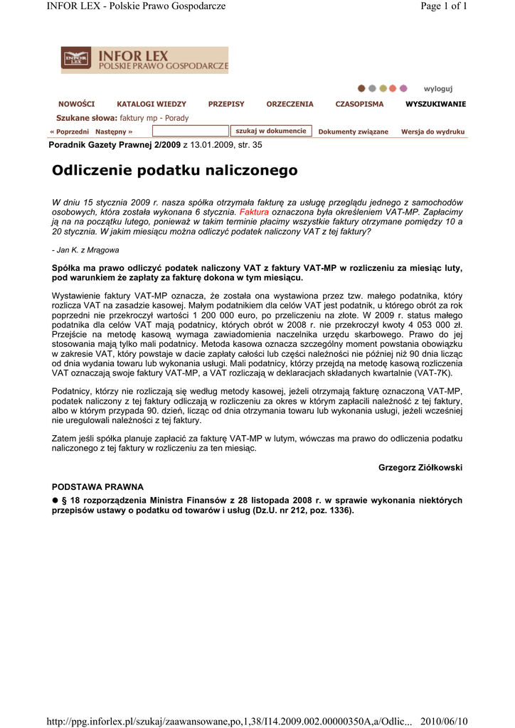 INFOR LEX - Polskie Prawo Gospodarcze Page 1 of 1 wyloguj NOWOŚCI KATALOGI WIEDZY PRZEPISY ORZECZENIA CZASOPISMA WYSZUKIWANIE Szukane słowa: faktury mp - Porady « Poprzedni Następny » szukaj w dokumencie Dokumenty związane Wersja do wydruku Poradnik Gazety Prawnej 2/2009 z 13.01.2009, str. 35 Odliczenie podatku naliczonego W dniu 15 stycznia 2009 r. nasza spółka otrzymała fakturę za usługę przeglądu jednego z samochodów osobowych, która została wykonana 6 stycznia. Faktura oznaczona była określeniem VAT-MP. Zapłacimy ją na na początku lutego, poniewaŜ w takim terminie płacimy wszystkie faktury otrzymane pomiędzy 10 a 20 stycznia. W jakim miesiącu moŜna odliczyć podatek naliczony VAT z tej faktury? - Jan K. z Mrągowa Spółka ma prawo odliczyć podatek naliczony VAT z faktury VAT-MP w rozliczeniu za miesiąc luty, pod warunkiem Ŝe zapłaty za fakturę dokona w tym miesiącu. Wystawienie faktury VAT-MP oznacza, Ŝe została ona wystawiona przez tzw. małego podatnika, który rozlicza VAT na zasadzie kasowej. Małym podatnikiem dla celów VAT jest podatnik, u którego obrót za rok poprzedni nie przekroczył wartości 1 200 000 euro, po przeliczeniu na złote. W 2009 r. status małego podatnika dla celów VAT mają podatnicy, których obrót w 2008 r. nie przekroczył kwoty 4 053 000 zł. Przejście na metodę kasową wymaga zawiadomienia naczelnika urzędu skarbowego. Prawo do jej stosowania mają tylko mali podatnicy. Metoda kasowa oznacza szczególny moment powstania obowiązku w zakresie VAT, który powstaje w dacie zapłaty całości lub części naleŜności nie później niŜ 90 dnia licząc od dnia wydania towaru lub wykonania usługi. Mali podatnicy, którzy przejdą na metodę kasową rozliczenia VAT oznaczają swoje faktury VAT-MP, a VAT rozliczają w deklaracjach składanych kwartalnie (VAT-7K). Podatnicy, którzy nie rozliczają się według metody kasowej, jeŜeli otrzymają fakturę oznaczoną VAT-MP, podatek naliczony z tej faktury odliczają w rozliczeniu za okres w którym zapłacili naleŜność z tej faktury, albo w którym przypada 90. dzień, licząc od dnia otrzymania towaru lub wykonania usługi, jeŜeli wcześniej nie uregulowali naleŜności z tej faktury. Zatem jeśli spółka planuje zapłacić za fakturę VAT-MP w lutym, wówczas ma prawo do odliczenia podatku naliczonego z tej faktury w rozliczeniu za ten miesiąc. Grzegorz Ziółkowski PODSTAWA PRAWNA § 18 rozporządzenia Ministra Finansów z 28 listopada 2008 r. w sprawie wykonania niektórych przepisów ustawy o podatku od towarów i usług (Dz.U. nr 212, poz. 1336). http://ppg.inforlex.pl/szukaj/zaawansowane,po,1,38/I14.2009.002.00000350A,a/Odlic... 2010/06/10