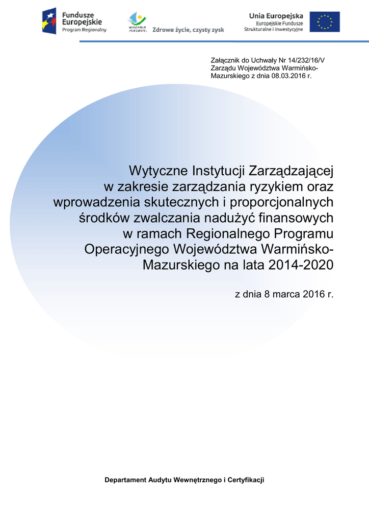 Załącznik do Uchwały Nr 14/232/16/V Zarządu Województwa WarmińskoMazurskiego z dnia 08.03.2016 r. Wytyczne Instytucji Zarządzającej w zakresie zarządzania ryzykiem oraz wprowadzenia skutecznych i proporcjonalnych środków zwalczania nadużyć finansowych w ramach Regionalnego Programu Operacyjnego Województwa WarmińskoMazurskiego na lata 2014-2020 z dnia 8 marca 2016 r. Departament Audytu Wewnętrznego i Certyfikacji Wytyczne Instytucji Zarządzającej w zakresie zarządzania ryzykiem oraz wprowadzenia skutecznych i proporcjonalnych środków zwalczania nadużyć finansowych w ramach Regionalnego Programu Operacyjnego Województwa Warmińsko-Mazurskiego na lata 2014-2020 2 SPIS TREŚCI Podstawy prawne przeciwdziałania nadużyciom finansowym ......................................................... 3 Wykaz skrótów................................................................................................................................ 5 Słownik pojęć .................................................................................................................................. 6 Rozdział 1 Zakres i cel wytycznych ................................................................................................. 8 Rozdział 2 Zarządzanie ryzykiem.................................................................................................... 9 2.1 Instytucje odpowiedzialne za zarządzanie ryzykiem .............................................................. 9 Rozdział 3 Środki mające na celu zwalczanie nadużyć finansowych............................................. 10 3.1 Zapobieganie .................................................................................................................. 10 3.1.1 Kultura etyczna............................................................................................................. 12 3.1.2 System zarządzania i kontroli ....................................................................................... 12 3.1.3 Identyfikacja stanowisk wrażliwych .............................................................................. 13 3.1.4 Przeciwdziałanie przypadkom konfliktu interesów ....................................................... 13 3.1.5 System kontroli wewnętrznej ....................................................................................... 15 3.1.6 Kontrola systemowa .................................................................................................... 15 3.1.7 Powszechne informowanie o kontrolach projektów ...................................................... 16 3.1.8 Szkolenia i podnoszenie świadomości w zakresie zwalczania nadużyć finansowych .. 16 3.2 Wykrywanie i zgłaszanie zidentyfikowanych nadużyć finansowych ................................. 17 3.3 Raportowanie i korygowanie ........................................................................................... 19 Rozdział 4 Ocena ryzyka nadużyć finansowych ............................................................................ 20 4.1 Zespół ds. oceny ryzyka ..................................................................................................... 20 4.2 Metodyka przeprowadzenia oceny ..................................................................................... 22 Załączniki ...................................................................................................................................... 23 Załącznik nr 1 Rejestr zidentyfikowanych ryzyk nadużyć finansowych .......................................... 23 Załącznik nr 2 Kodeks etycznego postępowania Pracowników wdrażających Regionalny Program Operacyjny Województwa Warmińsko-Mazurskiego na lata 2014-2020 ................. 24 Załącznik nr 3 Instrukcja Korzystania z narzędzia oceny ryzyka ................................................... 27 Wytyczne Instytucji Zarządzającej w zakresie zarządzania ryzykiem oraz wprowadzenia skutecznych i proporcjonalnych środków zwalczania nadużyć finansowych w ramach Regionalnego Programu Operacyjnego Województwa Warmińsko-Mazurskiego na lata 2014-2020 3 Podstawy prawne przeciwdziałania nadużyciom finansowym Akty prawa UE 1. Rozporządzenie Parlamentu Europejskiego i Rady (UE) nr 1303/2013 z dnia 17 grudnia 2013 r. ustanawiające wspólne przepisy dotyczące Europejskiego Funduszu Rozwoju Regionalnego, Europejskiego Funduszu Społecznego, Funduszu Spójności, Europejskiego Funduszu Rolnego na rzecz Rozwoju Obszarów Wiejskich oraz Europejskiego Funduszu Morskiego i Rybackiego oraz ustanawiające przepisy ogólne dotyczące Europejskiego Funduszu Rozwoju Regionalnego, Europejskiego Funduszu Społecznego, Funduszu Spójności i Europejskiego Funduszu Morskiego i Rybackiego oraz uchylające rozporządzenie Rady (WE) nr 1083/2006 (Dz.U.UE.L.2013.347.320 z dnia 20.12.2013 ze zm.), zwane dalej rozporządzeniem ogólnym; 2. Rozporządzenie z dnia Parlamentu 25.10.2012 r. w Europejskiego i sprawie zasad Rady (UE, Euratom) nr 966/2012 finansowych mających zastosowanie do budżetu ogólnego Unii oraz uchylające rozporządzenie Rady (WE, Euratom) nr 1605/2002 (Dz. Urz. UE L 298 z 26.10.2012 r., str. 1 ze zm.), zwane dalej rozporządzeniem finansowym; 3. Konwencja o ochronie interesów finansowych Wspólnot Europejskich, sporządzona w Brukseli dnia 26 lipca 1995 r., Protokół do Konwencji o ochronie interesów finansowych Wspólnot Europejskich z dnia 26 lipca 1995 r., sporządzony w Dublinie dnia 27 września 1996 r., Protokół w sprawie interpretacji w trybie orzeczenia wstępnego przez Trybunał Sprawiedliwości Wspólnot Europejskich Konwencji o ochronie interesów finansowych Wspólnot Europejskich z dnia 26 lipca 1995 r., sporządzony w Brukseli dnia 29 listopada 1996 r., oraz Drugi Protokół do Konwencji o ochronie interesów finansowych Wspólnot Europejskich z dnia 26 lipca 1995 r., sporządzony w Brukseli dnia 19 czerwca 1997 r. (Dz.U.20