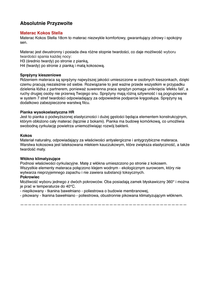 Absolutnie Przyzwoite Materac Kokos Stella Materac Kokos Stella 18cm to materac niezwykle komfortowy, gwarantujący zdrowy i spokojny sen. Materac jest dwustronny i posiada dwa różne stopnie twardości, co daje możliwość wyboru twardości spania każdej nocy: H3 (średnio twardy) po stronie z pianką, H4 (twardy) po stronie z pianką i matą kokosową. Sprężyny kieszeniowe Rdzeniem materaca są sprężyny najwyższej jakości umieszczone w osobnych kieszonkach, dzięki czemu pracują niezależnie od siebie. Rozwiązanie to jest ważne przede wszystkim w przypadku dzielenia łóżka z partnerem, ponieważ suwerenna praca sprężyn pomaga uniknięcia 'efektu fali', a ruchy drugiej osoby nie przerwą Twojego snu. Sprężyny mają różną sztywność i są pogrupowane w system 7 stref twardości odpowiadający za odpowiednie podparcie kręgosłupa. Sprężyny są dodatkowo zabezpieczone warstwą filcu. Pianka wysokoelastyczna HR Jest to pianka o podwyższonej elastyczności i dużej gęstości będąca elementem konstrukcyjnym, którym obłożono cały materac (łącznie z bokami). Pianka ma budowę komórkową, co umożliwia swobodną cyrkulację powietrza uniemożliwiając rozwój bakterii. Kokos Materiał naturalny, odpowiadający za właściwości antyalergiczne i antygrzybiczne materaca. Warstwa kokosowa jest lateksowana mlekiem kauczukowym, które zwiększa elastyczność, a także twardość maty. Włókno klimatyzujące Podnosi właściwości cyrkulacyjne. Matę z włókna umieszczono po stronie z kokosem. Wszystkie elementy materaca połączono klejem wodnym - ekologicznym surowcem, który nie wytwarza nieprzyjemnego zapachu i nie zawiera substancji toksycznych. Pokrowiec Możliwość wyboru jednego z dwóch pokrowców. Oba posiadają zamek błyskawiczny 360° i można je prać w temperaturze do 40°C. - niepikowany - tkanina bawełniano - poliestrowa o budowie membranowej, - pikowany - tkanina bawełniano - poliestrowa, obustronnie pikowana klimatyzującym włóknem. ———————————————————————————————————————————