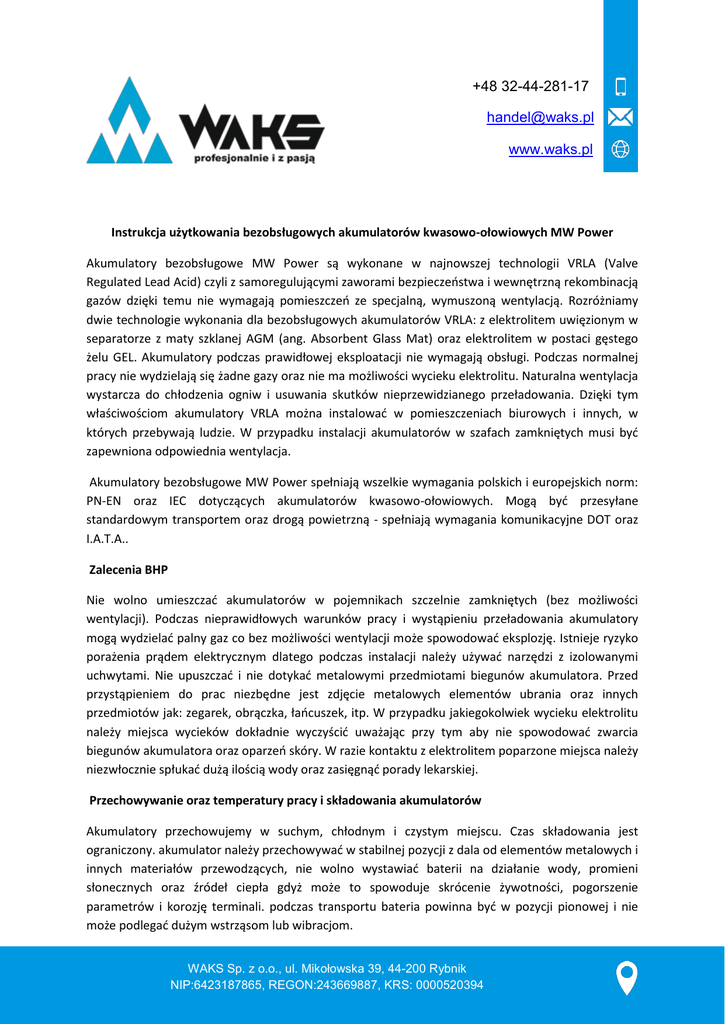 +48 32-44-281-17 [email protected] www.waks.pl Instrukcja użytkowania bezobsługowych akumulatorów kwasowo-ołowiowych MW Power Akumulatory bezobsługowe MW Power są wykonane w najnowszej technologii VRLA (Valve Regulated Lead Acid) czyli z samoregulującymi zaworami bezpieczeństwa i wewnętrzną rekombinacją gazów dzięki temu nie wymagają pomieszczeń ze specjalną, wymuszoną wentylacją. Rozróżniamy dwie technologie wykonania dla bezobsługowych akumulatorów VRLA: z elektrolitem uwięzionym w separatorze z maty szklanej AGM (ang. Absorbent Glass Mat) oraz elektrolitem w postaci gęstego żelu GEL. Akumulatory podczas prawidłowej eksploatacji nie wymagają obsługi. Podczas normalnej pracy nie wydzielają się żadne gazy oraz nie ma możliwości wycieku elektrolitu. Naturalna wentylacja wystarcza do chłodzenia ogniw i usuwania skutków nieprzewidzianego przeładowania. Dzięki tym właściwościom akumulatory VRLA można instalować w pomieszczeniach biurowych i innych, w których przebywają ludzie. W przypadku instalacji akumulatorów w szafach zamkniętych musi być zapewniona odpowiednia wentylacja. Akumulatory bezobsługowe MW Power spełniają wszelkie wymagania polskich i europejskich norm: PN-EN oraz IEC dotyczących akumulatorów kwasowo-ołowiowych. Mogą być przesyłane standardowym transportem oraz drogą powietrzną - spełniają wymagania komunikacyjne DOT oraz I.A.T.A.. Zalecenia BHP Nie wolno umieszczać akumulatorów w pojemnikach szczelnie zamkniętych (bez możliwości wentylacji). Podczas nieprawidłowych warunków pracy i wystąpieniu przeładowania akumulatory mogą wydzielać palny gaz co bez możliwości wentylacji może spowodować eksplozję. Istnieje ryzyko porażenia prądem elektrycznym dlatego podczas instalacji należy używać narzędzi z izolowanymi uchwytami. Nie upuszczać i nie dotykać metalowymi przedmiotami biegunów akumulatora. Przed przystąpieniem do prac niezbędne jest zdjęcie metalowych elementów ubrania oraz innych przedmiotów jak: zegarek, obrączka, łańcuszek, itp. W przypadku jakiegokolwiek wycieku elektrolitu należy miejsca wycieków dokładnie wyczyścić uważając przy tym aby nie spowodować zwarcia biegunów akumulatora oraz oparzeń skóry. W razie kontaktu z elektrolitem poparzone miejsca należy niezwłocznie spłukać dużą ilością wody oraz zasięgnąć porady lekarskiej. Przechowywanie oraz temperatury pracy i składowania akumulatorów Akumulatory przechowujemy w suchym, chłodnym i czystym miejscu. Czas składowania jest ograniczony. akumulator należy przechowywać w stabilnej pozycji z dala od elementów metalowych i innych materiałów przewodzących, nie wolno wystawiać baterii na działanie wody, promieni słonecznych oraz źródeł ciepła gdyż może to spowoduje skrócenie żywotności, pogorszenie parametrów i korozję terminali. podczas transportu bateria powinna być w pozycji pionowej i nie może podlegać dużym wstrząsom lub wibracjom. WAKS Sp. z o.o., ul. Mikołowska 39, 44-200 Rybnik NIP:6423187865, REGON:243669887, KRS: 0000520394 +48 32-44-281-17 [email protected] www.waks.pl Maksymalny czas przechowywania określa się przy założeniu zachowania 50% pojemności maksymalnej. Przybliżony czas składowania przedstawia poniższa tabela: Po upływie tego okresu należy akumulatory doładować. Akumulatory należy użytkować i składować stosując się do warunków temperaturowych określonych poniżej: składowanie od -20 do 40C (uwaga w temperaturach minusowych drastycznie spada pojemność akumulatorów) ładowanie od 0 do 40C (zalecane) rozładowanie -20 do 50C Uwaga: W przypadku innego zakresu temperatury pracy należy skontaktować się z producentem akumulatorów. Nominalna temperatura pracy akumulatorów w pracy buforowej przy, której uzyskiwana jest maksymalna żywotność wynosi 20-25C dlatego bezwzględnie należy przestrzegać tej zalecanej temperatury. Oczekiwany czas życia baterii dla pracy buforowej skraca się o połowę z każdym wzrostem temperatury o 10˚C począwszy od wartości nominalnej. Skrócenie czasu życia przy pracy w temperaturze 40˚C jest już więc bardzo znaczące. Z tego powodu należy unikać pracy baterii w wysokich temperaturach. Instalacja akumulatorów. Przed uruchomieniem wszystkie ogniwa muszą być sprawdzone pod względem uszkodzeń mechanicznych, prawidłowej polaryzacji i prawidłowego wykonania połączeń. Śruby połączeń między-ogniwowych należy dokręcać kluczem dynamometrycznym z siłą podaną przez producenta baterii. Nie wolno łączyć w zestawy baterii różnych typów lub o różnej historii użytkowania. Postępowanie takie grozi uszkodzeniem i szybkim zużyciem akumulatorów. Instalowane akumulatory mogą pracować w dowolnej pozycji za wyjątkiem ładowania akumulatorów w pozycji terminalami WAKS Sp. z o.o., ul. Mikołowska 39, 44-200 Rybnik NIP:6423187865, REGON:243669887, KRS: 0000520394 +48 32-44-281-17 [email protected] www.waks.pl biegunów do dołu. W przypadku przeładowania może się zdarzyć, że przy pracy w pozycji „do góry dnem” nastąpi wyciek elektrolitu (zaleca się instalowanie akumulatorów w normalnej pozycji terminalami do góry). Ładowanie i rozładowywanie akumulatorów. Napięcie ładowania konserwującego: Zalecane napięcie ładowania konserwującego wynosi 2,27V/ogniwo dla temp. 20o C. Jeżeli temperatura otoczenia różni się o +/-5 o C zaleca się dobranie napięcia konserwującego jak w tabeli. Z uwagi na zjawisko rekombinacji gazowej, może wystąpić różnica +/-2% w napięciu pojedynczego ogniwa. Niemniej napięcie całkowite akumulatora powinno mieścić się w określonych powyżej granicach. Podczas pracy cyklicznej rozładowanie/ładowanie, napięcie ładowania powinno wynosić od 2,40V/ogniwo do 2,50V/ogniwo czyli od 14,4 do 15,0V/12V. Prąd ładowania. Akumulatory VRLA powinny być używane wyłącznie z regulowanymi urządzeniami do ładowania stałym napięciem i p