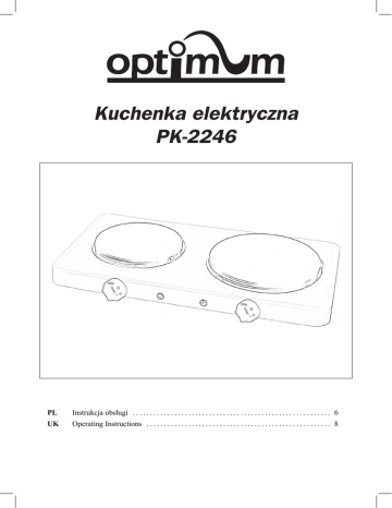 Kuchenka elektryczna PK-2246 PL Instrukcja obsługi . . . . . . . . . . . . . . . . . . . . . . . . . . . . . . . . . . . . . . . . . . . . . . . . . . . . . . . . . . 6 UK Operating Instructions . . . . . . . . . . . . . . . . . . . . . . . . . . . . . . . . . . . . . . . . . . . . . . . . . . . . . . 8 KARTA GWARANCYJNA NR .............. Ważna wraz z dowodem zakupu Sprzęt przeznaczony wyłącznie do użytku domowego Nazwa sprzętu: Kuchenka elektryczna Typ, model: PK-2246 Nr fabryczny: ..................................................................................... Data sprzedaży: . ................................................................................ Rachunek nr: . .................................................................................... ................................................. pieczątka i podpis sprzedawcy SERWIS ARCONET ul. Grobelnego 4 05-300 MIŃSK MAZOWIECKI tel. +48 25 759-12-31, INFOLINIA: 0801-44-33-22 LISTA PUNKTÓW SERWISOWYCH: www.arconet.pl IMPORTER / DYSTRYBUTOR: Expo-service Sp. z o. o. 00-710 Warszawa, Al. Witosa 31/22, Polska tel. +48 25 759 1881, fax +48 25 759 1885 [email protected] www.optimum.hoho.pl 2 Adres do korespondencji: Expo-service Sp. z o. o. 05-300 Mińsk Mazowiecki ul. Grobelnego 4 PK2246_IM_200_23092015 WARUNKI 24 MIESIĘCZNEJ GWARANCJI 1. Sprzedawca ponosi odpowiedzialność za wady fizyczne przedmiotu w okresie 24 miesięcy od daty sprzedaży. Gwarancja dotyczy wyrobów zakupionych w Polsce i jest ważna na terytorium Rzeczypospolitej Polskiej. Ujawnione w tym okresie wady będą usuwane bezpłatnie przez wymienione w karcie gwarancyjnej zakłady serwisowe w terminach nie dłuższych niż 14 dni od daty dostarczenia sprzętu do zakładu serwisowego (na podstawie prawidłowo wypełnionej przez punkt sprzedaży niniejszej karty gwarancyjnej). W wyjątkowych przypadkach termin ten może być wydłużony do 21 dni - jeżeli naprawa wymaga sprowadzenia części od producenta. 2. Reklamujący powinien dostarczyć sprzęt do punktu przyjęć najlepiej w orginalnym opakowaniu fabrycznym lub innym odpowiednim do zabezpieczenia przed uszkodzeniami. Dotyczy to również wysyłki sprzętu. Jeżeli w pobliżu miejsca zamieszkania nie ma punktu przyjęć, reklamujący może wysłać pocztą sprzęt do naprawy w centralnym punkcie serwisowym w Mińsku Mazowieckim, na koszt gwaranta. 3. Zgłoszenie wady lub uszkodzenia sprzętu przyjmowane są przez punkty serwisowe. 4. Nabywcy przysługuje prawo wymiany sprzętu na nowy lub zwrot gotówki tylko w przypadku gdy: • w serwisie stwierdzono wadę fabryczną niemożliwą do usunięcia • w okresie gwarancji wystąpi konieczność dokonania 3 napraw, a sprzęt nadal wykazuje wady uniemożliwiające eksploatację zgodną z przeznaczeniem. 5. W przypadku wymiany sprzętu, okres gwarancji dla sprzętu liczy się od daty jego wymiany. 6. Pojęcie ”naprawa” nie obejmuje czynności przewidzianych w instrukcji obsługi (np. bieżąca konserwacja, odkamienianie), do wykonania których zobowiązany jest Użytkownik we własnym zakresie. 7. Gwarancją nie są objęte: a) elementy szkalne (np. dzbanki, talerze), sznury przyłączeniowe do sieci, wtyki, gniazda, żarówki, noże, elementy eksploatacyjne (np. filtry, worki, misy, blendery, noże, tarki, wirówki, pokrywy, uchwyty noża), b) uszkodzenia mechaniczne, termiczne, chemiczne i wszystkie inne spowodowane działaniem bądź zaniechaniem działania przez Użytkownika albo działaniem siły zewnętrznej (przepięcia w sieci, wyładowania atmosferyczne, przedmioty obce, które dostały się do wnętrza sprzętu, korozja, pył, etc.), c) uszkodzenia wynikłe wskutek: • samodzielnych napraw • przeróbek i zmian konstrukcyjnych dokonywanych przez użytkownika lub osoby trzecie • okoliczności, za które nie odpowiada ani wytwórca ani sprzedawca, a w szczególności na skutek niewłaściwej lub niezgodnej z instrukcją instalacji, użytkowania, braku dbałości o sprzęt albo innych przyczyn leżących po stronie użytkownika lub osób trzecich d) celowe uszkodzenia sprzętu, e) czynności konserwacyjne, wymiana części posiadających określoną żywotność (bezpieczniki, żarówki, etc.), f) czynności przewidzianych w instrukcji obsługi, do wykonania których zobowiązany jest Użytkownik we własnym zakresie i na własny koszt np. zainstalowanie, sprawdzenie działania, etc. 8. Samowolne zmiany wpisów w karcie gwarancyjnej powodują utratę gwarancji. Karta gwarancyjna bez wpisanej nazwy urządzenia, typu, nr fabrycznego, dołączonego dowodu zakupu, wpisania daty sprzedaży oraz czytelnej pieczątki sklepu jest nieważna. 9. Sprzęt przeznaczony jest wyłącznie do użytku domowego, w przypadku innego użytkowania traci gwarancję. 10. Gwarancja na sprzedany towar konsumpcyjny nie wyłącza, nie ogranicza ani nie zawiesza uprawnień kupującego wynikających z niezgodności towaru z umową. 3 4 5 Kuchenka elektryczna PK-2246 INSTRUKCJA OBSŁUGI DANE TECHNICZNE: KUCHENKA PK-2246 (DWUPŁYTKOWA) Zasilanie: 220-240 V ~ 50/60Hz Moc: 1500 W + 1000 W Szanowny Kliencie, Dziękujemy za wybór naszego produktu. Przed rozpoczęciem korzystania z urządzenia prosimy o uważne zapoznanie się z treścią niniejszej instrukcji obsługi w celu optymalizacji zadowolenia z jej użytkowania oraz wyeliminowania problemów, które mogą wyniknąć z nieprawidłowego użycia urządzenia. Należy uważnie przeczytać poniższe informacje oraz przechowywać instrukcję w dostępnym miejscu. Przekazując urządzenie innej osobie należy dołączyć instrukcję, instrukcja jest częścią produktu. Opisane zasady bezpieczeństwa nie eliminują wszystkich zagrożeń, dlatego zawsze trzeba stosować odpowiednie środki ostrożności. Producent nie ponosi odpowiedzialności za jakiekolwiek szkody wynikające z nieprzestrzegania niniejszej instrukcji obsługi, niewłaściwego użytkowania lub nieprawidłowego obchodzenia się z urządzeniem. • Nie 