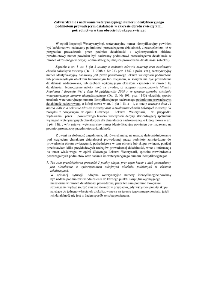 Zatwierdzanie i nadawanie weterynaryjnego numeru identyfikacyjnego podmiotom prowadzącym działalność w zakresie obrotu zwierzętami, pośrednictwa w tym obrocie lub skupu zwierząt W opinii Inspekcji Weterynaryjnej, weterynaryjny numer identyfikacyjny powinien być kaŜdorazowo nadawany podmiotowi prowadzącemu działalność, z zastrzeŜeniem, iŜ w przypadku prowadzenia przez podmiot działalności z wykorzystaniem obiektu, przedmiotowy numer powinien być nadawany podmiotowi prowadzącemu działalność w ramach określonego w decyzji administracyjnej miejsca prowadzenia działalności (obiektu). Zgodnie z art. 5 ust. 5 pkt 2 ustawy o ochronie zdrowia zwierząt oraz zwalczaniu chorób zakaźnych zwierząt (Dz. U. 2008 r. Nr 213 poz. 1342 z późn. zm.), weterynaryjny numer identyfikacyjny nadawany jest przez powiatowego lekarza weterynarii podmiotowi lub poszczególnym obiektom budowlanym lub miejscom, w których ma być prowadzona działalność nadzorowana, lub osobom wykonującym określone czynności w ramach tej działalności. Jednocześnie naleŜy mieć na uwadze, iŜ przepisy rozporządzenia Ministra Rolnictwa i Rozwoju Wsi z dnia 16 października 2008 r. w sprawie sposobu ustalania weterynaryjnego numeru identyfikacyjnego (Dz. U. Nr 193, poz. 1193) określają sposób ustalania weterynaryjnego numeru identyfikacyjnego nadawanego podmiotom prowadzącym działalność nadzorowana, o której mowa w art. 1 pkt 1 lit. a—1, o oraz p ustawy z dnia 11 marca 2004 r. o ochronie zdrowia zwierząt oraz o zwalczaniu chorób zakaźnych zwierząt. W związku z powyŜszym, w opinii Głównego Lekarza Weterynarii, w przypadku wydawania przez powiatowego lekarza weterynarii decyzji stwierdzającej spełnianie wymagań weterynaryjnych określonych dla działalności nadzorowanej, o której mowa w art. 1 pkt 1 lit. c w/w ustawy, weterynaryjny numer identyfikacyjny powinien być nadawany na podmiot prowadzący przedmiotową działalność. Z uwagi na złoŜoność zagadnienia, jak równieŜ mając na uwadze duŜe zróŜnicowanie pod względem charakteru działalności prowadzonej przez podmioty zatwierdzone do prowadzenia obrotu zwierzętami, pośrednictwa w tym obrocie lub skupu zwierząt, poniŜej przedstawiam kilka przykładowych rodzajów prowadzonej działalności, wraz z informacją na temat właściwego, w opinii Głównego Lekarza Weterynarii, sposobu zatwierdzenia poszczególnych podmiotów oraz nadania im weterynaryjnego numeru identyfikacyjnego: 1. Ten sam przedsiębiorca prowadzi 2 punkty skupu, przy czym kaŜdy z nich prowadzony jest niezaleŜnie, z wykorzystaniem odrębnych obiektów połoŜonych w róŜnych lokalizacjach. W opisanej sytuacji, odrębne weterynaryjne numery identyfikacyjne powinny być nadane podmiotowi w odniesieniu do kaŜdego punktu skupu,funkcjonującego niezaleŜnie w ramach działalności prowadzonej przez ten sam podmiot. PowyŜsze rozwiązanie wydaje się być słuszne równieŜ w przypadku, gdy wszystkie punkty skupu naleŜące do jednego właściciela zlokalizowane są na terenie tego samego powiatu, jeŜeli ich działalność nie jest w Ŝaden sposób ze sobą powiązana. 2. Na terenie tego samego obiektu, dzierŜawionego od właściciela, prowadzona jest (z zachowaniem wymaganego rozdziału czasowego) działalność dwóch podmiotów, polegająca na skupie zwierząt. KaŜdy z podmiotów prowadzących działalność na terenie obiektu powinien być zatwierdzony przez powiatowego lekarza weterynarii właściwego dla miejsca połoŜenia obiektów oraz powinien mieć nadany odrębny weterynaryjny numer identyfikacyjny. Ponadto, w decyzjach administracyjnych wydanych przez powiatowego lekarza weterynarii w związku z zatwierdzeniem działalności obu podmiotów powinny się znajdować informacje na temat okresów prowadzenia działalności przez poszczególne podmioty, ustalonych w sposób gwarantujący zachowanie wymaganego rozdziału czasowego dla prowadzenia poszczególnych działalności. RównieŜ na potrzeby nadzoru weterynaryjnego nad działalnością prowadzoną przez poszczególne podmioty, kaŜdy z zatwierdzonych punktów skupu powinien być traktowany jako niezaleŜna działalność. NaleŜy przy tym zaznaczyć, iŜ w przypadku stwierdzenia, Ŝe przy prowadzeniu działalności przez podmiot/podmioty naruszane są wymagania weterynaryjne, przepisy art. 8 i 9 ustawy o ochronie zdrowia zwierząt oraz o zwalczaniu chorób zakaźnych zwierząt stosuje się odpowiednio. 3. Podmiot deklaruje chęć prowadzenia działalności polegającej na skupie zwierząt z kilku gospodarstw jednym środkiem transportu (i bez wykorzystania obiektów) w celu dostarczania ich bezpośrednio do rzeźni. Przedmiotowa działalność prowadzona będzie na terenie kilku powiatów/województw, w związku z czym pojawia się pytanie, czy nadzór nad działalnością podmiotu powinien być prowadzony przez jednego powiatowego lekarza weterynańi, czy teŜ przez powiatowych lekarzy weterynarii właściwych dla wszystkich powiatów, w których podmiot dokonywałby skupu zwierząt Zgodnie z artykułem 5. ust. 1 pkt 1 ustawy o ochronie zdrowia zwierząt oraz o zwalczaniu chorób zakaźnych zwierząt „podjęcie działalności nadzorowanej, o której mowa w art. 1 pkt 1 lit. a, c - f, h, i, 1, jest dozwolone po stwierdzeniu przez powiatowego lekarza weterynarii właściwego ze względu na przewidywane miejsce jej prowadzenia, w drodze decyzji, spełniania wymagań weterynaryjnych określonych dla prowadzenia danego rodzaju działalności". Zgodnie z opinią Głównego Lekarza Weterynarii, w opisanej sytuacji podmiot, który w ramach swojej działalności nie ma zamiaru wykorzystywać obiektów, powinien złoŜyć wniosek o zatwierdzenie działalności wyłącznie do powiatowego lekarza weterynarii właściwego dla siedziby podmiotu. W/w powiatowy lekarz weterynarii, po zatwierdzeniu podmiotu i nadaniu mu weterynaryjnego numeru identyfikacyjnego, będzie prowadził nadzór nad jeg