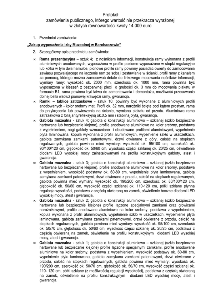 Protokół zamówienia publicznego, którego wartość nie przekracza wyrażonej w złotych równowartości kwoty 14.000 euro 1. Przedmiot zamówienia: „Zakup wyposażenia Izby Muzealnej w Barchaczowie” 2. Szczegółowy opis przedmiotu zamówienia: • Rama prezentacyjna – sztuk 4; z nośnikiem informacji, konstrukcja ramy wykonana z profili aluminiowych anodowanych, wyposażona w profile poziome wyposażone w stopki regulacyjne lub kółka w tym dwa hamulce, pionowe profile ramy powinny posiadać owierty do zamocowania zawiasu pozwalającego na łączenie ram ze sobą i zestawianie w ścianki, profil ramy z kanałem za pomocą, którego można zamocować detale do linkowego mocowania nośników informacji, wymiary ramy: wysokość ok. 2000 mm, szerokość ok. 1000 mm, rama powinna być wyposażona w kieszeń z bezbarwnej plexi o grubości ok. 3 mm do mocowania plakatu w formacie B1, rama powinna być łatwa do zamontowania i demontażu, możliwość przesuwania dolnej belki wzdłuż pionowej krawędzi ramy, gwarancja. • Ramki – tablice zatrzaskowe - sztuk 10; powinny być wykonane z aluminiowych profili anodowanych - kolor srebrny mat. Profil ok. 32 mm, narożniki ścięte pod kątem prostym, rama do przykręcenia lub powieszenia na ścianie, wymiana plakatu od przodu. Aluminiowa rama zatrzaskowa z folią antyrefleksyjną ok.0,5 mm i stabilną płytą, gwarancja. • Gablota muzealna - sztuk 4; gablota o konstrukcji aluminiowo – szklanej (szkło bezpieczne hartowane lub bezpiecznie klejone), profile anodowane aluminiowe na kolor srebrny, podstawa z wypełnieniem, nogi gabloty wzmacniane i obudowane profilami aluminiowymi, wypełnienie płyta laminowana, kopuła wykonana z profili aluminiowych, wypełnienie szkło w uszczelkach, gablota zamykana zamkami patentowymi, drzwi otwierane z góry, całość na stopkach regulowanych, gablota powinna mieć wymiary: wysokość ok. 95/100 cm, szerokość ok. 90/100/120 cm, głębokość ok. 50/60 cm, wysokość części szklanej ok. 20/25 cm, oświetlenie diodami LED wysokiej mocy zainstalowanymi na profilu konstrukcyjnym gabloty, atest i gwarancja. • Gablota muzealna - sztuk 3; gablota o konstrukcji aluminiowo – szklanej (szkło bezpieczne hartowane lub bezpiecznie klejone), profile anodowane aluminiowe na kolor srebrny, podstawa z wypełnieniem, wysokość podstawy ok. 60-80 cm, wypełnienie płyta laminowana, gablota zamykana zamkami patentowymi, drzwi otwierane z przodu, całość na stopkach regulowanych, gablota powinna mieć wymiary: wysokość ok. 190/200 cm, szerokość ok. 80/100/120 cm, głębokość ok. 50/60 cm, wysokość części szklanej ok. 110-120 cm, półki szklane płynna regulacja wysokości, podstawa z częścią otwieraną na zamek, oświetlenie boczne diodami LED wysokiej mocy, atest i gwarancja. • Gablota muzealna - sztuk 2; gablota o konstrukcji aluminiowo – szklanej (szkło bezpieczne hartowane lub bezpiecznie klejone) profile łączone specjalnymi zamkami oraz głowicami narożnikowymi, profile anodowane aluminiowe na kolor srebrny, podstawa z wypełnieniem, kopuła wykonana z profili aluminiowych, wypełnienie szkło w uszczelkach, wypełnienie płyta laminowana, gablota zamykana zamkami patentowymi, drzwi otwierane z przodu, całość na stopkach regulowanych, gablota powinna mieć wymiary: wysokość ok. 95/100 cm, szerokość ok. 50/70 cm, głębokość ok. 50/60 cm, wysokość części szklanej ok. 20/25 cm, podstawa z częścią otwieraną na zamek, oświetlenie na profilu konstrukcyjnym diodami LED wysokiej mocy, atest i gwarancja. • Gablota muzealna - sztuk 1; gablota o konstrukcji aluminiowo – szklanej (szkło bezpieczne hartowane lub bezpiecznie klejone) profile łączone specjalnymi zamkami, profile anodowane aluminiowe na kolor srebrny, podstawa z wypełnieniem, wysokość podstawy ok. 60-80 cm, wypełnienie płyta laminowana, gablota zamykana zamkami patentowymi, drzwi otwierane z przodu, całość na stopkach regulowanych, gablota powinna mieć wymiary: wysokość ok. 190/200 cm, szerokość ok. 50/70 cm, głębokość ok. 50/70 cm, wysokość części szklanej ok. 110- 120 cm, półki szklane (z możliwością regulacji wysokości), podstawa z częścią otwieraną na zamek, oświetlenie na profilu konstrukcyjnym diodami LED wysokiej mocy, atest i gwarancja. • Krzesło konferencyjne z pulpitem- sztuk 25; stelaż zamknięty stalowy w kolorze czarnym, siedzisko i oparcie miękkie tapicerowane (kolor do uzgodnienia), nogi zakończone stopkami zabezpieczającymi przed rysowaniem podłogi, krzesło powinno posiadać atest bezpieczeństwa, szerokość siedziska ok. 50 cm, głębokość siedziska ok. 45 cm, wysokość siedziska ok. 50 cm. • Projektor multimedialny – sztuk 1; jasność min. 300 ANSI, rozdzielczość min. 1024 x 768 XGA, kontrast min. 2000:1, żywotność lampy min. 5000 h, gwarancja producenta 36 m., przewód VGA, pilot wirtualny, technologia DLP®-Link™ lub równoważna, wyposażenie dodatkowe: uchwyt przysufitowy, • Ekran projekcyjny – sztuk 1; manualny, rolowany, szerokość min. 220 cm, wysokość min. 165 cm, format 4:3, możliwość zamocowania na ścianie lub suficie, Gwarancja. • Flipchart – sztuk 1; sucho ścieralny, magnetyczny, stelaż mobilny na 5 kółkach ( w tym 3 blokowane), regulowana wysokość od min. 1750 do min. 2000 mm, metalowa, szeroka półka na akcesoria, wymiary tablicy min. 67,5 x 100 cm, regulowany rozstaw haków na papier, gwarancja na powierzchnię min. 1 rok. 3. Rozeznanie rynku: a. Zapytanie umieszczono na stronie internetowej Gminy Łabunie ( www.labunie.com.pl) w zakładce Aktualności i Biuletynie Informacji Publicznej (www.uglabunie.bip.lubelskie.pl) w zakładce Budżet i przetargi. Publikacja ogłoszeń trwała od 14 listopada do 21 listopada do godz. 15.00. b. Oferty otrzymano od: Lp. Nazwa firmy, adres Cena netto Cena brutto 1. Boltimor Group Sp. z o.o. ul. 36 585,35 zł 45 000,00 zł 31 095,00 zł 38 246,85 zł 20 03