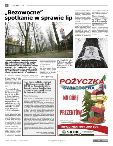 4 GLIWICE „Bezowocne” spotkanie w sprawie lip Autor tekstu dodaje, że drzewa rosnące w skrajni jezdni, ograniczają widoczność i mogą być powodem niebezpiecznych sytuacji. Co zrozumiałe, protestujący mieszkańcy powątpiewają w tę ocenę zagrożenia drogowego, jakie rzekomo stanowią lipy wielu wypadków. Po kolei odpadają argumenty urzędu miasta... - twierdzą mieszkańcy. Nieoczekiwanie, w sukurs obrońcom lip przyszła Martyna Wojciechowska, znana dziennikarka i podróżniczka. - Czy wycinka jest odpowiednią metodą rozwiązania tego problemu? W tym miejscu można przecież wprowadzić ograniczenie prędkości lub progi zwalniające, a nawet ruch jednokierunkowy. Poza tym, z danych z Komendy Miejskiej Policji jasno wynika, że na ul. Mickiewicza nie dochodzi do Ubiegłotygodniowe spotkanie mieszkańców protestujących przeciwko wycince 127 lip z wiceprezydentem Gliwic Piotrem Wieczorkiem nie przyniosło żadnego rezultatu. - Przy całej naszej chęci do osiągnięcia kompromisu, wciąż natrafiamy na twardy mur ze strony urzędników skarżą się mieszkańcy z ul. Mickiewicza. ty, kwestia ochrony konserwatorskiej została zbagatelizowana przed urząd miasta - tłumaczy Marek Rawecki. Na wtorkowym spotkaniu, oprócz zastępcy prezydenta miasta, obecny był także wicedyrektor Zarządu Dróg Miejskich Grzegorz Wieczorek, inspektor ZDM nadzorujący tę sprawę oraz przedstawiciele mieszkańców wraz z prawnikiem. - To wszystko są - Potwierdziły się nasze obawy - ZDM nie zmieni swojej decyzji ws. wycinki drzew. Jak nam powiedziano, żadne konsultacje społeczne również nie wchodzą w grę - informuje nas Marek Rawecki, członek grupy protestujących mieszkańców. Warto dodać, że w najnowszym numerze wydawanego przez magistrat Miejskiego Serwisu Informacyjnego również poruszono ten budzący kontrowersje temat. Jednak teza zawarta w artykule, jakoby wycinka musiała się odbyć ze względu na przestrzeganie przepisów odnośnie dróg publicznych nie przekonuje mieszkańców. - Powinna być także brana pod uwagę kwestia opieki nad zabytkami. Lipy na ul. Mickiewicza stanowią element miasta, który powstał przed wojną, w odmiennych warunkach historycznych. Istnieje możliwość tzw. odstępstwa. Nieste- W tekście opublikowanym w MSI zdementowano również spekulacje, jakoby wycinka była podyktowana chęcią pociągnięcia przez ul. Mickiewicza obwodnicy Gliwic. Podczas ubiegłotygodniowej wizyty w jednym z gliwickich liceów, Wojciechowska zadeklarowała swoje poparcie dla akcji mieszkańców z ul. Mickiewicza. (mpp) zwykłe plotki. Nie było i nie ma takich planów - czytamy w tekście pt. „Kolizja z lipami“. R E K L A M A . . . . . . . . . . . . . . . . . . . . . . . . . . . . . . Apel Radnych Rady Miejskiej w Gliwicach, członków Klubu PO RP do Prezydenta Gliwic Pana Zygmunta Frankiewicza w sprawie planowanej wycinki lip przy Alei Mickiewicza Panie Prezydencie, Radni zrzeszeni w klubie PO RP zwracają się do Pana z apelem o powstrzymanie planowanej wycinki 127 lip rosnących w Alei Mickiewicza. Aleja Mickiewicza, Plac Grunwaldzki to są symbole Gliwic. To niezwykłe założenie urbanistyczne, przykład jak mądrzy architekci i urbaniści projektowali nasze Miasto. To dzielnica Gliwic zamieszkana przez ludzi kochających swoje Miasto, co udowodnili podejmując interwencję w tej sprawie. To wreszcie zielona wyspa na mapie naszego Miasta, a sercem tej wyspy są właśnie kilkudziesięcioletnie lipy, które Zarząd Dróg Miejskich zamierza wyciąć. Nie należy niszczyć tej dzielnicy, ogałacać z unikatowego charakteru, jaki daje jej zieleń, nie należy zwiększać ruchu na tej ulicy! To działania niezgodne z dobrze pojętym interesem naszego Miasta! Argumenty przytaczane przez Zarząd Dróg Miejskich są jednoznaczne i jak usłyszeliśmy „kategorycznie nie podlegają dyskusji”. Jest wiele przykładów na to, że władza rozumiejąca czym jest mądre planowanie i zarządzanie miastem, potrafi znaleźć inne rozwiązanie bez użycia piły, a z użyciem rozwagi. Oczekujemy od Pana Prezydenta rozważenia tej sprawy, oszczędzenia tej niezwykłej dzielnicy miasta przed zniszczeniem, a przede wszystkim wysłuchania głosu mieszkańców. GAZETA MIEJSKA Gliwice Zabrze Radni Rady Miejskiej w Gliwicach zrzeszeni w klubie PO RP www.gazeta-miejska.pl 27.11.2012 (nr 597) .