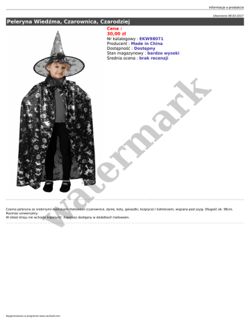 Informacje o produkcie Utworzono 08-03-2017 Peleryna Wiedźma, Czarownica, Czarodziej Cena : 30,00 zł at er m ar k Nr katalogowy : EKW98071 Producent : Made in China Dostępność : Dostępny Stan magazynowy : bardzo wysoki Średnia ocena : brak recenzji w Czarna peleryna ze srebrnymi nadrukami Halloween (czarownice, dynie, koty, gwiazdki, księżyce) i kołnierzem, wiązana pod szyją. Długość ok. 96cm. Rozmiar uniwersalny. W skład stroju nie wchodzi kapelusz! Kapelusz dostępny w dodatkach halloween. Wygenerowano w programie www.oscGold.com