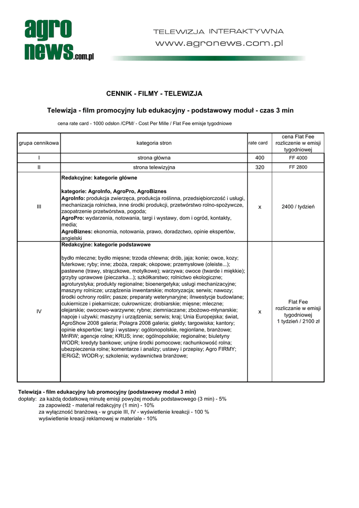 CENNIK - FILMY - TELEWIZJA Telewizja - film promocyjny lub edukacyjny - podstawowy moduł - czas 3 min cena rate card - 1000 odsłon /CPM/ - Cost Per Mille / Flat Fee emisje tygodniowe cena Flat Fee rozliczenie w emisji tygodniowej grupa cennikowa kategoria stron I strona główna 400 FF 4000 II strona telewizyjna 320 FF 2800 x 2400 / tydzień x Flat Fee rozliczanie w emisji tygodniowej 1 tydzień / 2100 zł rate card Redakcyjne: kategorie główne III IV kategorie: AgroInfo, AgroPro, AgroBiznes AgroInfo: produkcja zwierzęca, produkcja roślinna, przedsiębiorczość i usługi, mechanizacja rolnictwa, inne środki produkcji, przetwórstwo rolno-spożywcze, zaopatrzenie przetwórstwa, pogoda; AgroPro: wydarzenia, notowania, targi i wystawy, dom i ogród, kontakty, media; AgroBiznes: ekonomia, notowania, prawo, doradzctwo, opinie ekspertów, angielski Redakcyjne: kategorie podstawowe bydło mleczne; bydło mięsne; trzoda chlewna; drób, jaja; konie; owce, kozy; futerkowe; ryby; inne; zboża, rzepak; okopowe; przemysłowe (oleiste...); pastewne (trawy, strączkowe, motylkowe); warzywa; owoce (twarde i miękkie); grzyby uprawowe (pieczarka...); szkółkarstwo; rolnictwo ekologiczne; agroturystyka; produkty regionalne; bioenergetyka; usługi mechanizacyjne; maszyny rolnicze; urządzenia inwentarskie; motoryzacja; serwis; nawozy; środki ochrony roślin; pasze; preparaty weterynaryjne; iInwestycje budowlane; cukiernicze i piekarnicze; cukrownicze; drobiarskie; mięsne; mleczne; olejarskie; owocowo-warzywne; rybne; ziemniaczane; zbożowo-młynarskie; napoje i używki; maszyny i urządzenia; serwis; kraj; Unia Europejska; świat, AgroShow 2008 galeria; Polagra 2008 galeria; giełdy; targowiska; kantory; opinie ekspertów; targi i wystawy: ogólonopolskie, regionlane, branżowe; MriRW; agencje rolne; KRUS; inne; ogólnopolskie; regionalne; biuletyny WODR; kredyty bankowe; unijne środki pomocowe; rachunkowość rolna; ubezpieczenia rolne; komentarze i analizy; ustawy i przepisy; Agro FIRMY; IERiGŻ; WODR-y; szkolenia; wydawnictwa branżowe; Telewizja - film edukacyjny lub promocyjny (podstawowy moduł 3 min) dopłaty: za każdą dodatkową minutę emisji powyżej modułu podstawowego (3 min) - 5% za zapowiedź - materiał redakcyjny (1 min) - 10% za wyłączność branżową - w grupie III, IV - wyświetlenie kreakcji - 100 % wyświetlenie kreacji reklamowej w materiale - 10%