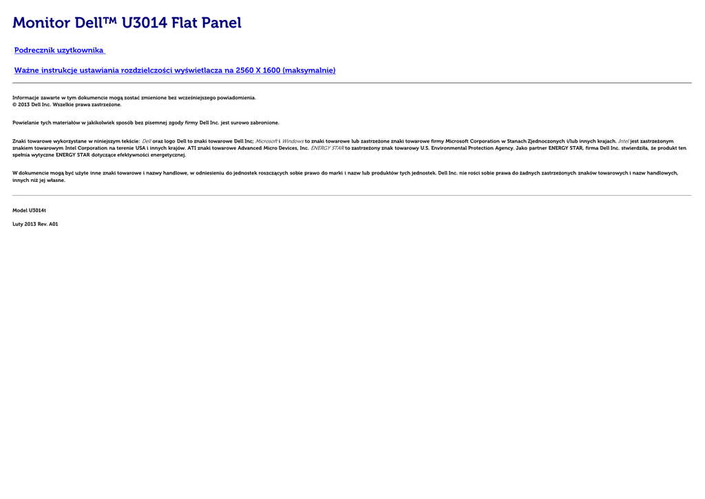 Monitor Dell™ U3014 Flat Panel Podrecznik uzytkownika Ważne instrukcje ustawiania rozdzielczości wyświetlacza na 2560 X 1600 (maksymalnie) Informacje zawarte w tym dokumencie mogą zostać zmienione bez wcześniejszego powiadomienia. © 2013 Dell Inc. Wszelkie prawa zastrzeżone. Powielanie tych materiałów w jakikolwiek sposób bez pisemnej zgody firmy Dell Inc. jest surowo zabronione. Znaki towarowe wykorzystane w niniejszym tekście: Dell oraz logo Dell to znaki towarowe Dell Inc; Microsoft i Windows to znaki towarowe lub zastrzeżone znaki towarowe firmy Microsoft Corporation w Stanach Zjednoczonych i/lub innych krajach. Intel jest zastrzeżonym znakiem towarowym Intel Corporation na terenie USA i innych krajów. ATI znaki towarowe Advanced Micro Devices, Inc. ENERGY STAR to zastrzeżony znak towarowy U.S. Environmental Protection Agency. Jako partner ENERGY STAR, firma Dell Inc. stwierdziła, że produkt ten spełnia wytyczne ENERGY STAR dotyczące efektywności energetycznej. W dokumencie mogą być użyte inne znaki towarowe i nazwy handlowe, w odniesieniu do jednostek roszczących sobie prawo do marki i nazw lub produktów tych jednostek. Dell Inc. nie rości sobie prawa do żadnych zastrzeżonych znaków towarowych i nazw handlowych, innych niż jej własne. Model U3014t Luty 2013 Rev. A01 Przewodnik użytkownika monitora płaskiego Dell™ U3014 Informacje o monitorze Ustawianie monitora Obsługa monitora Wykrywanie i usuwanie usterek Dodatek Uwagi, pouczenia i ostrzeżenia UWAGA: UWAGA oznacza ważną informację, która może pomóc w lepszym wykorzystaniu komputera. OSTRZEŻENIE: OSTRZEŻENIE oznacza potencjalną możliwość uszkodzenia sprzętu lub utratę danych i wskazuje jak uniknąć problemu. PRZESTROGA: PRZESTROGA oznacza potencjalną możliwość uszkodzenia majątku, obrażeń osobistych lub śmierci. Informacje zawarte w tym dokumencie mogą zostać zmienione bez wcześniejszego powiadomienia. © 2013 Dell Inc. Wszelkie prawa zastrzeżone. Powielanie w jakikolwiek sposób bez pisemnej zgody Dell Inc. jest surowo zabronione. Znaki towarowe wykorzystane w niniejszym tekście: Dell oraz logo Dell to znaki towarowe Dell Inc; Microsoft i Windows to znaki towarowe lub zastrzeżone znaki towarowe firmy Microsoft Corporation w Stanach Zjednoczonych i/lub innych krajach. Intel jest zastrzeżonym znakiem towarowym Intel Corporation na terenie USA i innych krajów. ATI znaki towarowe Advanced Micro Devices, Inc. ENERGY STAR to zastrzeżony znak towarowy U.S. Environmental Protection Agency. Jako partner ENERGY STAR, firma Dell Inc. stwierdziła, że produkt ten spełnia wytyczne ENERGY STAR dotyczące efektywności energetycznej. W dokumencie mogą być użyte inne znaki towarowe i nazwy handlowe, w odniesieniu do jednostek roszczących sobie prawo do marki i nazw lub produktów tych jednostek. Dell Inc. nie rości sobie prawa do żadnych zastrzeżonych znaków towarowych i nazw handlowych, innych niż jej własne. Model U3014t Luty 2013 Rev. A01 Powrót do spisu tresci Ustawienia monitora Monitor Dell™ U3014 Flat Panel Ważne instrukcje ustawiania rozdzielczości wyświetlacza na 2560 X 1600 (maksymalnie) W celu optymalnego ustawienia wydajnosci wyswietlacza podczas korzystania z systemów operacyjnych Microsoft Windows®, rozdzielczosc wyswietlacza nalezy ustawic na 2560 X 1600 pikseli, poprzez wykonanie nastepujacych czynnosci: W systemie Windows Vista ® lub Windows® 7 lub Windows® 8 : 1. Dla Windows® 8, wybierz kafelek Pulpit w celu przełączenia na klasyczny pulpit. 2. Kliknij prawym przyciskiem pulpit i kliknij Screen Resolution. 3. Kliknij rozwijaną listę opcji Rozdzielczość ekranu i wybierz 2560 X 1600. 4. Kliknij OK Jeśli nie wyświetla się zalecana rozdzielczość, może okazać się konieczna aktualizacja sterownika grafiki. Wybierz ten z poniższych scenariuszy, który najlepiej opisuje używany komputer i wykonaj podane zalecenia: UWAGA: Po podłączeniu tabletu lub odtwarzacza DVD/Blu-Ray, maksymalna rozdzielczość wyjścia może być ograniczona do 1920 x 1080. W tym przypadku, jeśli wymagane jest ustawienie oryginalnej rozdzielczości tabletu należy przełączyć ustawienie wideo monitora OSD na 1:1 (Na bokach ekranu mogą być wyświetlane czarne pasy). UWAGA: W zależności od posiadanej karty graficznej, połączenia z użyciem HDMI, mogą obsługiwać jedynie rozdzielczość do 2560 X 1600. 1: Jesli posiadasz komputer Dell™ typu desktop lub przenosny komputer Dell™ z dostepem do Internetu. 2: Jesli posiadasz komputer typu desktop, komputer przenosny lub karte graficzna, innej marki niz Dell™. Powrót do spisu tresci Powrót do spisu treści Informacje o monitorze Przewodnik użytkownika monitora płaskiego Dell™ U3014 Zawartość opakowania Cechy produktu Identyfikacja części i elementów sterowania Specyfikacje monitora Możliwości Plug and Play Interfejs USB (Universal Serial Bus [Uniwersalna magistrala szeregowa]) Dane techniczne czytnika kart Jakość monitora LCD i zasady dotyczące pikseli Wskazówki konserwacji Zawartość opakowania Monitor jest dostarczany z następującymi, pokazanymi poniżej komponentami. Upewnij się, że otrzymane zostały wszystkie komponenty i skontaktuj się z firmą Dell , jeśli czegokolwiek brakuje. UWAGA: Niektóre elementy mogą być opcjonalne i mogą nie być dostarczone z monitorem. Niektóre funkcje i nośniki mogą być niedostępne w niektórych krajach. UWAGA: Aby zainstalować inne podstawa, prosimy zwrócić się do odpowiedniej instrukcji konfiguracji stoiska instrukcje dotyczące instalowania. Monitor Podstawa Kabel zasilania (zależy od kraju) Kabel DisplayPort (Mini DP do DP) Kabel DVI-DL (Dual Link) Kabel przesyłania danych USB 3.0 (udostępnia porty USB monitora) Przewiązka kabli na rzep Nośnik Sterowniki i dokumentacja Instrukcja szybkiej instalacji Informacje dotyczące bezpieczeństwa Raport kalibracji fabrycznej Cechy produktu Monitor płaskoekranowy U3014 posiad