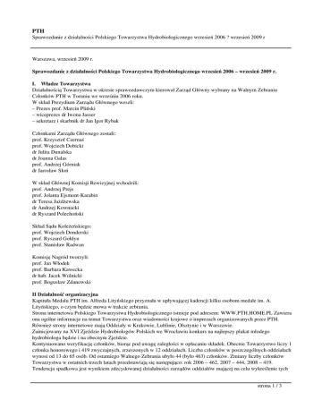 PTH Sprawozdanie z działalności Polskiego Towarzystwa Hydrobiologicznego wrzesień 2006 ? wrzesień 2009 r Warszawa, wrzesień 2009 r. Sprawozdanie z działalności Polskiego Towarzystwa Hydrobiologicznego wrzesień 2006 – wrzesień 2009 r. I. Władze Towarzystwa Działalnością Towarzystwa w okresie sprawozdawczym kierował Zarząd Główny wybrany na Walnym Zebraniu Członków PTH w Toruniu we wrześniu 2006 roku. W skład Prezydium Zarządu Głównego weszli: – Prezes prof. Marcin Pliński – wiceprezes dr Iwona Jasser – sekretarz i skarbnik dr Jan Igor Rybak Członkami Zarządu Głównego zostali: prof. Krzysztof Czernaś prof. Wojciech Dobicki dr Julita Dunalska dr Joanna Galas prof. Andrzej Górniak dr Jarosław Słoń W skład Głównej Komisji Rewizyjnej wchodzili: prof. Andrzej Prejs prof. Jolanta Ejsmont-Karabin dr Teresa Jażdżewska dr Andrzej Kownacki dr Ryszard Polechoński Skład Sądu Koleżeńskiego: prof. Wojciech Donderski prof. Ryszard Gołdyn prof. Stanisław Radwan Komisję Nagród tworzyli: prof. Jan Włodek prof. Barbara Kawecka dr hab. Jacek Wolnicki prof. Bogusław Zdanowski II Działalność organizacyjna Kapituła Medalu PTH im. Alfreda Lityńskiego przyznała w upływającej kadencji kilku osobom medale im. A. Lityńskiego, o czym będzie mowa w trakcie zebrania. Strona internetowa Polskiego Towarzystwa Hydrobiologicznego istnieje pod adresem: WWW.PTH.HOME.PL Zawiera ona ogólne informacje na temat Towarzystwa oraz wiadomości krajowe o imprezach organizowanych przez PTH. Również strony internetowe mają Oddziały w Krakowie, Lublinie, Olsztynie i w Warszawie. Zainicjowany na XVI Zjeździe Hydrobiologów Polskich we Wrocławiu konkurs na najlepszy plakat młodego hydrobiologa będzie i na obecnym Zjeździe. Kontynuowano weryfikację członków, biorąc pod uwagę zaległości w opłacaniu składek. Obecnie Towarzystwo liczy 1 członka honorowego i 419 zwyczajnych, zrzeszonych w 12 oddziałach. Liczba członków w poszczególnych oddziałach wynosi od 13 do 65 osób. Od ostatniego Walnego Zebrania ubyło 44 (było 463) członków. Zmiany liczby członków Towarzystwa w ostatnich trzech latach przedstawiają się następująco: rok 2006 – 462, 2007 – 444, 2008 – 419. Tendencja spadkowa jest wynikiem zdecydowanej działalności zarządów oddziałów mającej na celu wykreślenie tych strona 1 / 3 PTH Sprawozdanie z działalności Polskiego Towarzystwa Hydrobiologicznego wrzesień 2006 ? wrzesień 2009 r osób, które nierzadko od wielu lat nie płaciły składek członkowskich i nie brały udziału w życiu naszego stowarzyszenia. Podobną weryfikację przeprowadzono wśród polskich członków SIL. Obecnie do SIL poprzez PTH należy 19 osób (ubyło 14) i 2 członków zbiorowych (status członka zespołowego). W okresie sprawozdawczym Zarząd Główny odbył 6 posiedzeń. III Działalność wydawnicza Kontynuowano wydawanie biuletynu PTH „Wiadomości Hydrobiologiczne” jako jeden z działów kwartalnika „Wiadomości Ekologiczne” pod redakcją dr hab. Eligiusza Pieczyńskiego i dr Jana Igora Rybaka. W biuletynie drukowane są wiadomości o zjazdach, sympozjach, konferencjach hydrobiologicznych, relacje z naukowych wyjazdów zagranicznych oraz wspomnienia o tych, którzy odeszli. Z powodu bardzo poważnych trudności finansowych Towarzystwa, Biuletyn nie jest już rozprowadzany wśród członków Towarzystwa. W tej sytuacji, za zgodą redakcji Biuletynu, Wiadomości Hydrobiologiczne są zamieszczane na stronie internetowej Towarzystwa. Właśnie minęło 46 lat od ukazania się pierwszego numeru naszego biuletynu. Ostatnio ukazał się 186 numer. Towarzystwo wydaje wspólnie z Uniwersytetem Łódzkim serię wydawniczą „Fauna Słodkowodna Polski”. W skład Rady Redakcyjnej wchodzą: prof. Krzysztof Jażdżewski (przewodniczący), prof. Anna Stańczykowska (wiceprzewodnicząca), prof. Andrzej Giziński, dr Krzysztof Kasprzak, dr Andrzej Kownacki. Redagują: prof. Andrzej Piechocki (redaktor naczelny), dr Jan Igor Rybak (zastępca redaktora naczelnego) i prof. Wojciech Jurasz (sekretarz). Siedzibą Redakcji jest Katedra Zoologii Bezkręgowców i Hydrobiologii Uniwersytetu Łódzkiego. Ukazał się tom 11 część B. FSP prof. Stefana Niesiołowskiego 2005. Muchówki (Diptera) Wujkowate (Empididae: Hemerodromiinae, Clinocerinae), 206 s. Tom 32 cześć A i B serii FSP "Wrotki (Rotifera)", przy współpracy prof. Henri Dumota ukaże się w najbliższym czasie w Belgii w języku angielskim. W przygotowaniu redakcyjnym jest tom 34, część 1. „Przywry” prof. Katarzyny Niewiadomskiej. Ukazały się również trzy tomy zawierające publikacje referatów wygłaszanych na konferencjach, których organizatorami lub współorganizatorami było Towarzystwo. Również działalnością wydawniczą można nazwać utworzenie na stronie internetowej Towarzystwa spisu hydrobiologów polskich on-line – „Directory of Polish Hydrobiologists” IV Inna działalność merytoryczna Aktywnie działa Sekcja Bentologiczna. W latach 2006-2009 członkowie sekcji zorganizowali Ogólnopolskie Warsztaty Bentologiczne, kolejno: XIII w Ochotnicy: „Zastosowanie hydrologii w badaniach biologicznych wód płynących”, XIV w Opolu-Turawie: „Hydromorfologiczna ocena ekosystemów wodnych” i XV w Zwierzyńcu: „Bentos strumieni i rzek” . Polskie Towarzystwo Hydrobiologiczne przyznaje nagrody im. prof. M. Gieysztora wyróżniającym się pracom magisterskim z zakresu szeroko pojętej hydrobiologii. W kadencji 2006-2009 przyznano 8 nagród i 1 wyróżnienie. Wielu członków naszego Towarzystwa wchodzi w skład Rad Naukowo-Społecznych przy Dyrekcjach Parków Krajobrazowych, Wojewódzkich Komitetów Ochrony Przyrody, niektóre osoby są członkami Rad Naukowych Parków Narodowych (np. Słowińskiego, Tatrzańskiego, Narwiańskiego, Poleskiego, Wigierskiego). PTH jest członkiem European Federation for Freshwater Sciences. PTH reprezentują dr Iwona Jasser i 