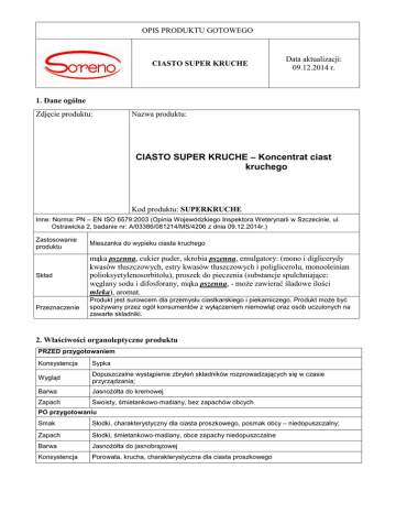 OPIS PRODUKTU GOTOWEGO CIASTO SUPER KRUCHE Data aktualizacji: 09.12.2014 r. 1. Dane ogólne Zdjęcie produktu: Nazwa produktu: CIASTO SUPER KRUCHE – Koncentrat ciast kruchego Kod produktu: SUPERKRUCHE Inne: Norma: PN – EN ISO 6579:2003 (Opinia Wojewódzkiego Inspektora Weterynarii w Szczecinie, ul. Ostrawicka 2, badanie nr: A/03386/081214/MS/4206 z dnia 09.12.2014r.) Zastosowanie produktu Mieszanka do wypieku ciasta kruchego Skład mąka pszenna, cukier puder, skrobia pszenna, emulgatory: (mono i diglicerydy kwasów tłuszczowych, estry kwasów tłuszczowych i poliglicerolu, monooleinian polioksyetylenosorbitolu), proszek do pieczenia (substancje spulchniające: węglany sodu i difosforany, mąka pszenna, - może zawierać śladowe ilości mleka), aromat. Przeznaczenie Produkt jest surowcem dla przemysłu ciastkarskiego i piekarniczego. Produkt może być spożywany przez ogół konsumentów z wyłączeniem niemowląt oraz osób uczulonych na zawarte składniki. 2. Właściwości organoleptyczne produktu PRZED przygotowaniem Konsystencja Sypka Wygląd Dopuszczalne wystąpienie zbryleń składników rozprowadzających się w czasie przyrządzania; Barwa Jasnożółta do kremowej Zapach Swoisty, śmietankowo-maślany, bez zapachów obcych PO przygotowaniu Smak Słodki, charakterystyczny dla ciasta proszkowego, posmak obcy – niedopuszczalny; Zapach Słodki, śmietankowo-maślany, obce zapachy niedopuszczalne Barwa Jasnożółta do jasnobrązowej Konsystencja Porowata, krucha, charakterystyczna dla ciasta proszkowego 3. Właściwości fizykochemiczne produktu Ołów nie więcej niż 0,30 mg/kg Obecność metali szkodliwych dla zdrowia Kadm nie więcej niż 0,10 mg/kg Rtęć nie więcej niż 0,02 mg/kg Arsen nie więcej niż 0,20 mg/kg Obecność zanieczyszczeń Niedopuszczalna 4. Właściwości mikrobiologiczne produktu Ogólna liczba drobnoustrojów w 1g Gronkowce chorobotwórcze w 0,1g Pałeczki Salmonella w 25g 5 Nie więcej niż: 2 x 10 Nieobecne Nieobecne 5. Opakowanie produktu Rodzaj opakowania Masa netto w opakowaniu Paletyzacja Worek papierowy z warstwą folii 20 kg 30 x 20 kg Opakowania, które mają bezpośrednią styczność z produktami są przeznaczone do bezpośredniego kontaktu z żywnością. 6. Przechowywanie produktu Warunki przechowywania Opakowania zamknięte (zszyte), szczelne, zabezpieczone przed dostępem wilgoci, powietrza i światła, w pomieszczeniach suchych, czystych i chłodnych, wolnych od szkodników. Okres przechowywania 8 miesięcy od daty produkcji 7. Oznakowanie produktu Na etykiecie powinny znaleźć się następujące informacje: - nazwa produktu, - nazwa i adres producenta, - skład, - przeznaczenie - zawartość netto, - przepis przygotowania - data ważności, - oznaczenie partii produkcyjnej - sposób i warunki przechowywania 8. Transport Odbywa się za pomocą transportu środków spożywczych, w warunkach zapewniających właściwe utrzymanie jakości produktu. 9. Oświadczenie GMO Niniejszym oświadczamy, że nie podlega modyfikacją genetycznym oraz nie zawiera składników genetycznie modyfikowanych. 10. Składniki alergenne produktu Deklaracja o obecności składników alergennych Dyrektywa Komisji 2000/13/WE z późniejszymi zmianami Produkt / surowiec zawiera Lp. Nazwa składnika Objaśnienie / komentarz TAK NIE Zboża zawierające gluten (tj. pszenica, żyto, jęczmień, owies zwyczajny, pszenica oplewiona / 1. X orkisz, kamut lub ich szczepy hybrydowe) i produkty pochodne 2. Skorupiaki i produkty pochodne X 3. Jaja i produkty pochodne X 4. Ryby i produkty pochodne X Orzeszki ziemne / orzeszki arachidowe i produkty pochodne 6. Nasiona soi i produkty pochodne 5. 7. Mleko i z laktozą) produkty pochodne (łącznie X X X Orzechy, tj. migdał, orzech laskowy, orzech włoski, 8. nerkowiec, orzech pekan, orzech brazylijski, pistacja, orzech pistacjowy, orzech makdamia. X 9. Seler i produkty pochodne X 10. Gorczyca i produkty pochodne X 11. Nasiona sezamu i produkty pochodne X 12. Dwutlenek siarki i siarczyny w stężeniach powyżej 10 mg/kg lub 10 mg/l w przeliczeniu na SO2 X 13. Łubin i produkty pochodne X 14. Mięczaki i produkty pochodne X Może zawierać śladowe ilości: jaj, soi, orzechów, sezamu i łubinu 11. Wartość energetyczna i odżywcza produktu Wartość energetyczna Tłuszcze W tym kwasy tłuszczowe nasycone Białko 370 kcal / 1535 kJ 1,5 g 0,9 g 3,7 g Wartości obliczone na podstawie deklaracji dostawców i tabel wartości odżywczych IŻIŻ. Wartości te podlegają biologicznym Węglowodany W tym cukier 75,0 g 37,3 g Błonnik 2,4 g Sód 0,4 g i produkcyjno – technicznym naturalnym wahaniom. Dokument został przygotowany w wersji elektronicznej i jest ważny bez podpisu. Informacje zawarte w dokumencie zostały opracowane na podstawie danych uzyskanych od naszych dostawców; naszej wiedzy i doświadczeniu oraz obowiązujących przepisach prawa. Wszystkie dane są aktualne w chwili obecnej, jednak dane te mogą ulec zmianie w zależności od właściwości surowców użytych w produkcji. Niniejszy dokument ma charakter informacyjny.