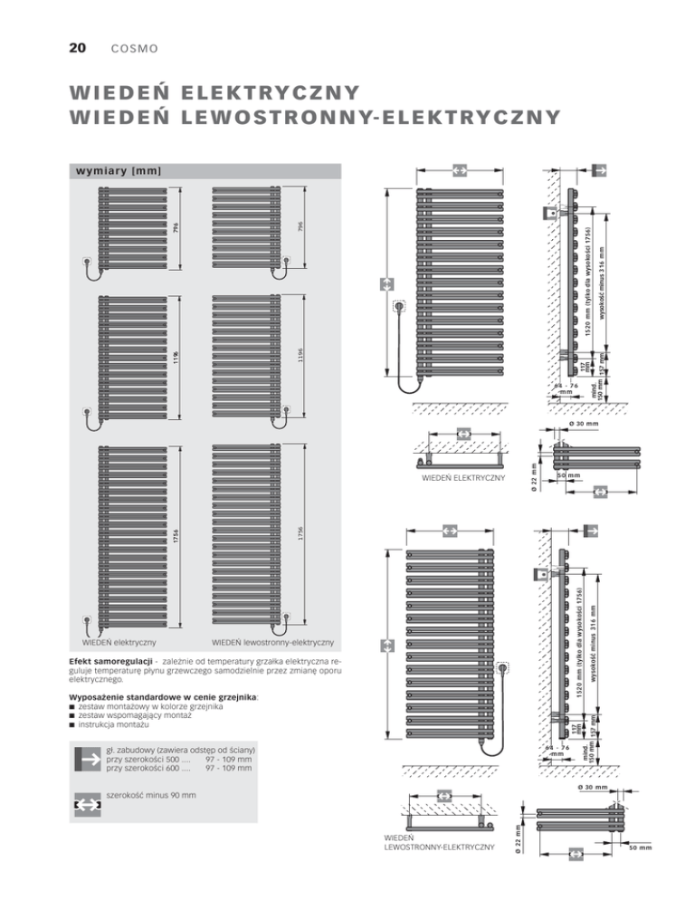20 COSMO W I E D E Ń E L E K T RY C Z N Y W I E D E Ń L E W O S T R O N N Y- E L E K T RY C Z N Y wysokość minus 316 mm 1520 mm (tylko dla wysokości 1756) 796 1196 117 mm mind. 150 mm 157 mm 796 1196 w ym i a r y [m m ] 64 - 76 mm Ø 22 mm Ø 30 m m Efekt samoregulacji - zależnie od temperatury grzałka elektryczna reguluje temperaturę płynu grzewczego samodzielnie przez zmianę oporu elektrycznego. Wyposażenie standardowe w cenie grzejnika: ■ zestaw montażowy w kolorze grzejnika ■ zestaw wspomagający montaż ■ instrukcja montażu 64 - 76 mm gł. zabudowy (zawiera odstęp od ściany) przy szerokości 500 .... 97 - 109 mm przy szerokości 600 .... 97 - 109 mm wysokość minus 3 16 m m 15 20 mm (tylko dla wysokości 1756) WIEDEŃ lewostronny-elektryczny 117 mm mind. 150 mm 157 mm 1756 WIEDEŃ elektryczny 50 m m 1756 WIEDEŃ ELEKTRYCZNY Ø 30 mm WIEDEŃ LEWOSTRONNY-ELEKTRYCZNY Ø 22 mm szerokość minus 90 mm 50 mm