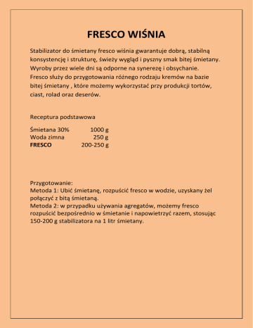 FRESCO WIŚNIA Stabilizator do śmietany fresco wiśnia gwarantuje dobrą, stabilną konsystencję i strukturę, świeży wygląd i pyszny smak bitej śmietany. Wyroby przez wiele dni są odporne na synerezę i obsychanie. Fresco służy do przygotowania różnego rodzaju kremów na bazie bitej śmietany , które możemy wykorzystać przy produkcji tortów, ciast, rolad oraz deserów. Receptura podstawowa Śmietana 30% Woda zimna FRESCO 1000 g 250 g 200-250 g Przygotowanie: Metoda 1: Ubić śmietanę, rozpuścić fresco w wodzie, uzyskany żel połączyć z bitą śmietaną. Metoda 2: w przypadku używania agregatów, możemy fresco rozpuścić bezpośrednio w śmietanie i napowietrzyć razem, stosując 150-200 g stabilizatora na 1 litr śmietany.